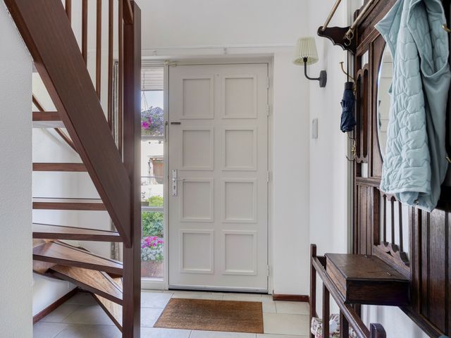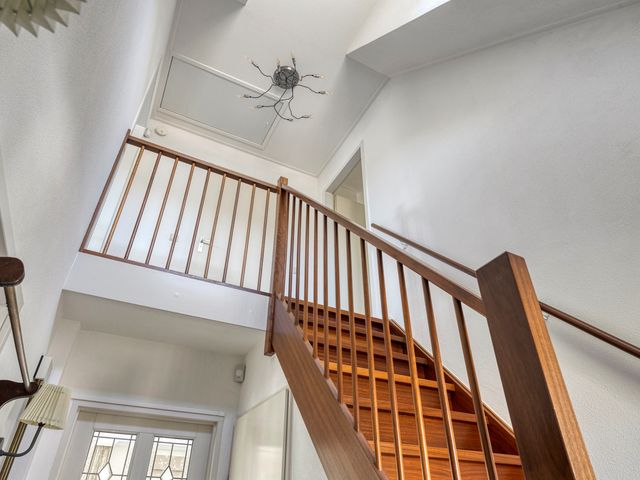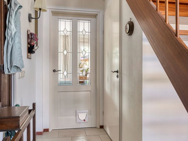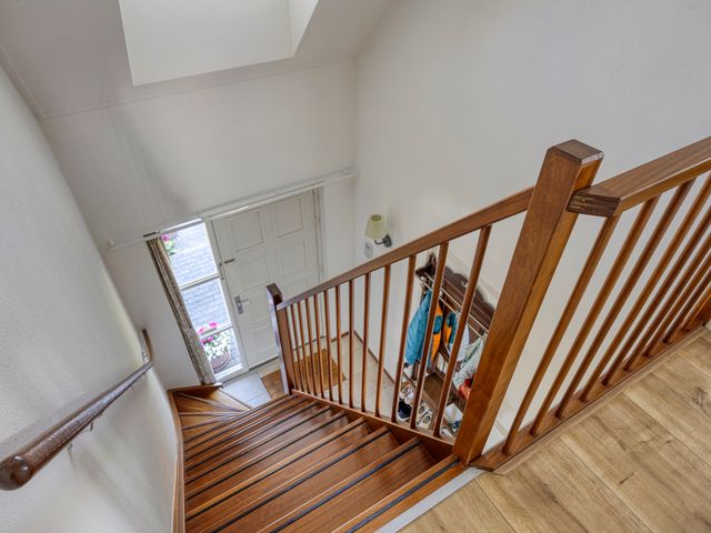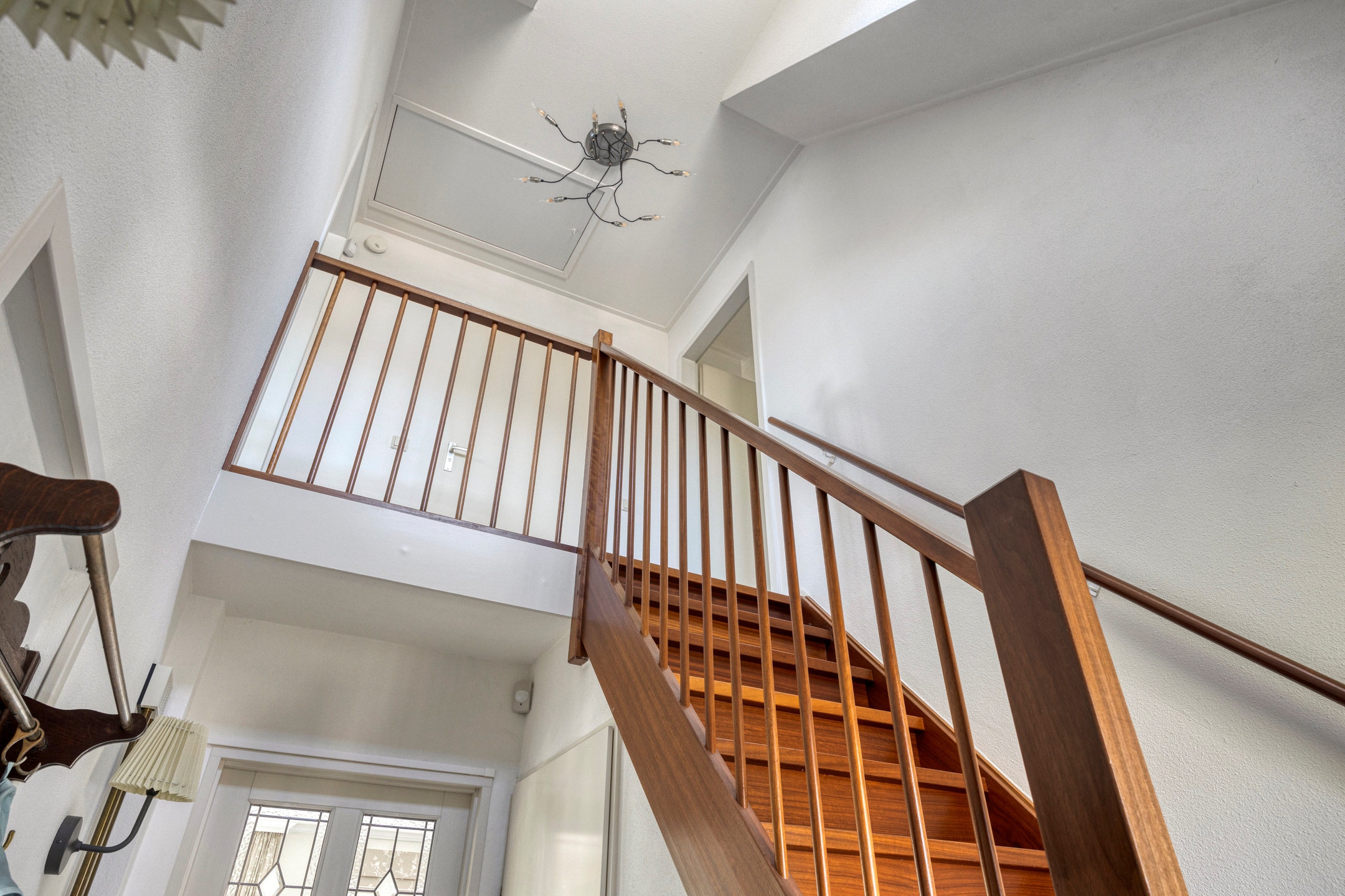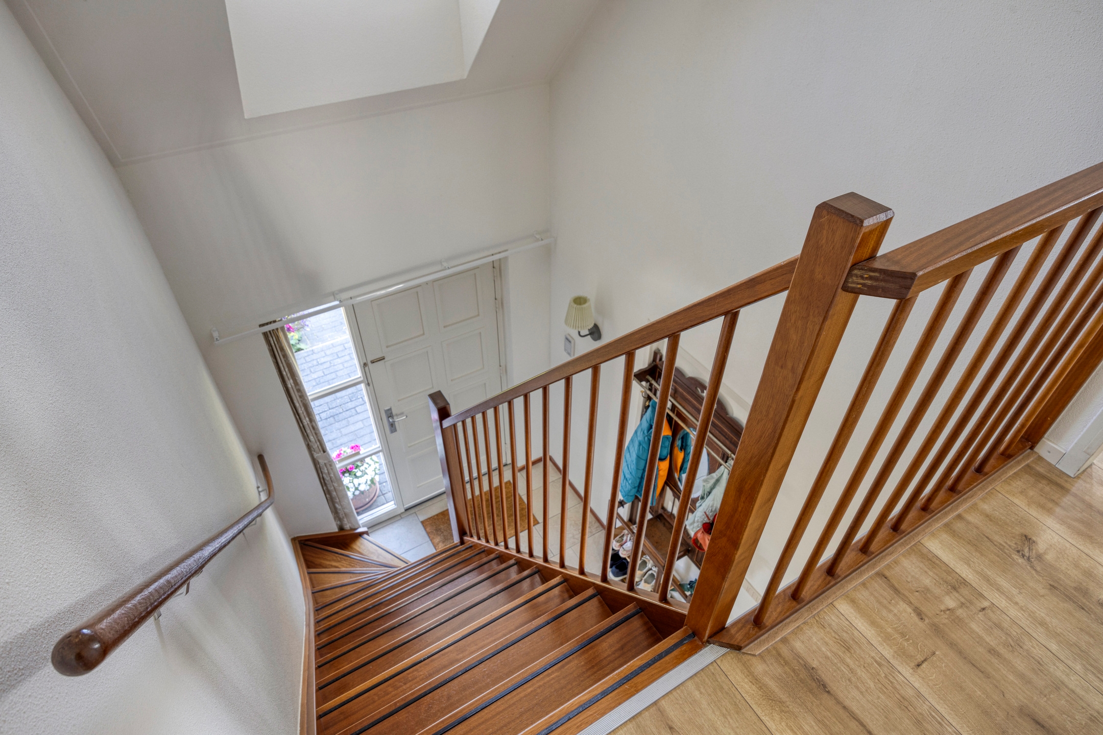 De hal oogt extra ruimtelijk dankzij de vide en wordt gekenmerkt door een fraaie houten trap die naar de eerste verdieping leidt. Vanuit de hal zijn zowel de woonkamer als het toilet toegankelijk.