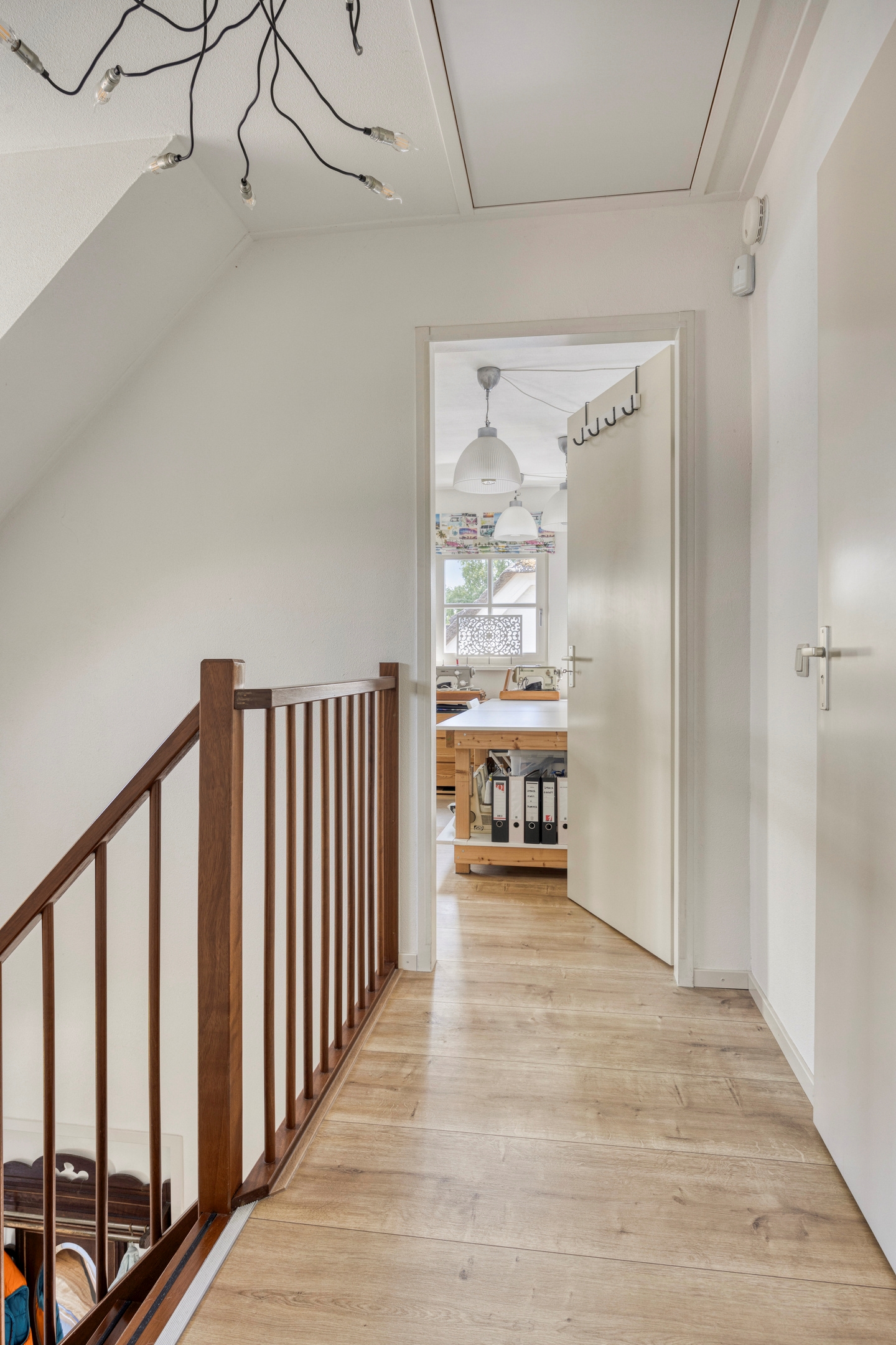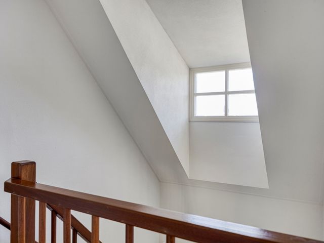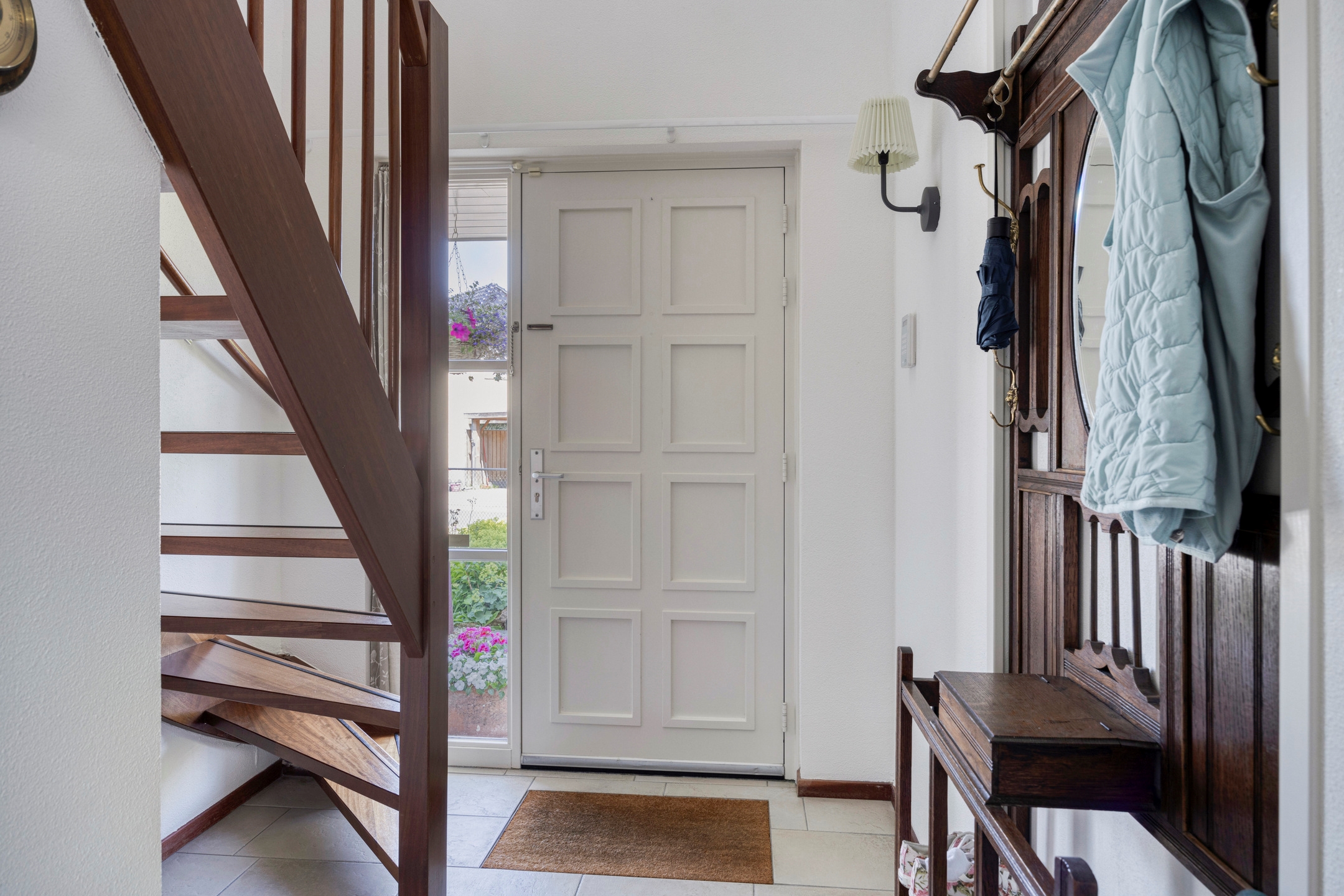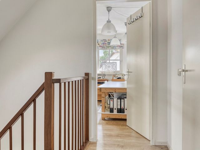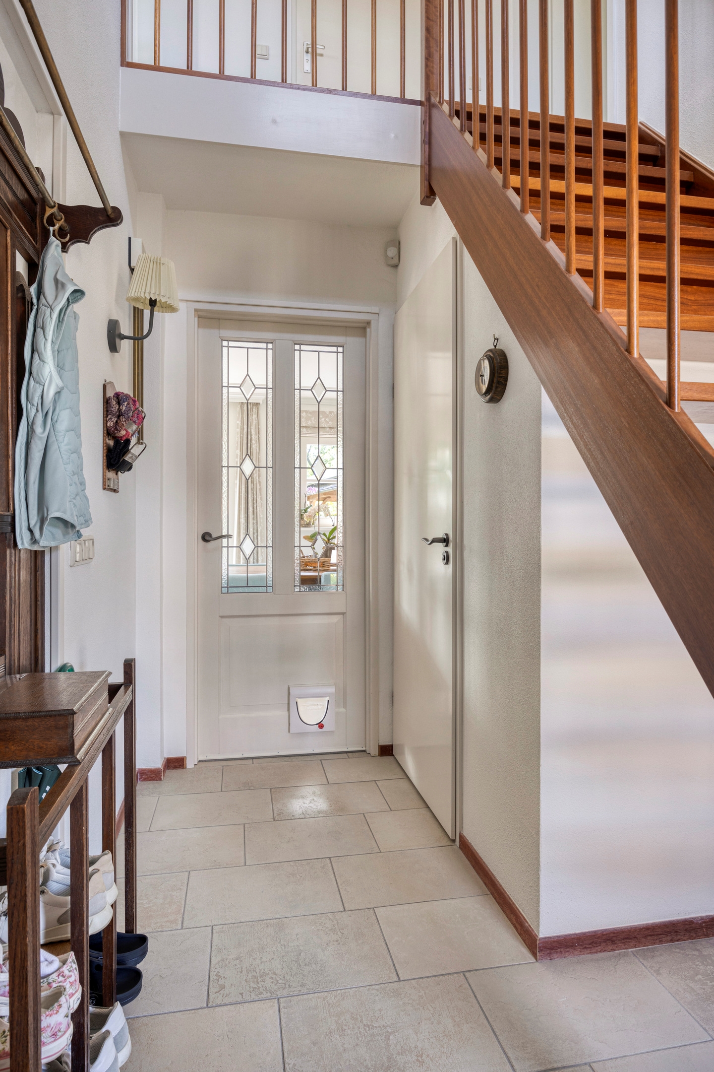 De hal oogt extra ruimtelijk dankzij de vide en wordt gekenmerkt door een fraaie houten trap die naar de eerste verdieping leidt. Vanuit de hal zijn zowel de woonkamer als het toilet toegankelijk.