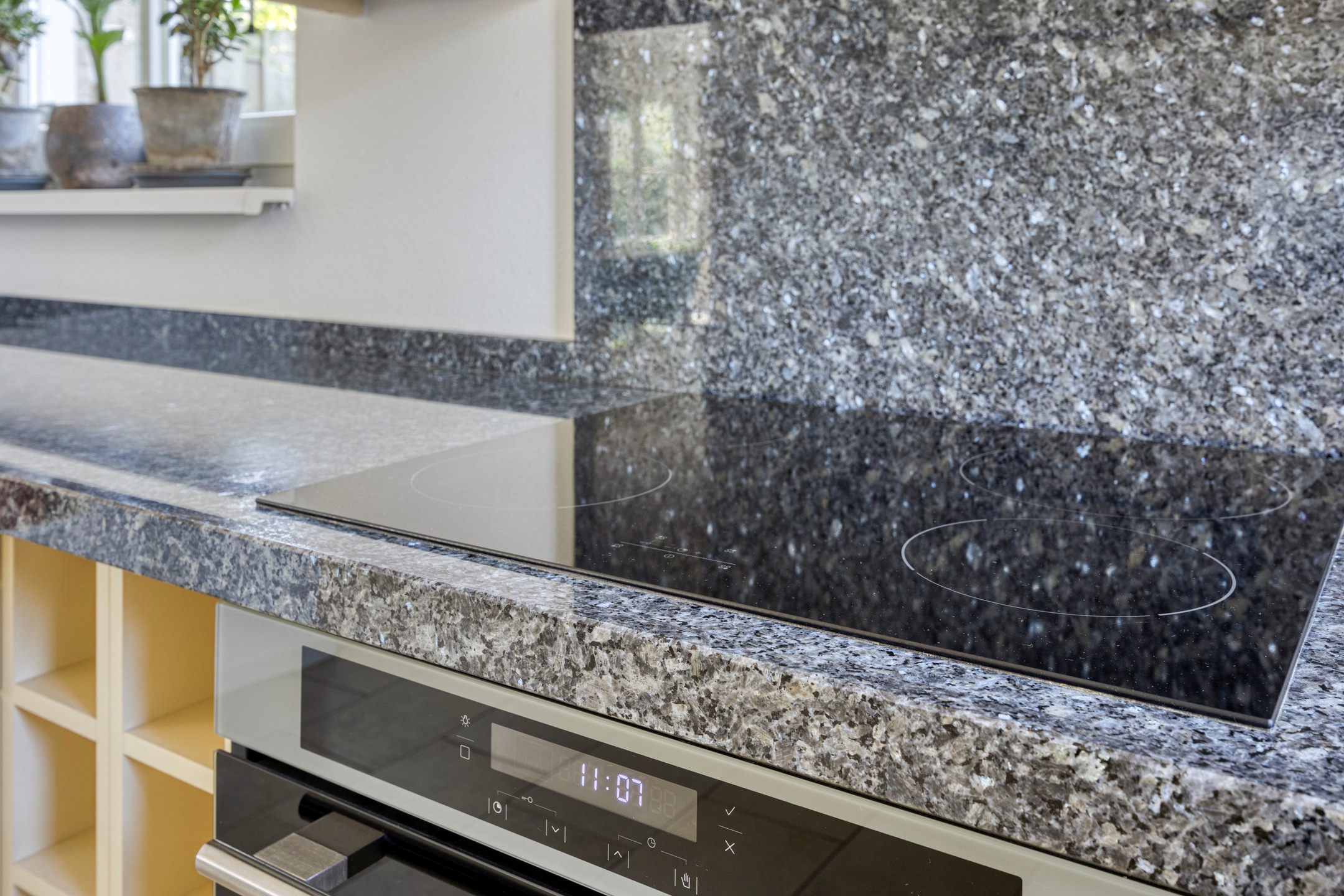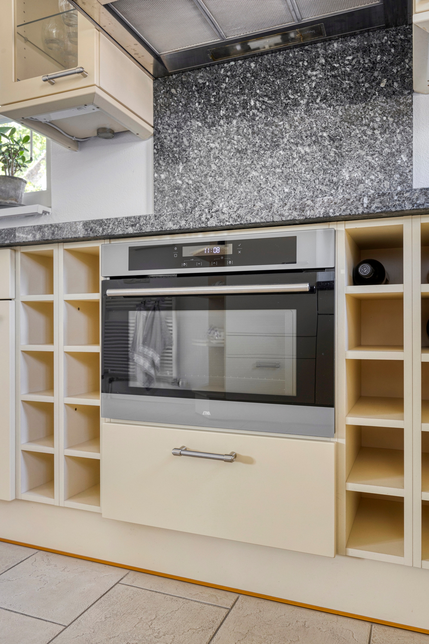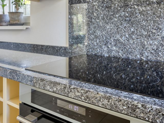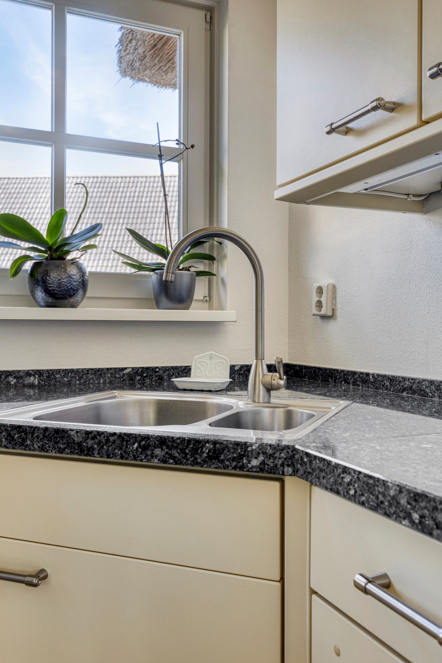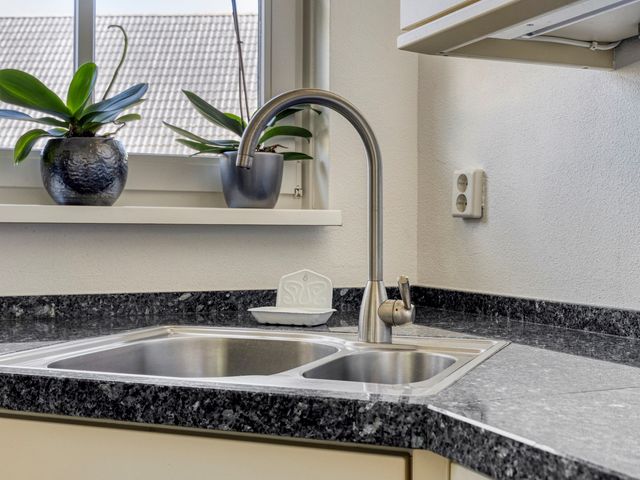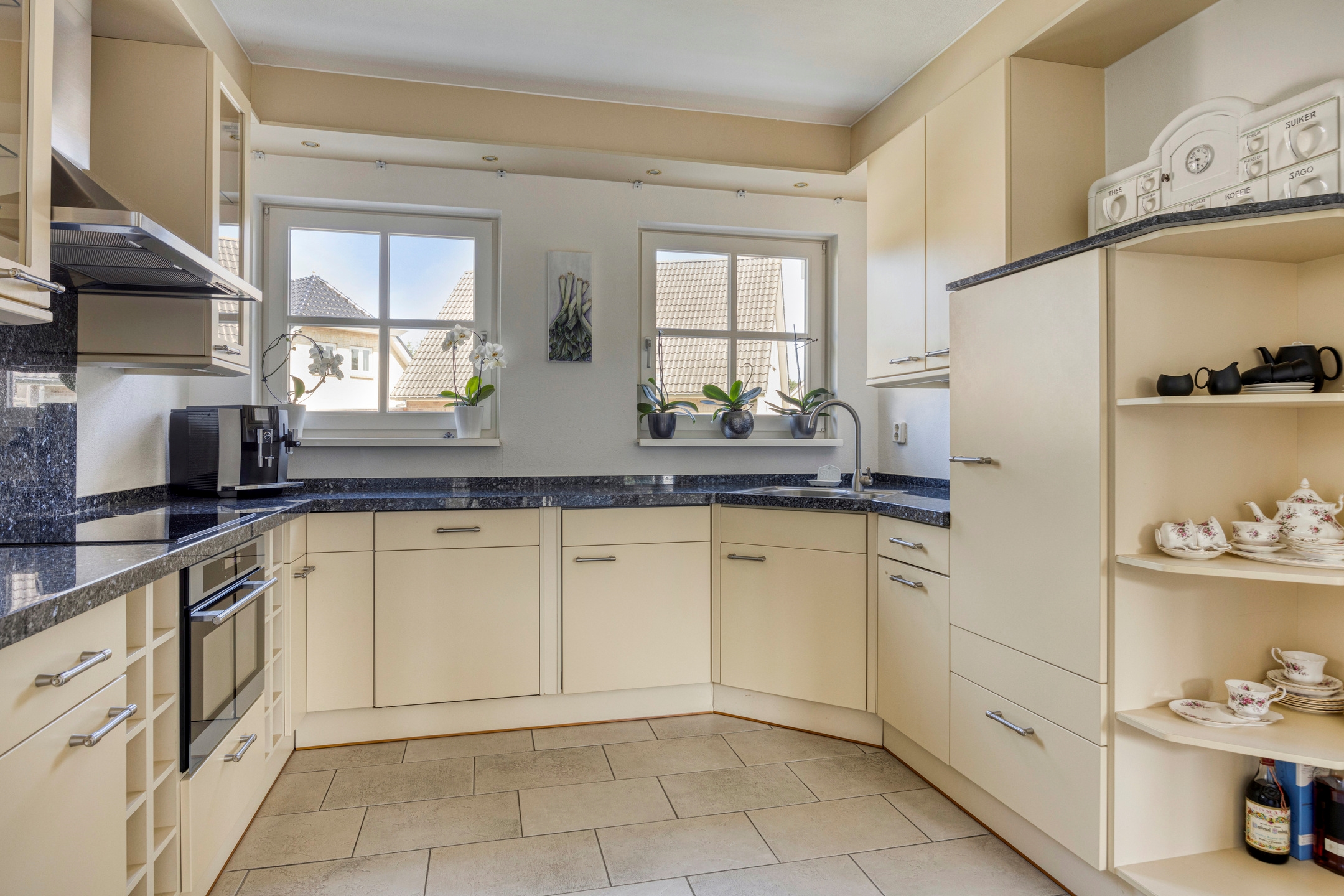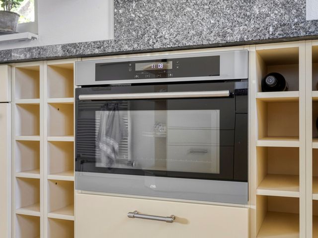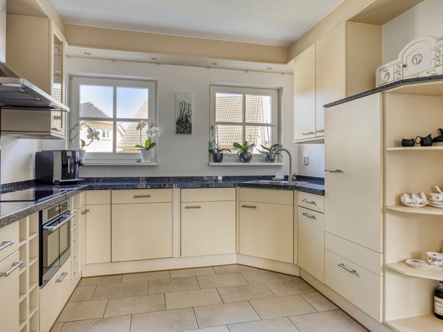 De gesloten keuken heeft een U-vormige opstelling. De inrichting bestaat uit een inductiekookplaat, granieten keukenblad, rvs afzuigkap en spoelbak, vaatwasser, combi-oven en een koelkast. De ingebouwde spots zorgen voor extra licht.