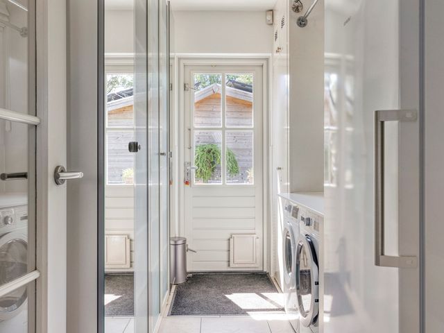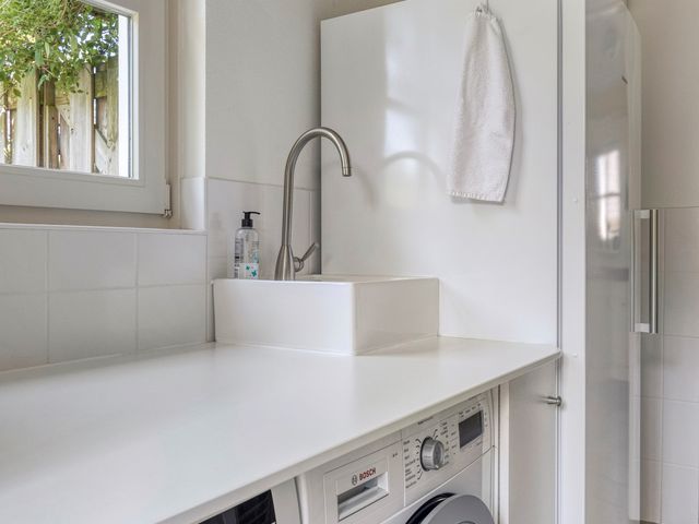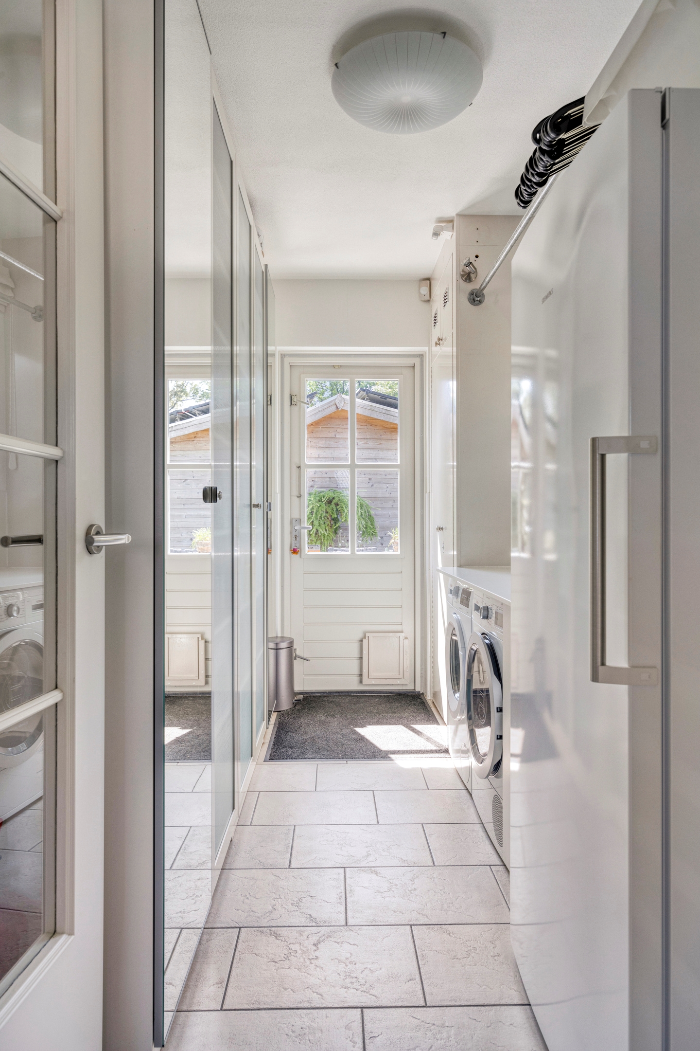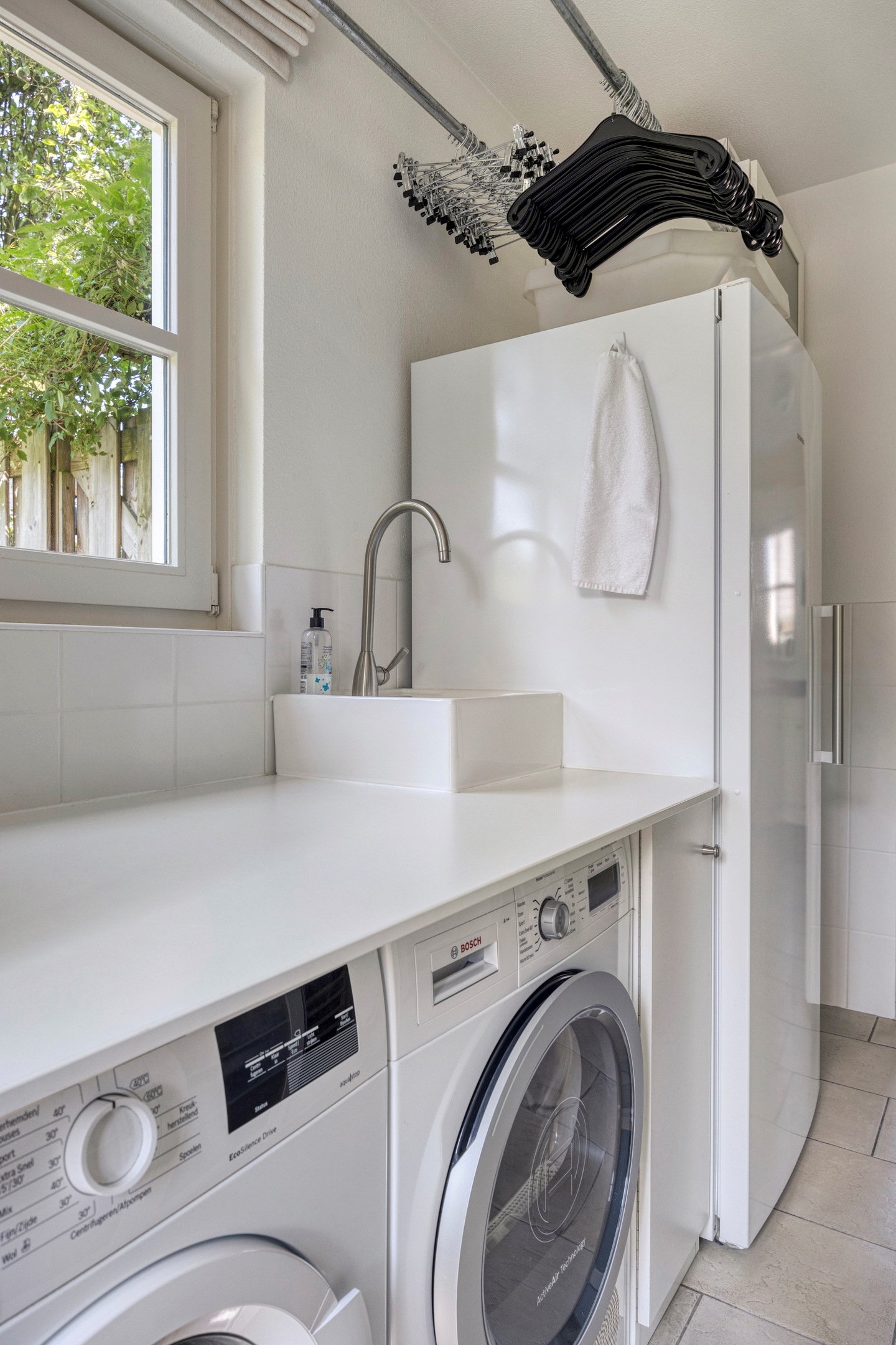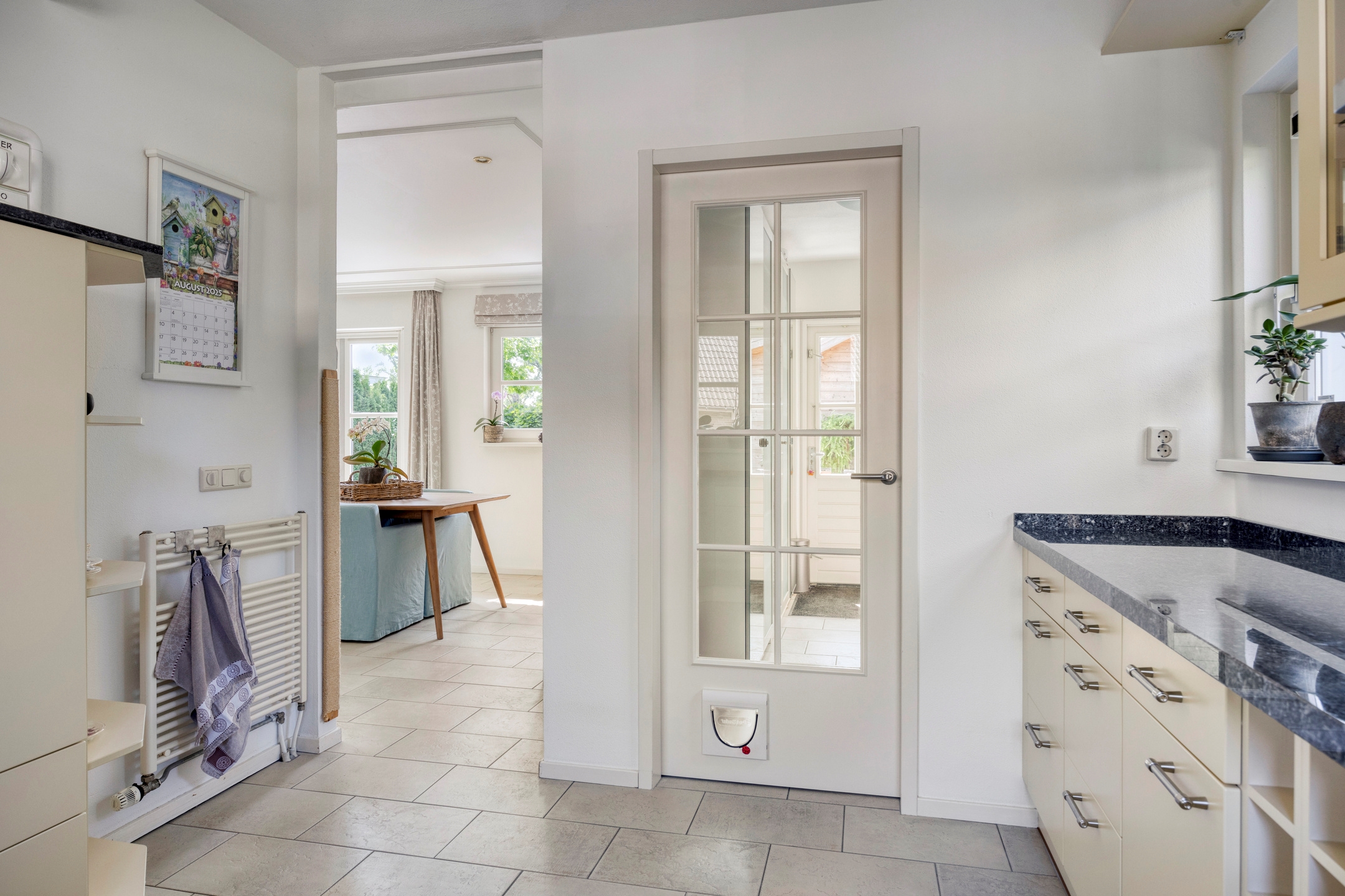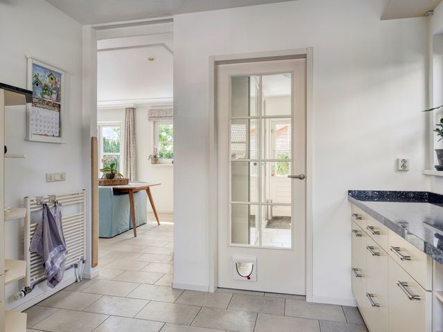 Via de keuken is tevens de bijkeuken te bereiken. Hier is plaats voor een koelkast en deze ruimte beschikt over een wasmachine-/drogeraansluiting. De c.v.-installatie is netjes weggewerkt en de vaste kast biedt extra opbergruimte.