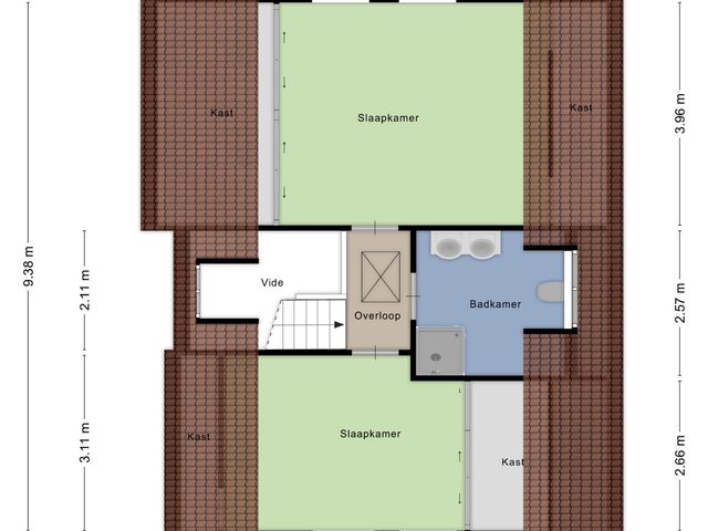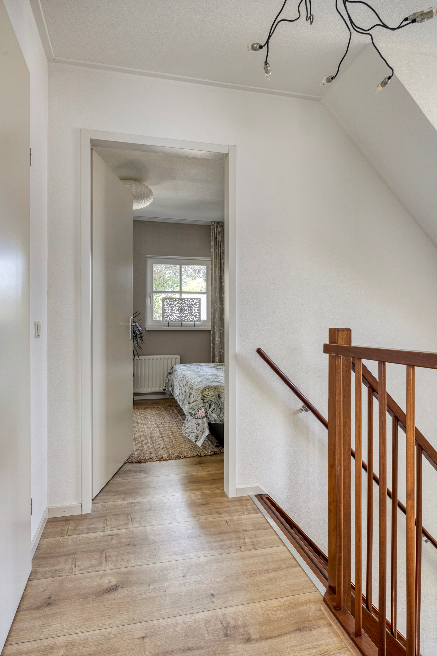 Deze is vanuit de ontvangsthal te bereiken met een vaste trap naar de vide. De verdieping is voorzien van 2 volledige slaapkamers en een nette badkamer.