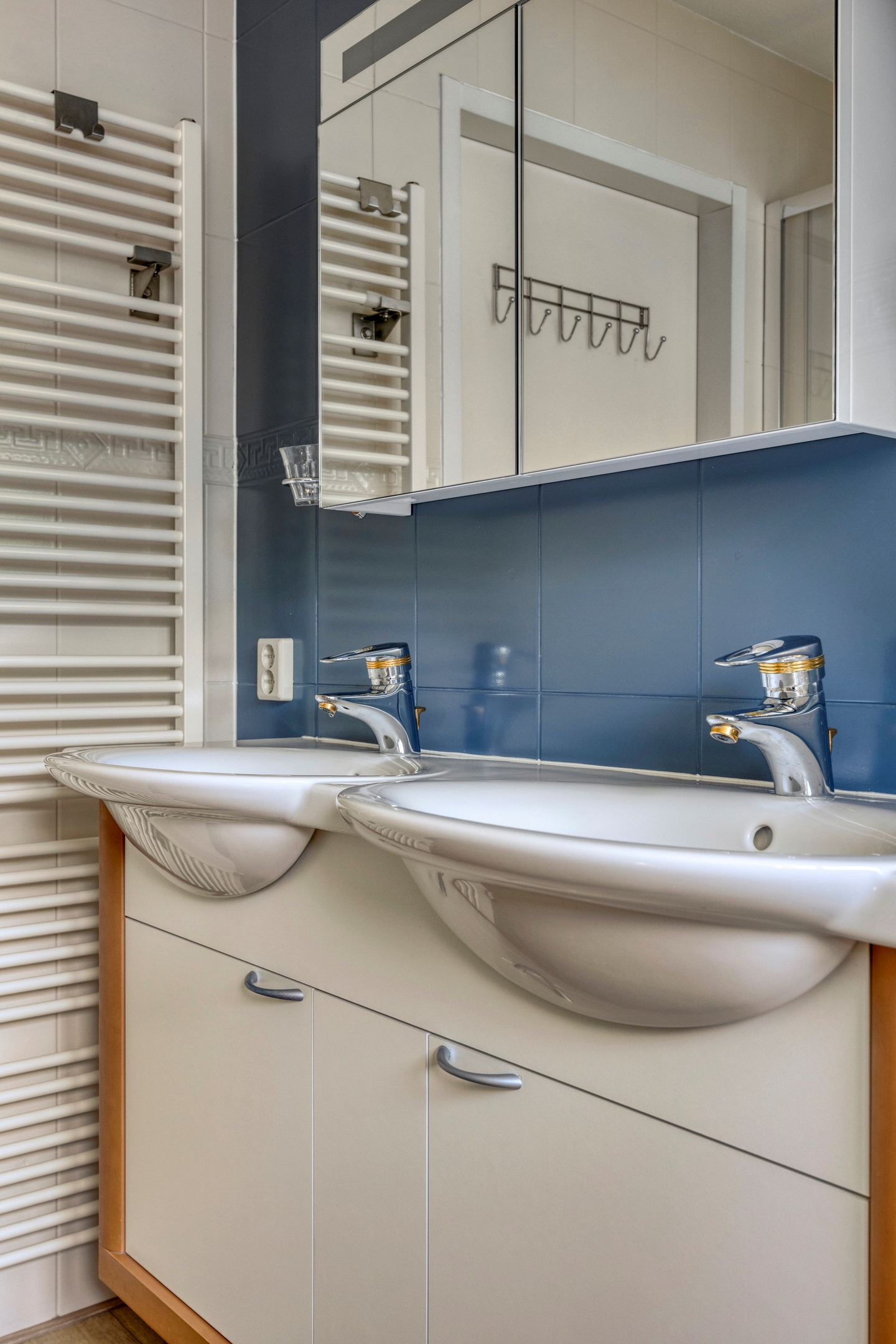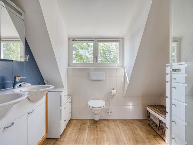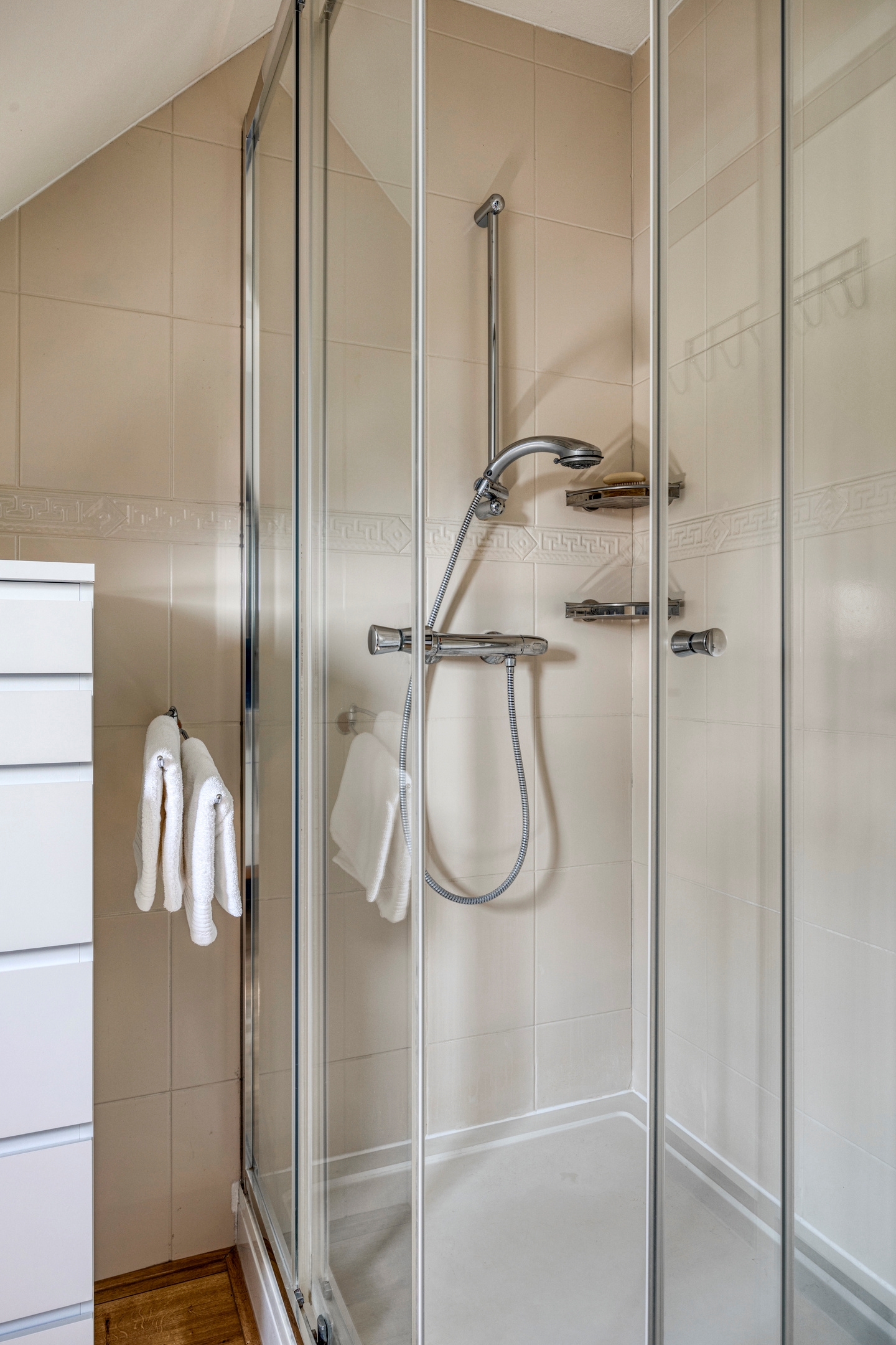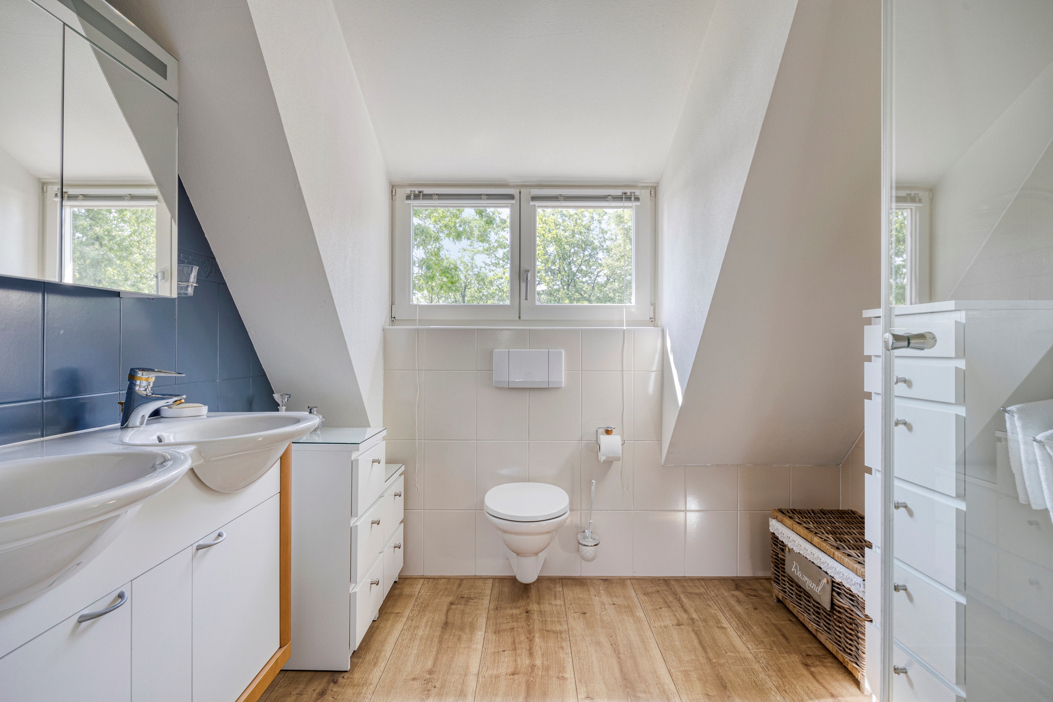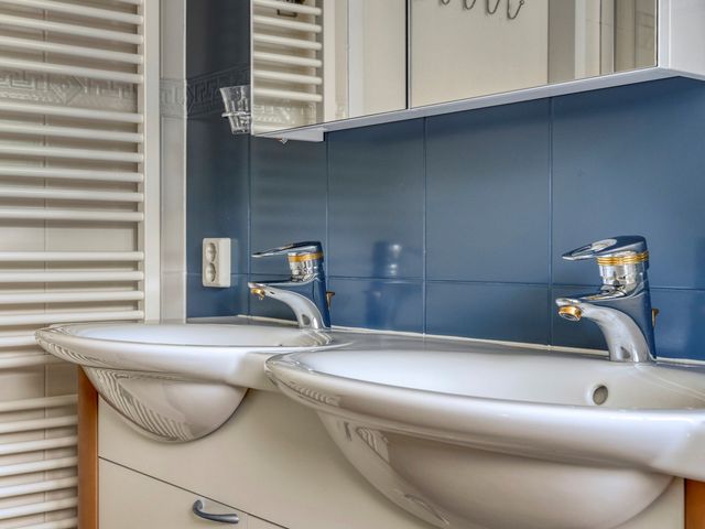 De badkamer is uitgerust met een dubbele wastafel met badkamermeubel, designradiator, wandcloset en een douchecabine met thermostaatkraan. De ruimte is geheel betegeld en voorzien van mechanische ventilatie.