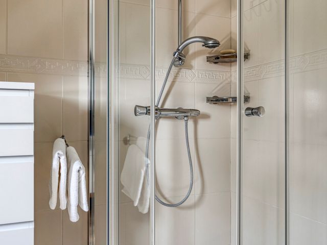 De vloer is afgewerkt met vloertegels in een warme aardetint en uitgerust met comfortabele vloerverwarming. De wanden en plafond zijn gestuct en het plafond is voorzien van een sierlijst en inbouwspots.