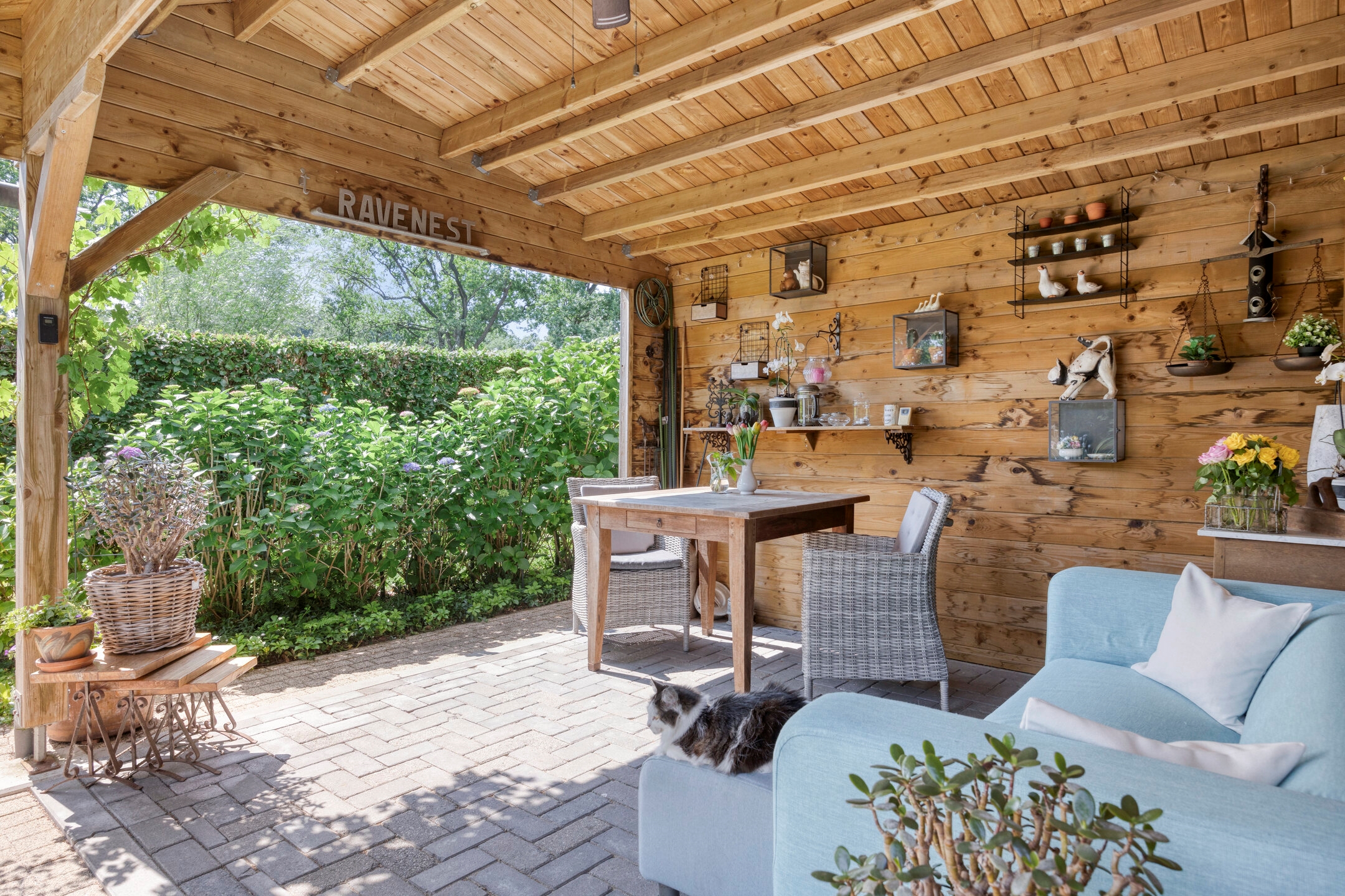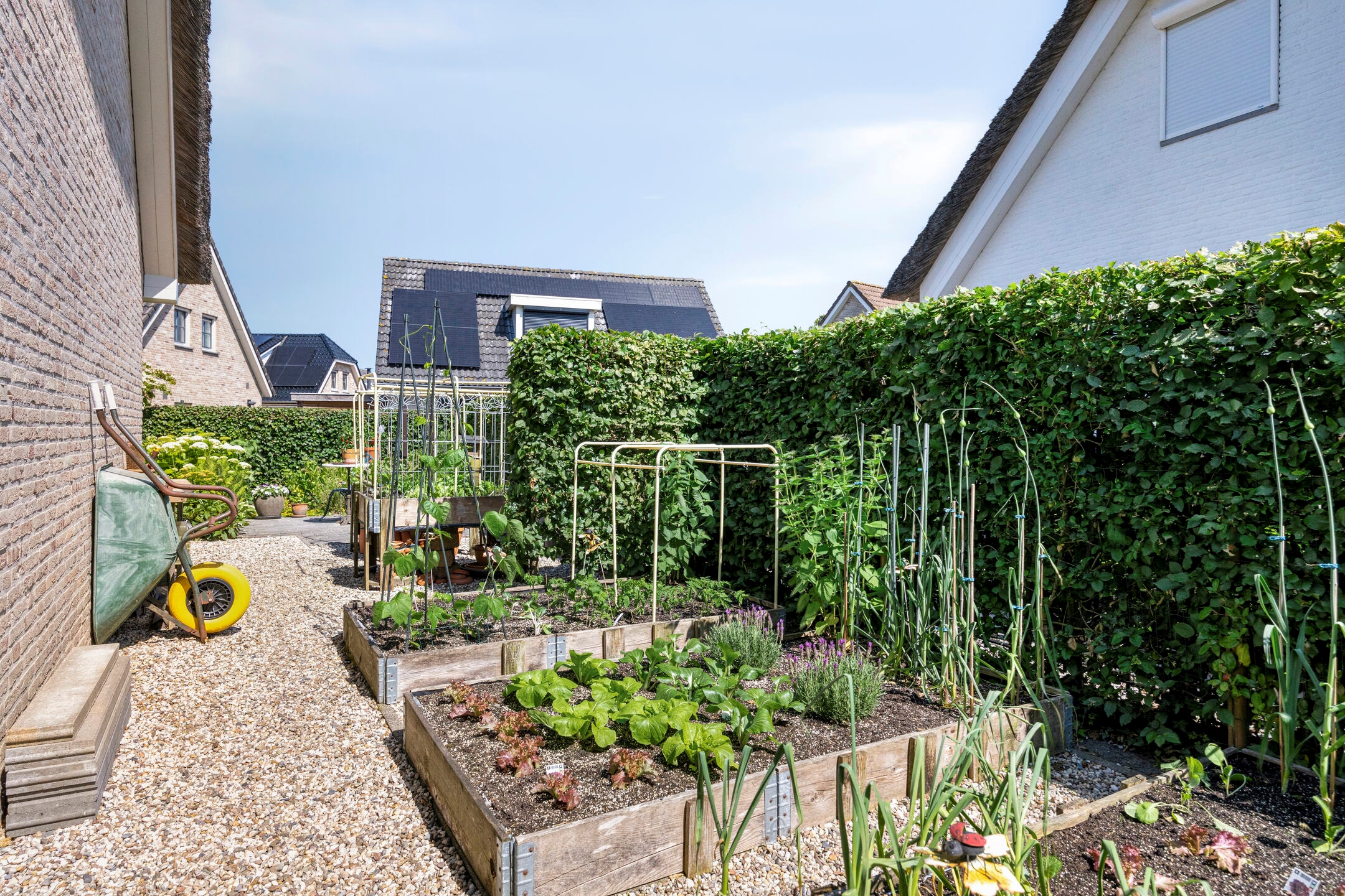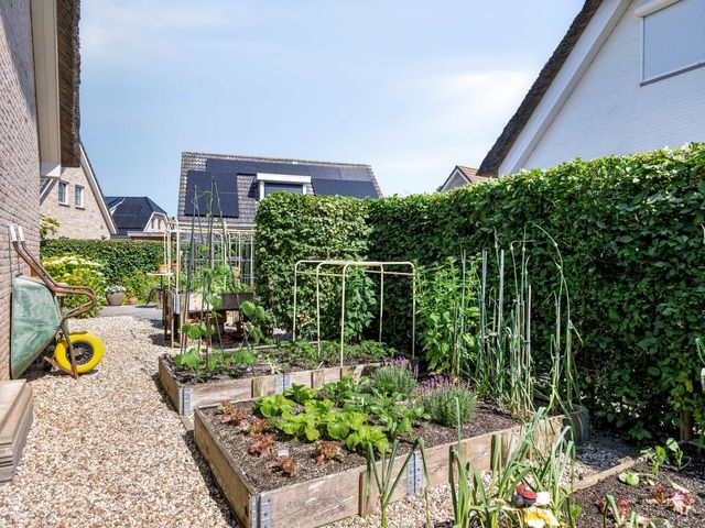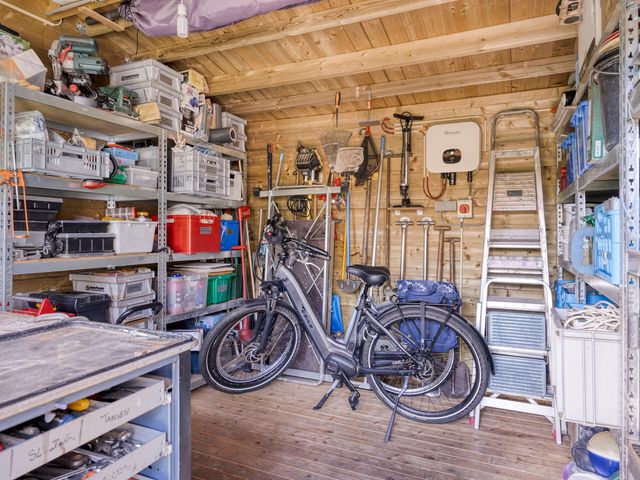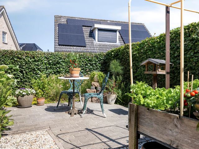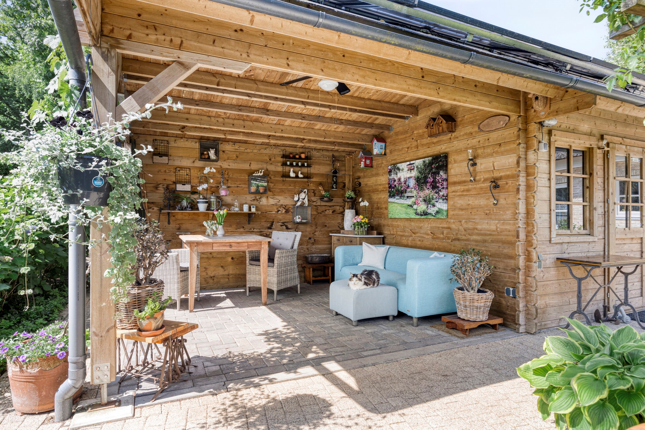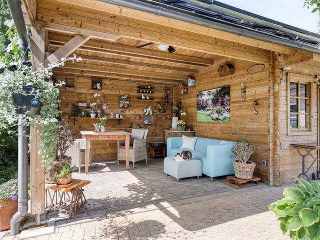 De fraai aangelegde, zonnige tuin is met zorg onderhouden en voorzien van een sfeervolle moestuin. De houten berging met sfeervolle overkapping is uitgerust met elektriciteit en voorzien van 10 zonnepanelen op het dak.