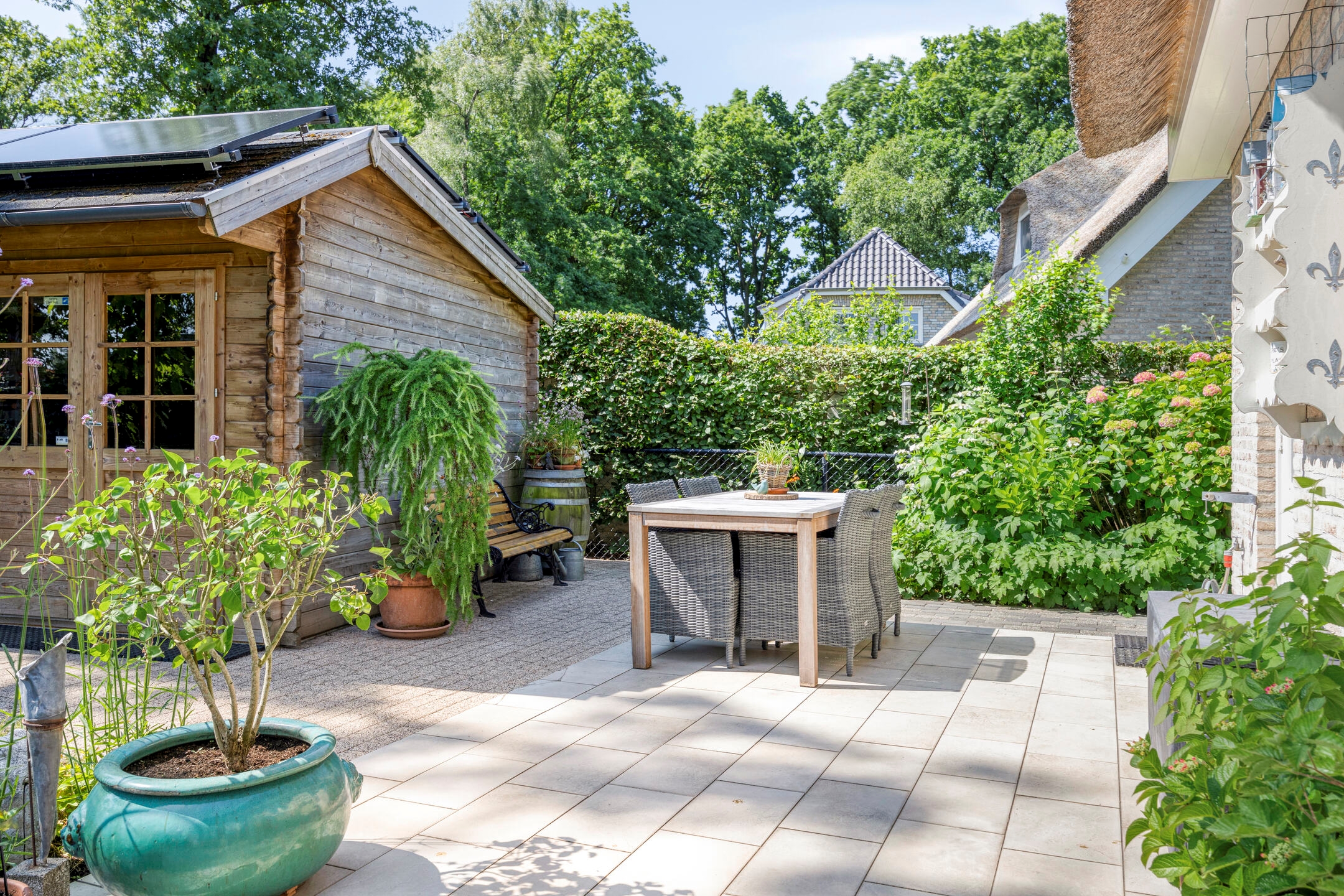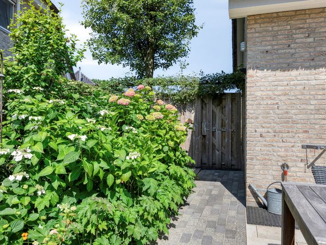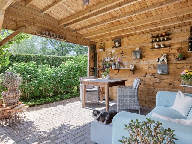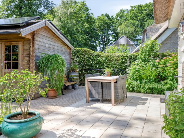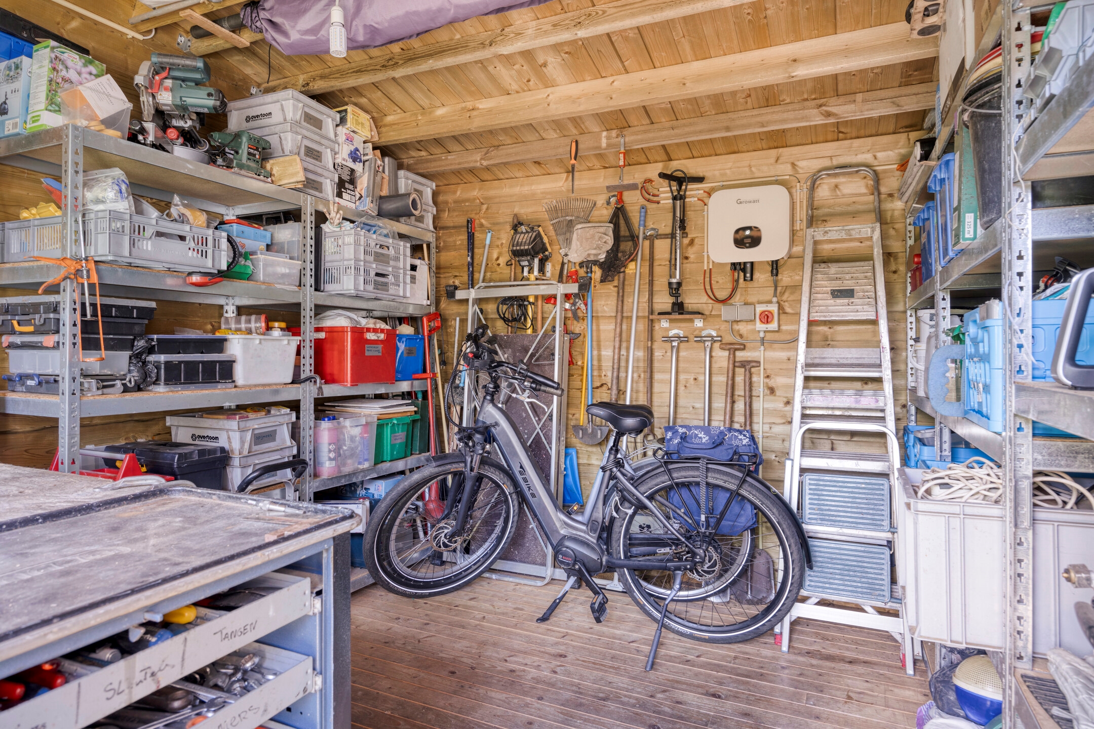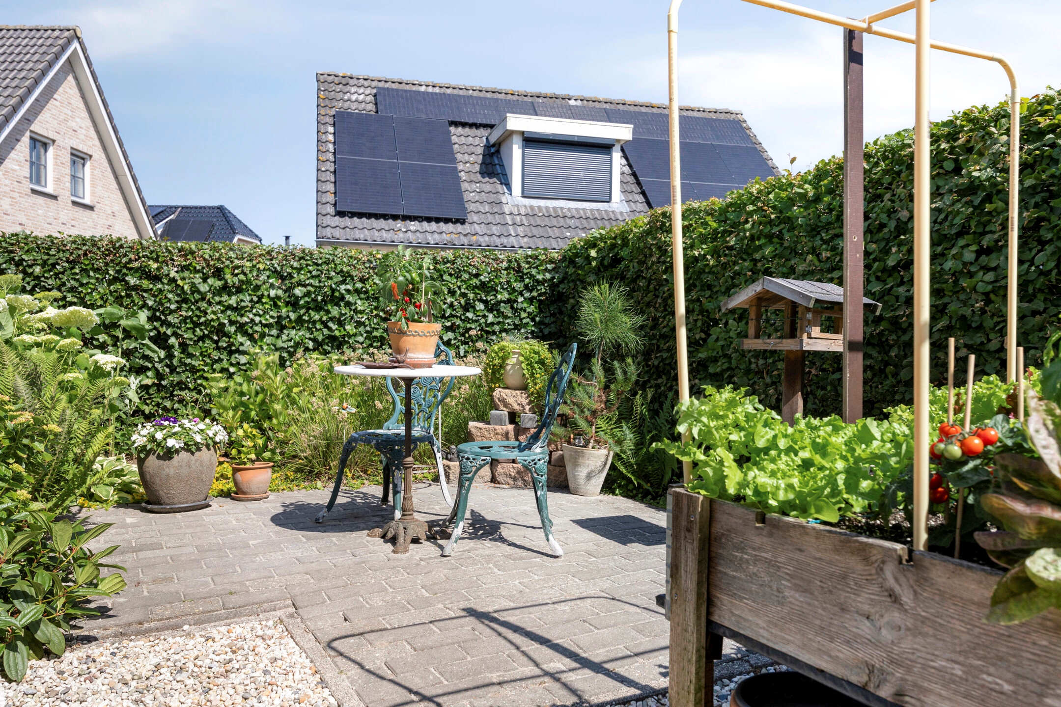 De fraai aangelegde, zonnige tuin is met zorg onderhouden en voorzien van een sfeervolle moestuin. De houten berging met sfeervolle overkapping is uitgerust met elektriciteit en voorzien van 10 zonnepanelen op het dak.