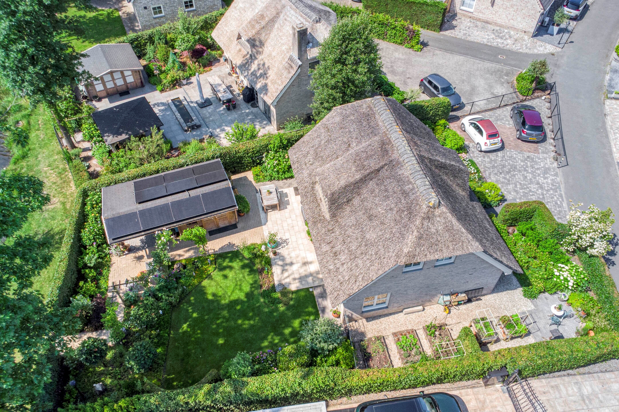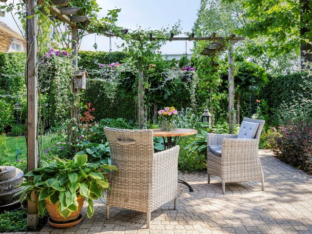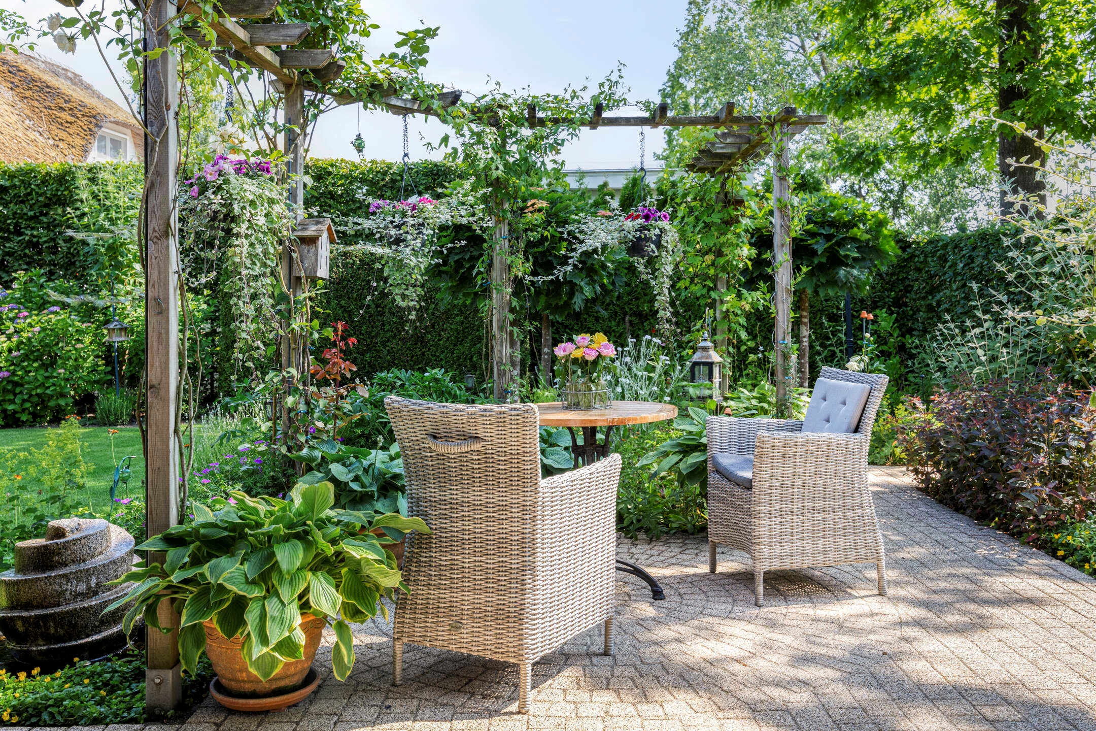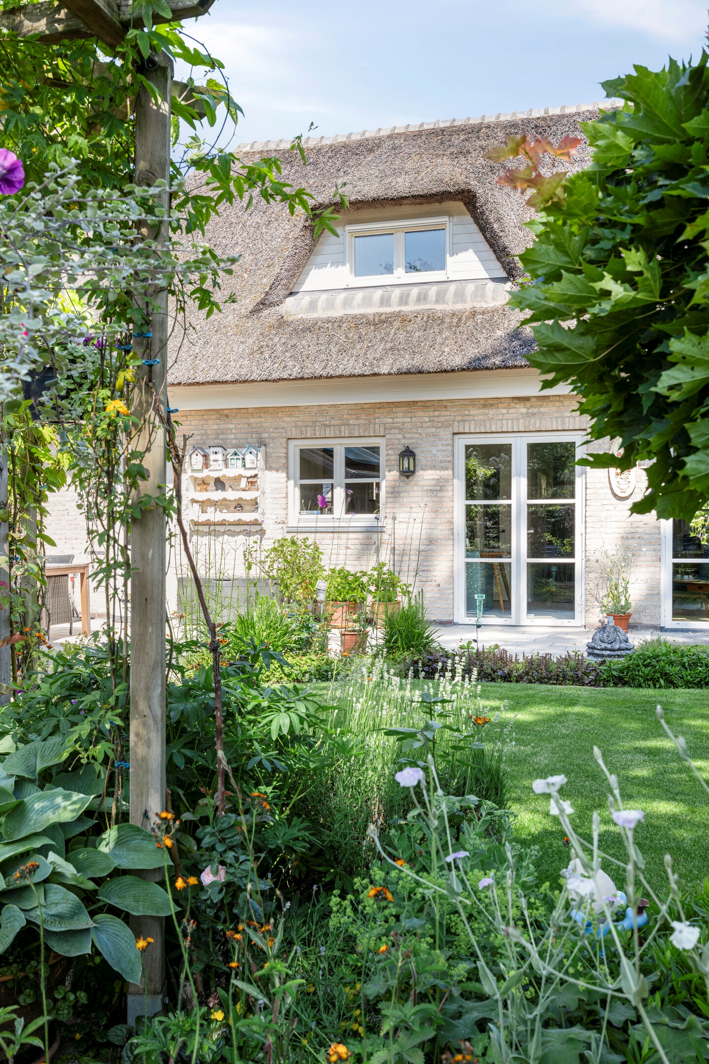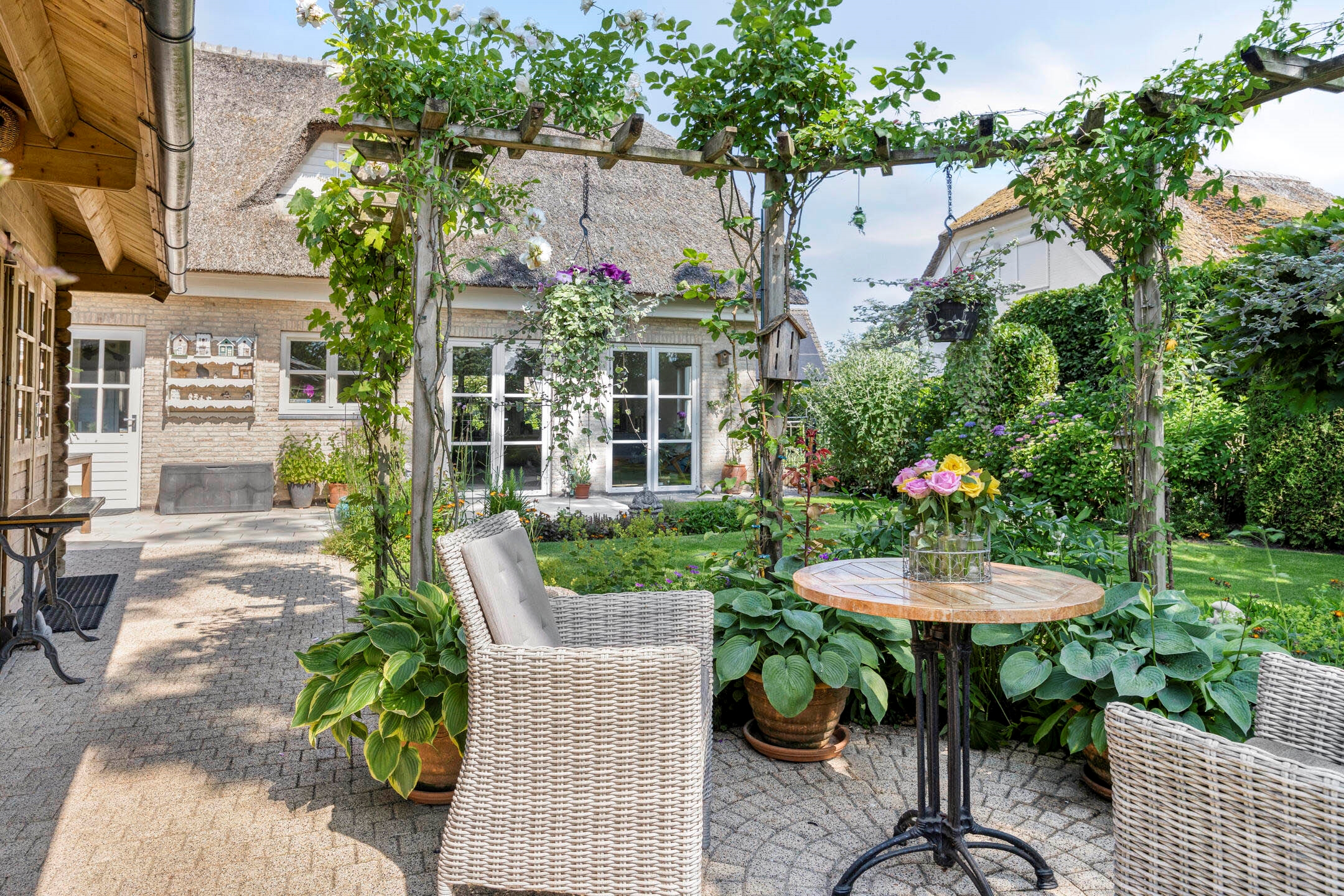 De fraai aangelegde, zonnige tuin is met zorg onderhouden en voorzien van een sfeervolle moestuin. De houten berging met sfeervolle overkapping is uitgerust met elektriciteit en voorzien van 10 zonnepanelen op het dak.