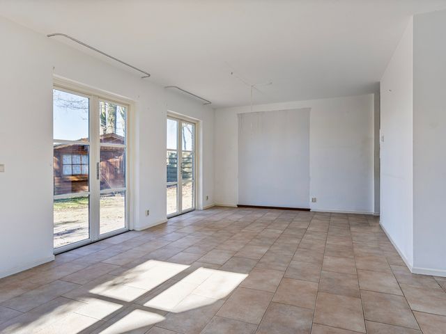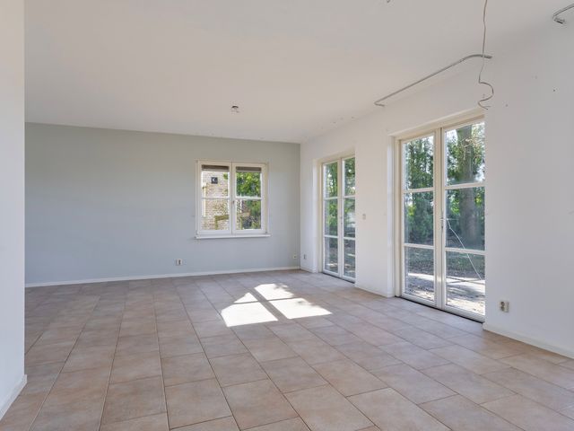 Licht en ruimte! Dankzij de meerdere openslaande tuindeuren en raampartijen is de benedenverdieping heerlijk licht en ruimtelijk. De tuindeuren geven direct toegang tot het aangrenzende terras en de tuin. De gehele benedenverdieping is afgewerkt met een lichte tegelvloer voorzien van vloerverwarming, en de wanden zijn strak gestuct.