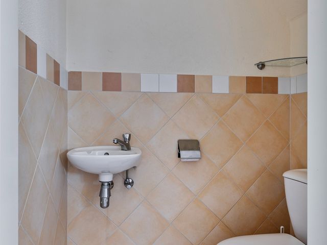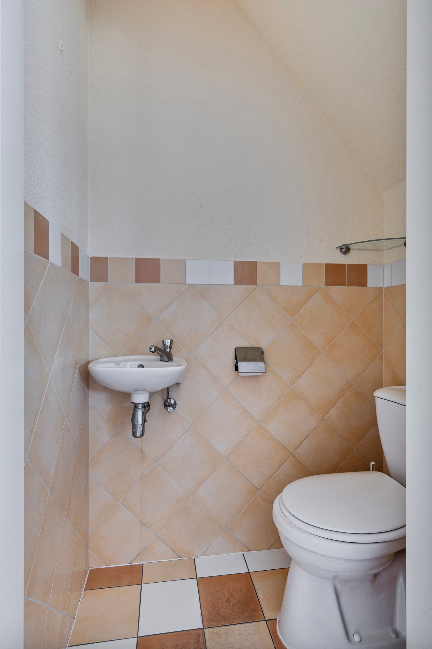 De toilet is deels betegeld en voorzien van closet en een fontein.