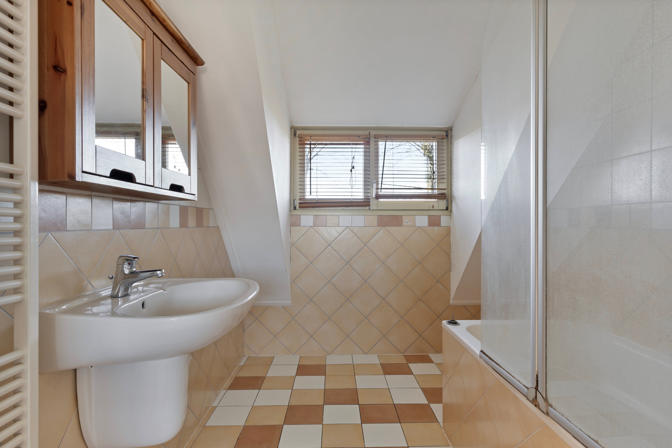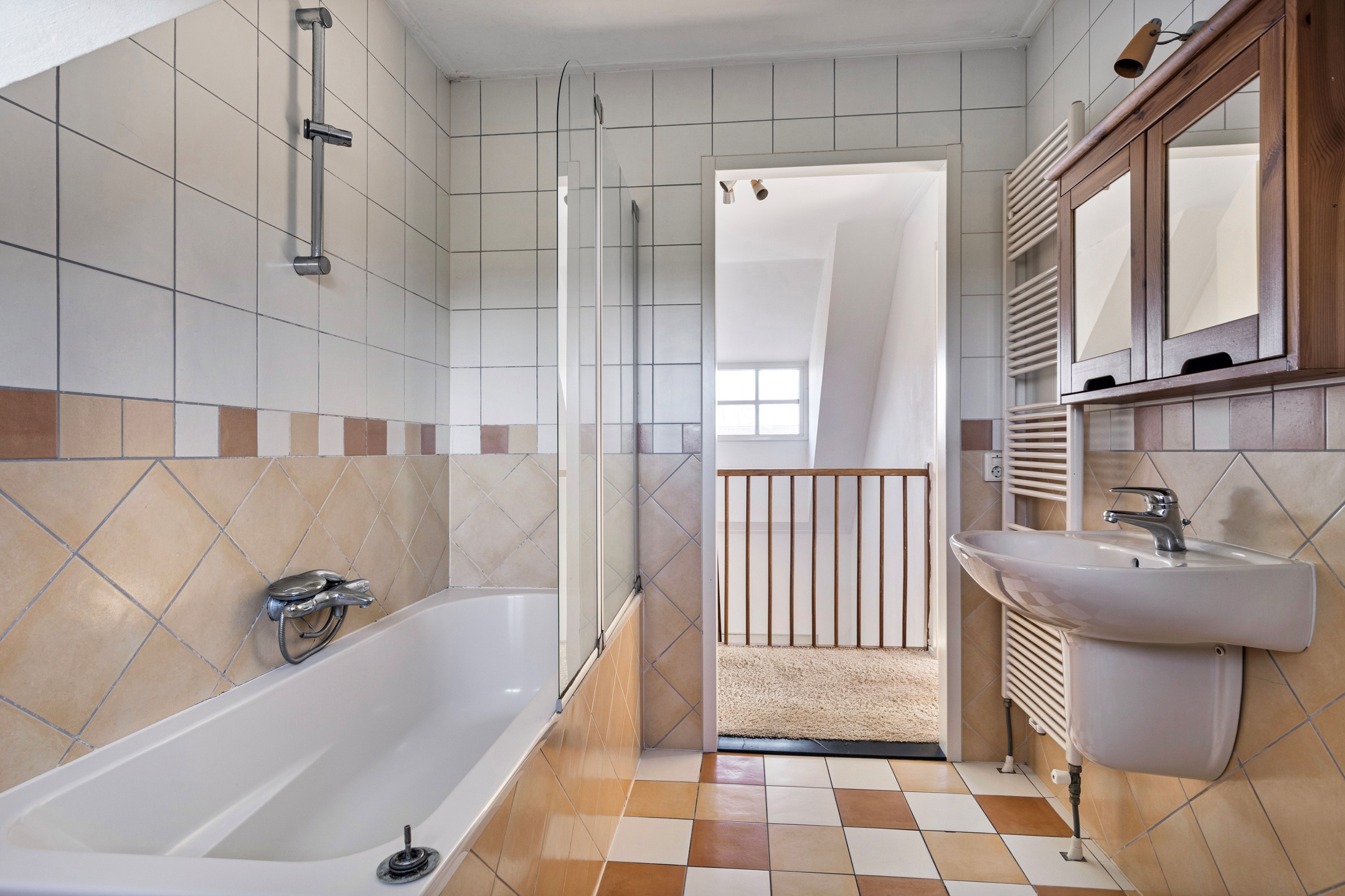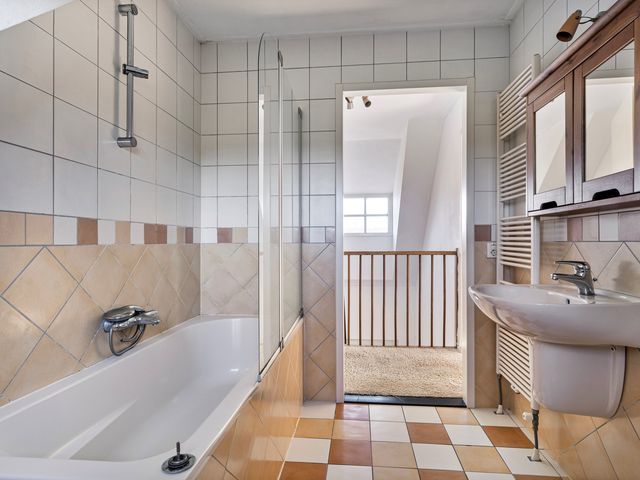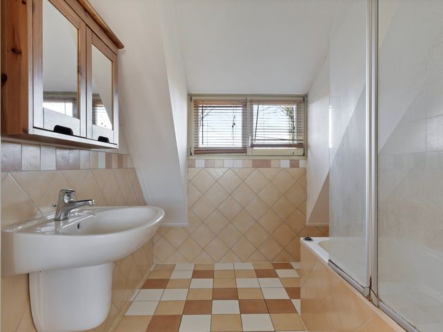 De badkamer is compleet ingericht met een ligbad met douche en een wastafel. De ruimte is volledig betegeld en beschikt over een raampartij, wat zorgt voor natuurlijke ventilatie en prettig daglicht.