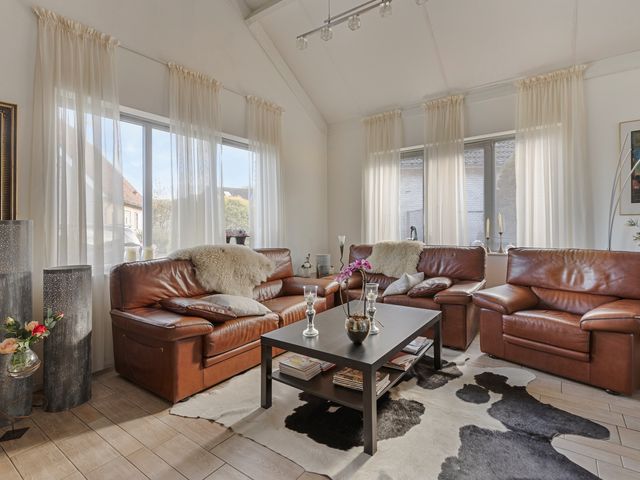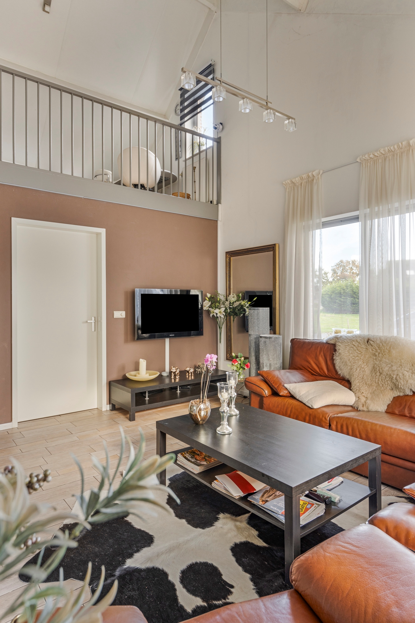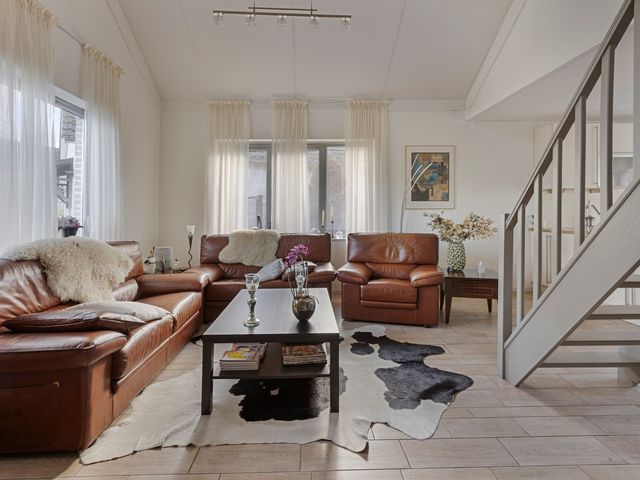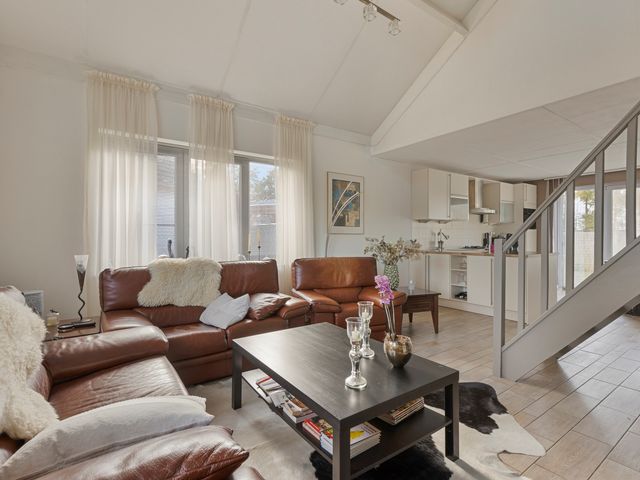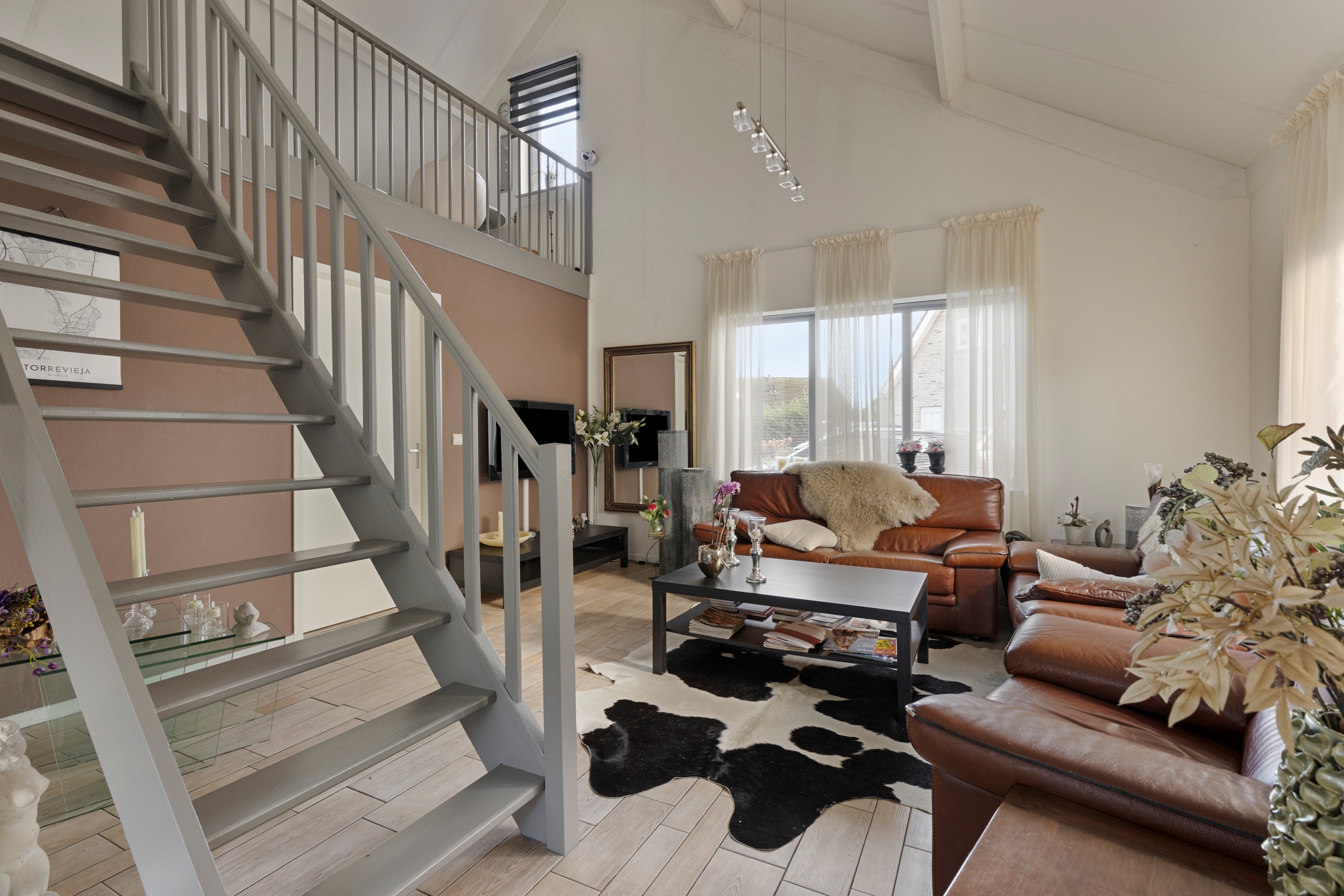 De woonkamer is een lichte leefruimte met meerdere raampartijen. Bijzonder fraai is de hoge nok, hierdoor krijgt de kamer een ruimtelijk effect. De tegelvloer met vloerverwarming is vanuit de hal doorlopend in de woonkamer, keuken, de slaapkamer en badkamer. Door middel van een trap in de woonkamer heeft u toegang tot de vide op de eerste verdieping.