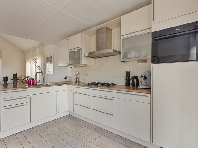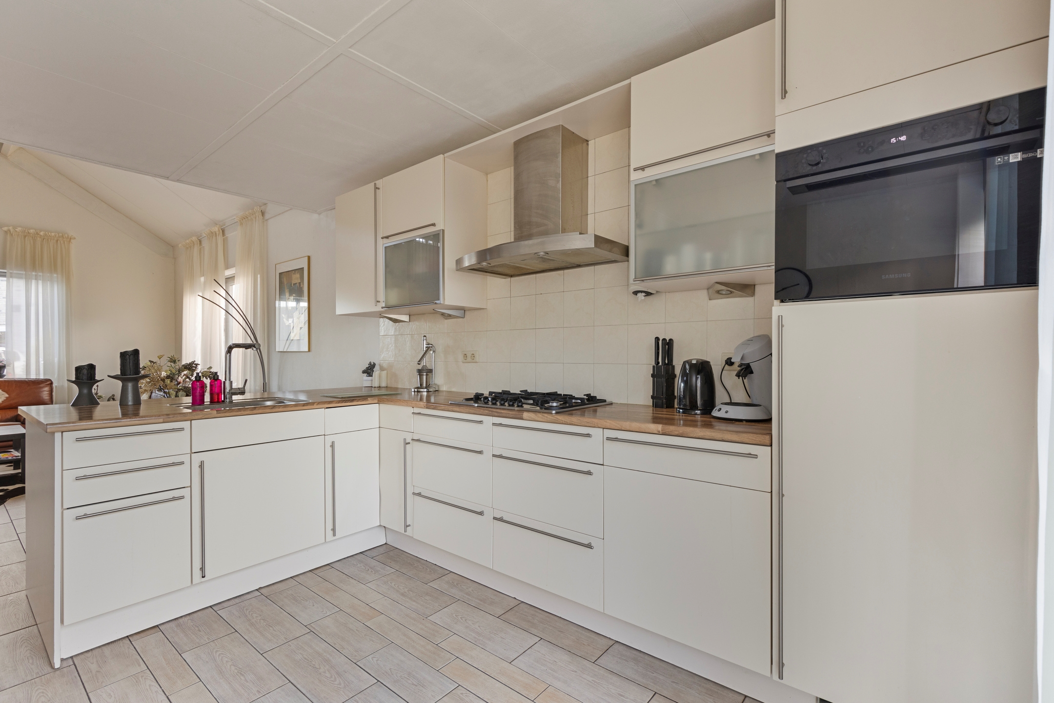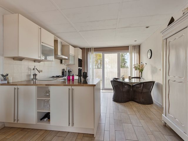 De open keuken ligt aan de achterzijde van de woning met toegang tot de achtertuin middels een loopdeur. De keuken biedt ruimte voor een eethoek met zicht op de tuin. De keuken is voorzien van een combimagnetron, vaatwasser, inbouwkoelkast, 5-pits gaskookplaat, rvs afzuigkap en rvs spoelbak.
