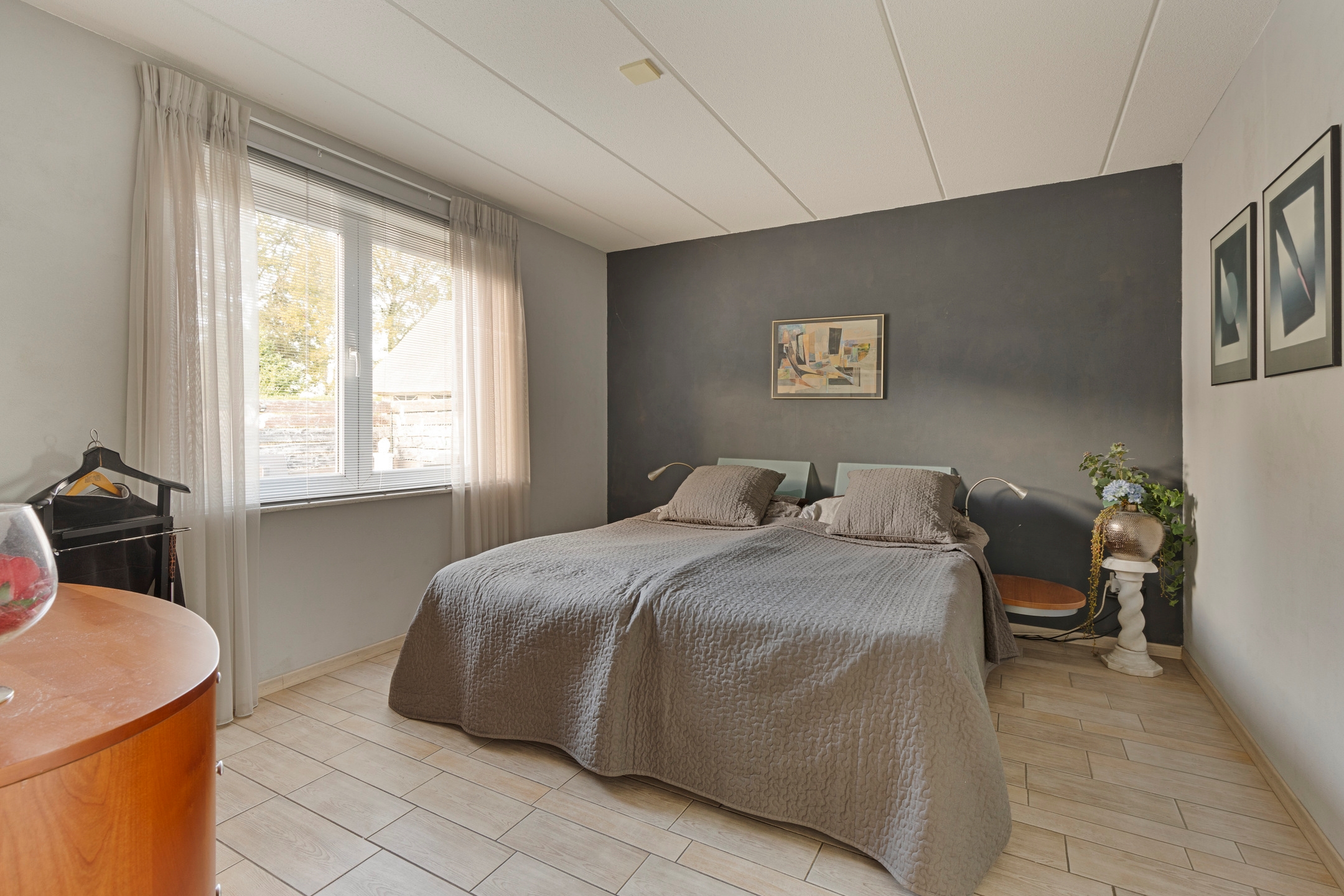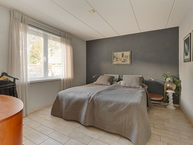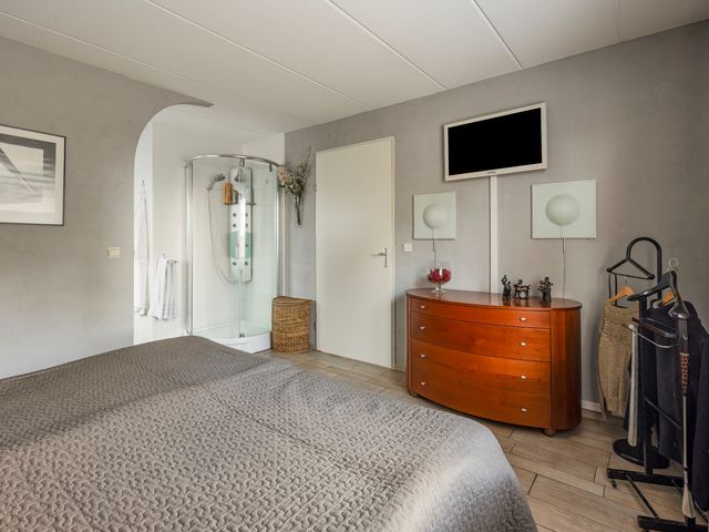 Vanuit de keuken is er toegang tot de ruime slaapkamer. Deze slaapkamer is gelegen aan de achterzijde van de woning met uitzicht op de achtertuin. Deze kamer is afgewerkt met een stucwerk wandafwerking. Een extra pluspunt van deze slaapkamer is de badkamer en suite.