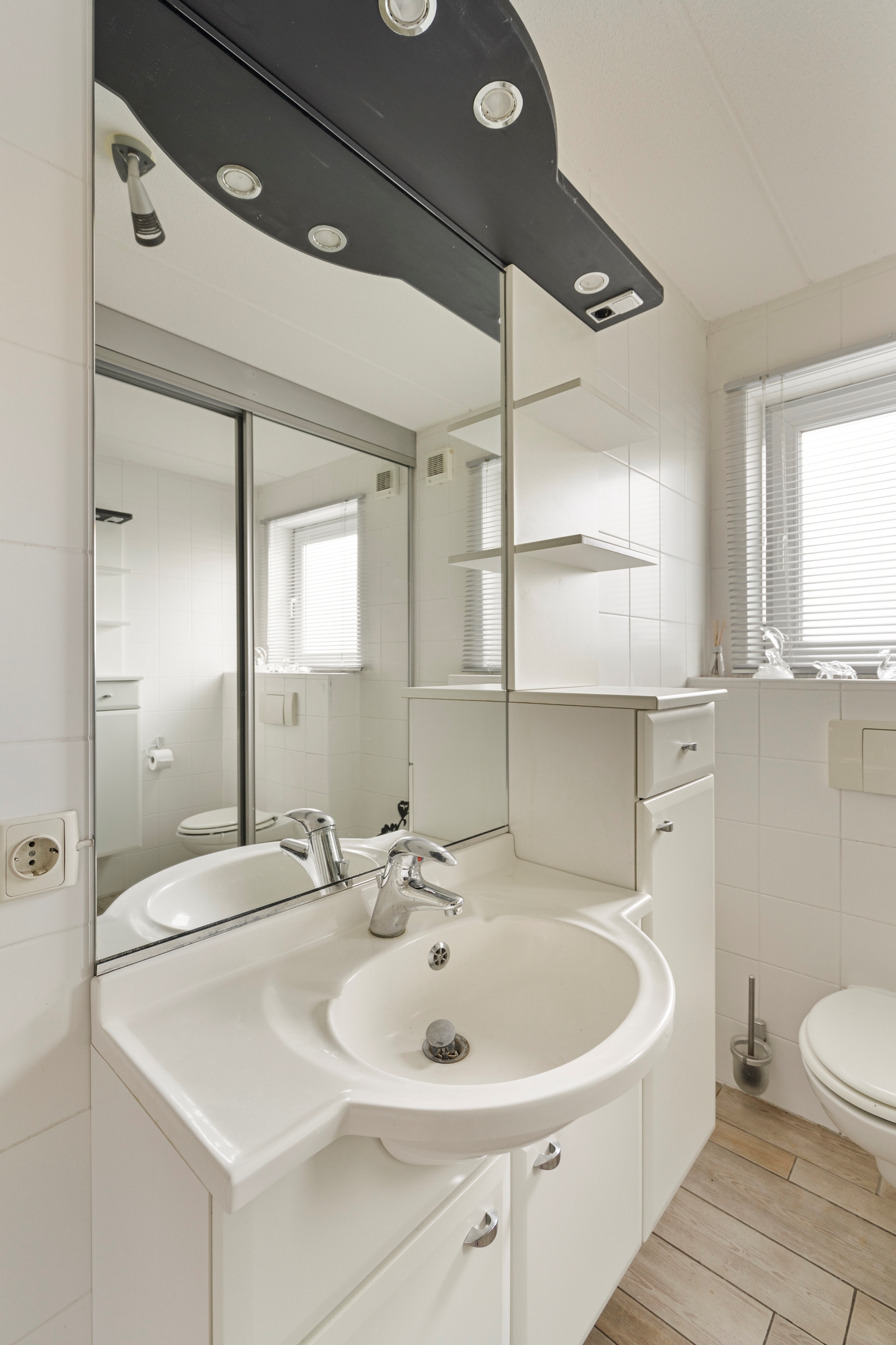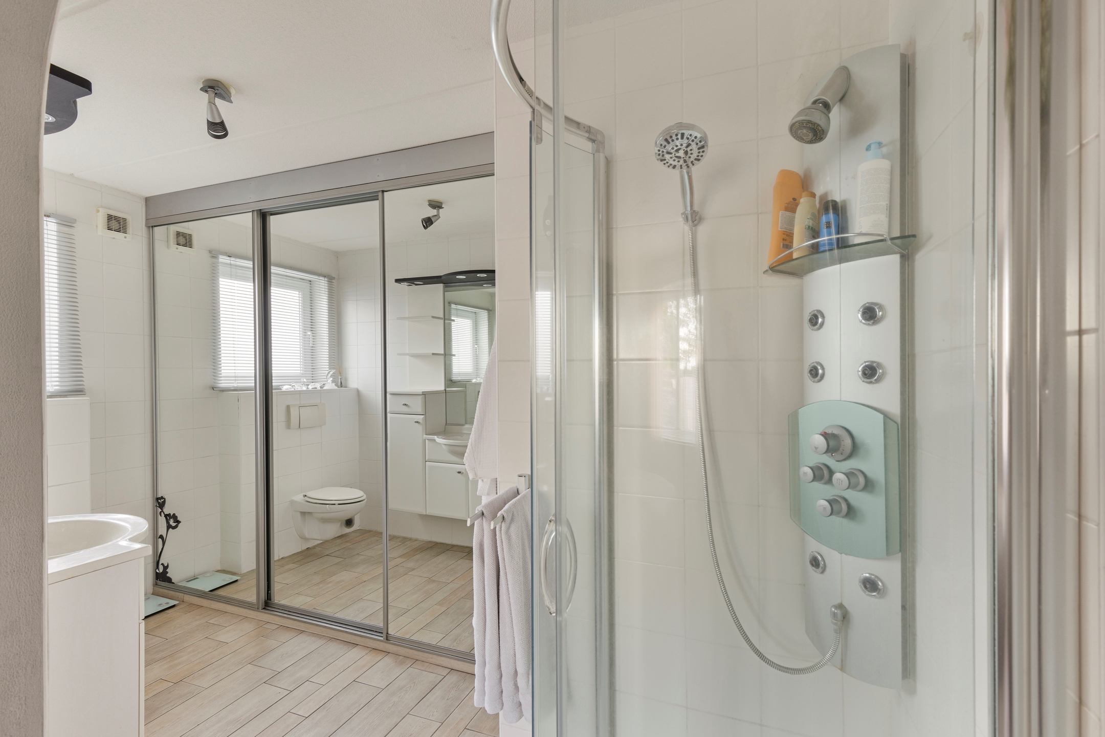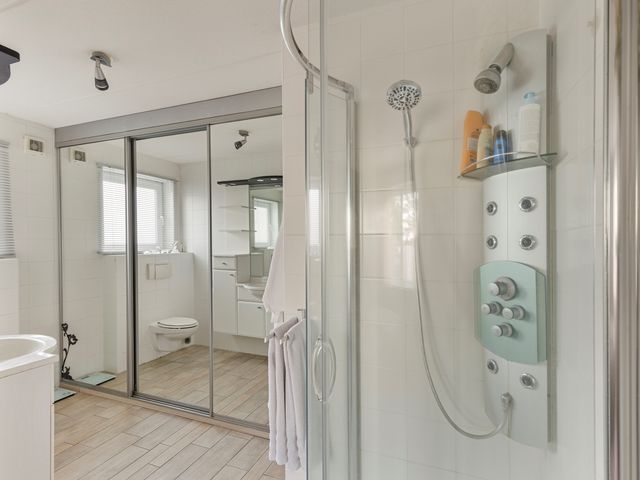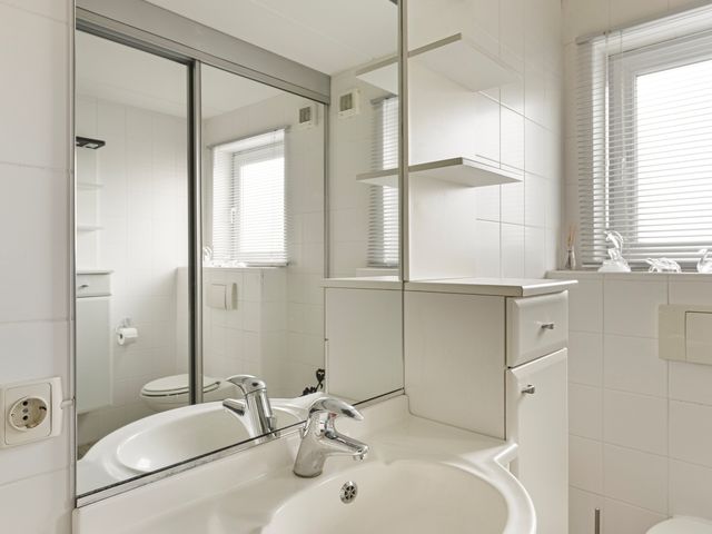 De royale badkamer is geheel betegeld en voorzien van een wastafel met badkamermeubel, een massage douche en een wand closet. Door de ruime inbouwkast is in deze badkamer aan opbergruimte geen gebrek.
