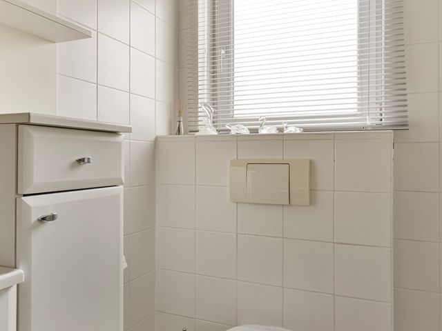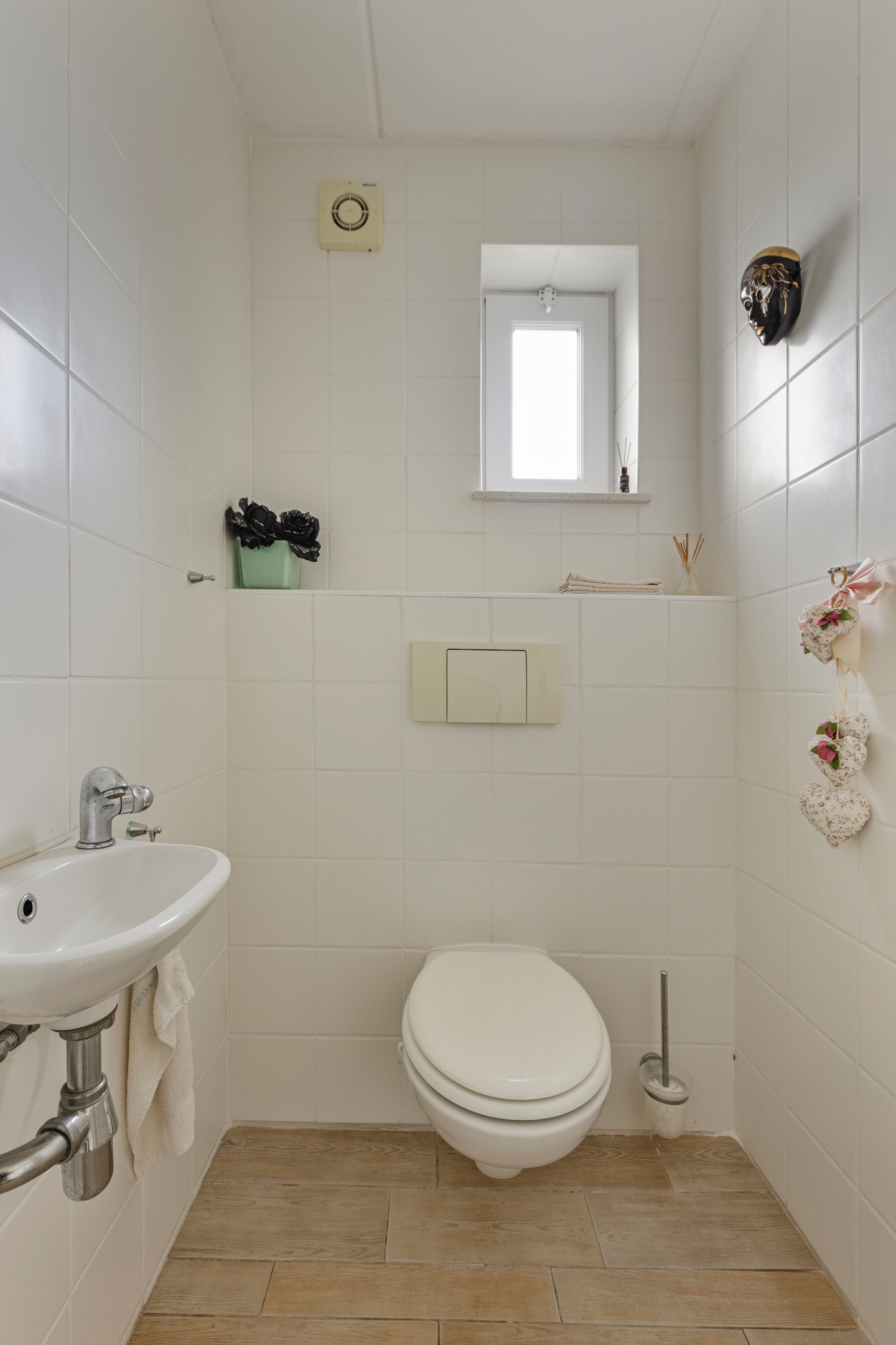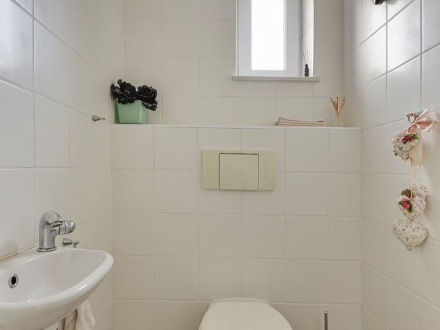 Het toilet is voorzien van een wand closet en een fonteintje. De ruimte is geheel betegeld.