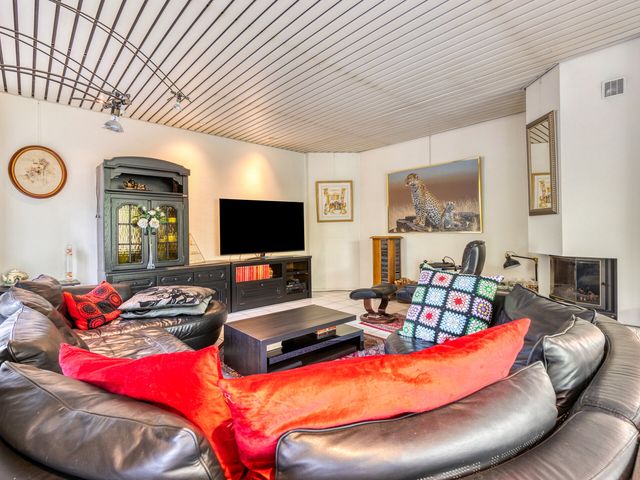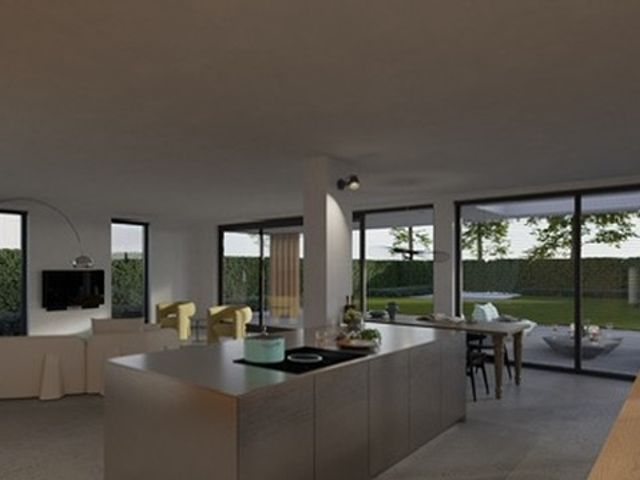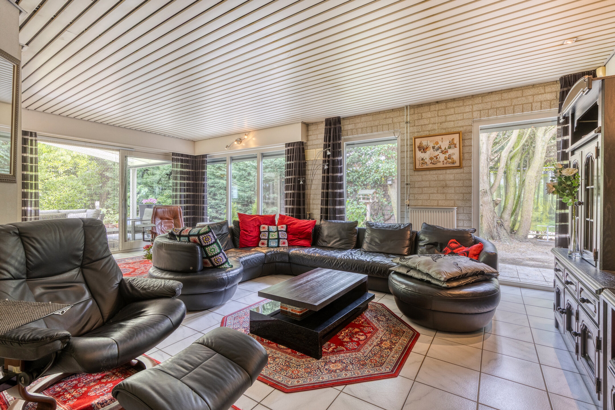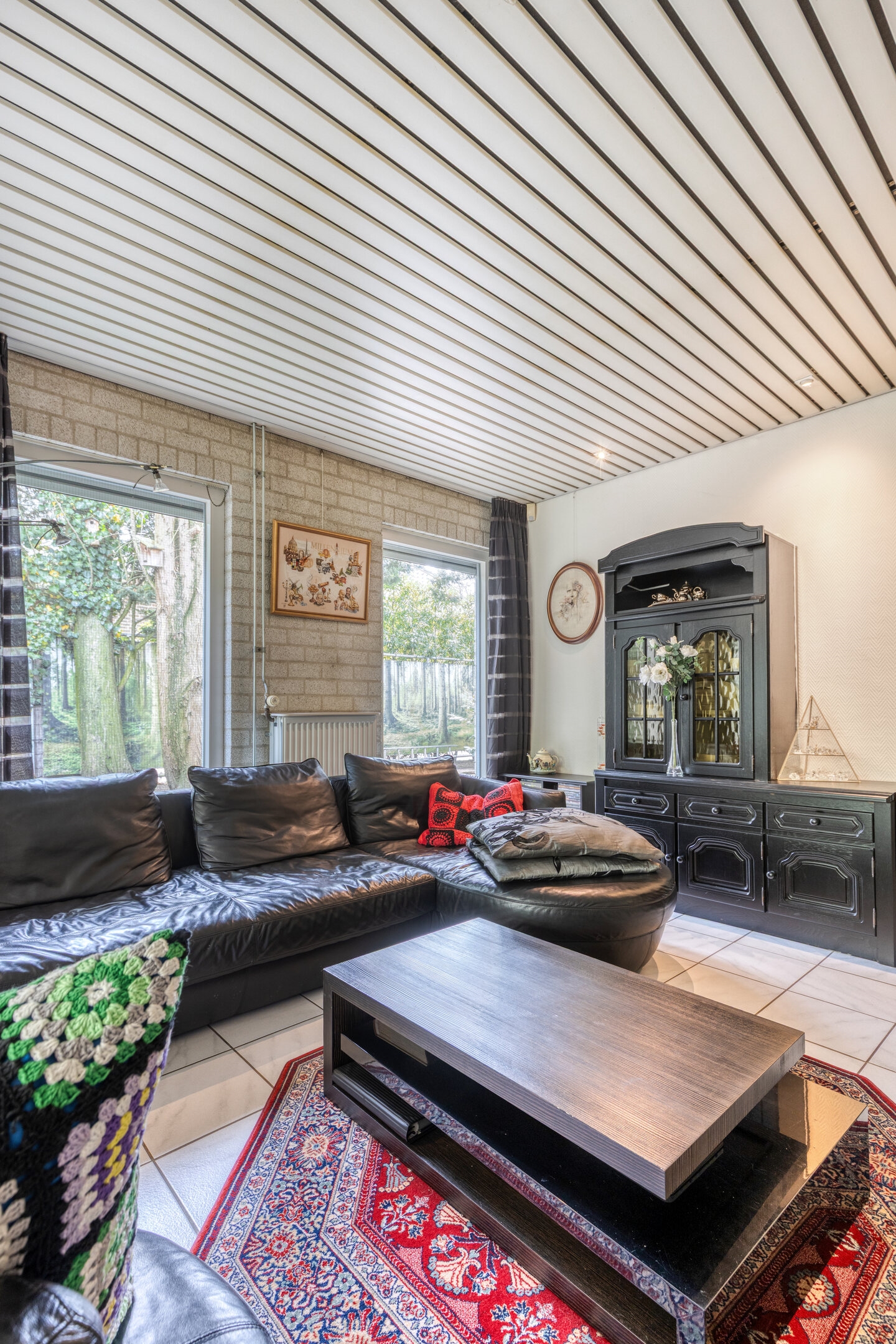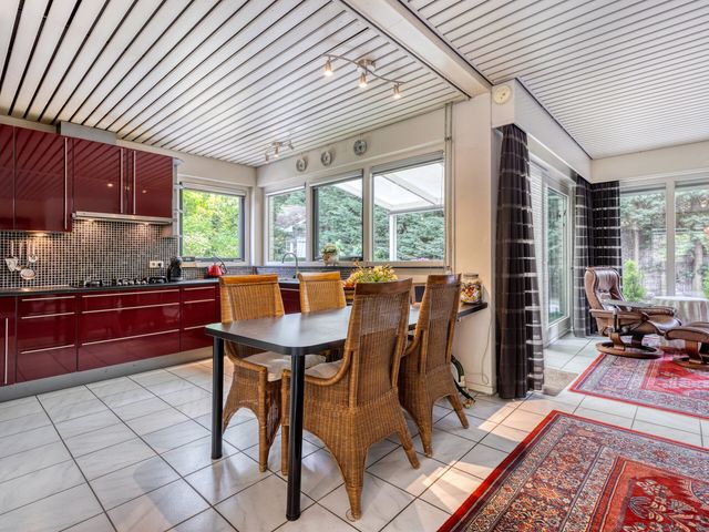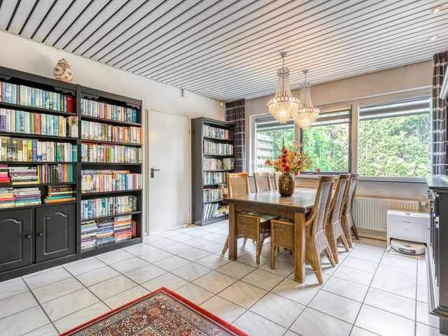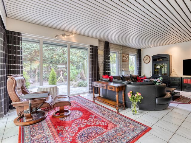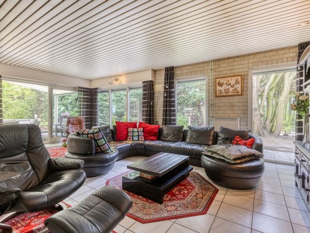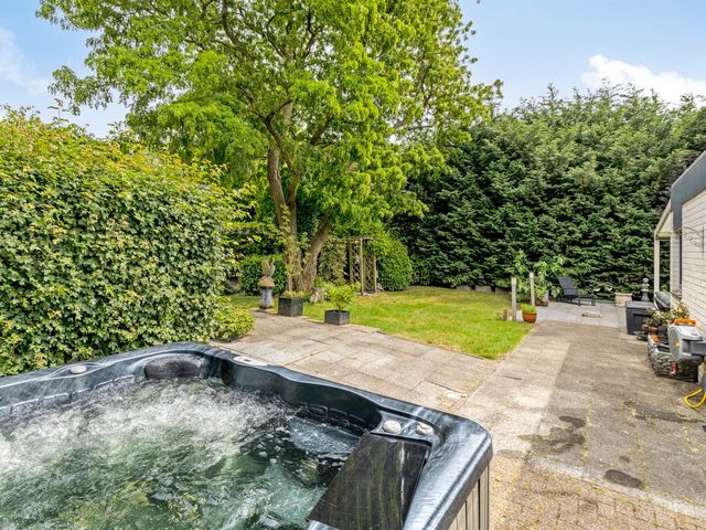 De woonkamer bevindt zich aan de achterzijde van de woning, in een prettige L-vorm, en kijkt uit over de fraai aangelegde tuin. Grote raampartijen en een schuifpui zorgen voor veel lichtinval en een directe verbinding met buiten. In de tuin vindt u een jacuzzi (bubbelbad) voor ultieme ontspanning.