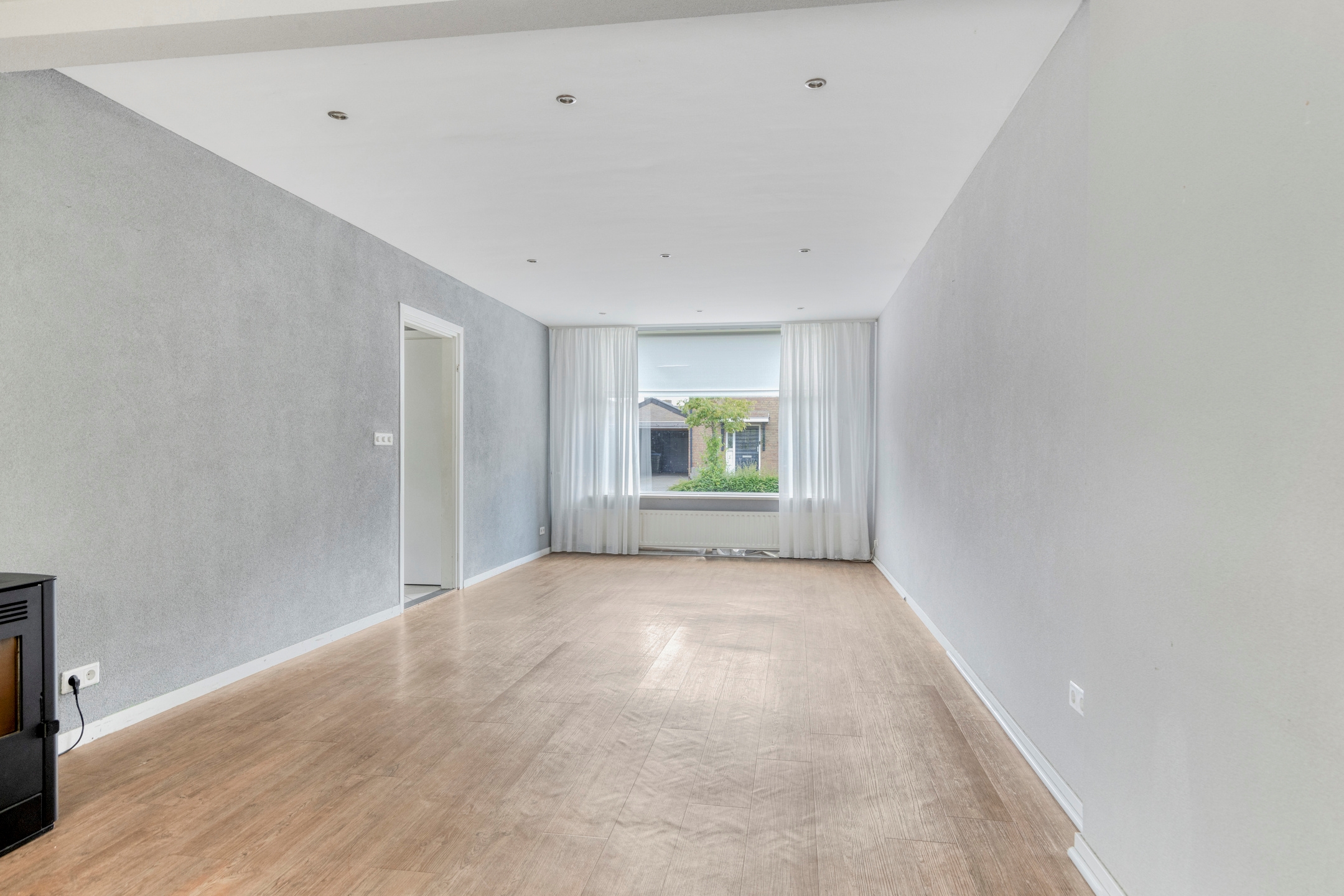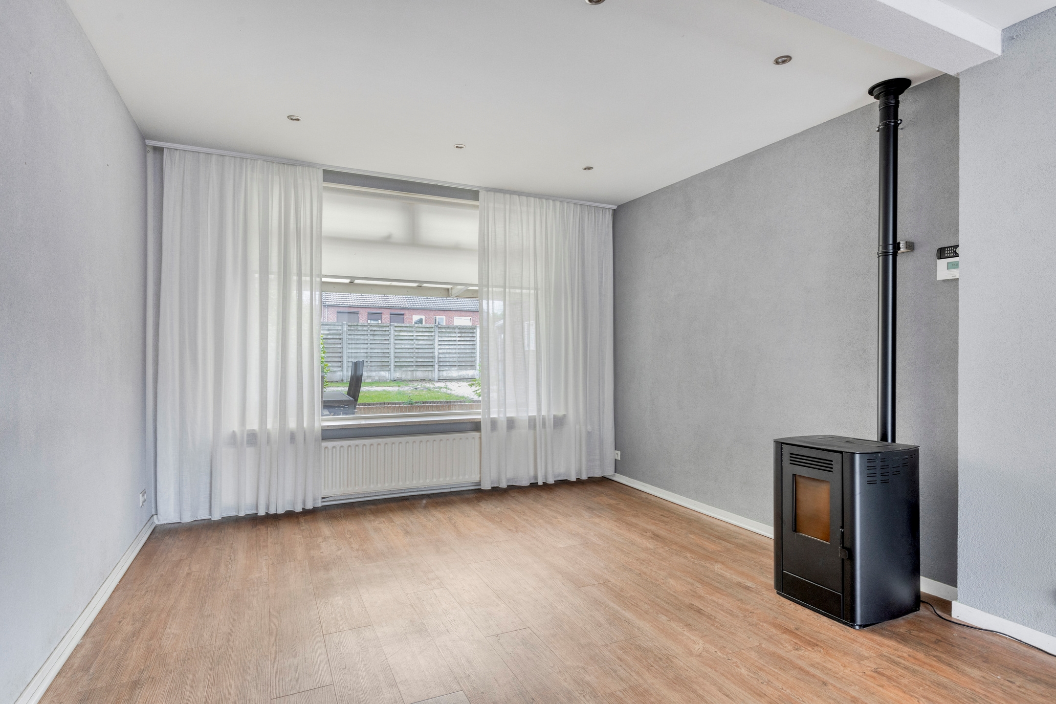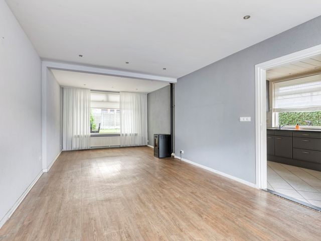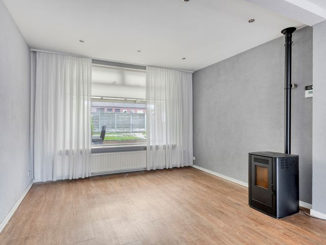 De ruime en lichte woonkamer is voorzien van een sfeervolle palletkachel, de vloer is afgewerkt met zeil en de wanden zijn voorzien van stucwerk. Door de raampartijen heeft deze woonkamer veel lichtinval.
