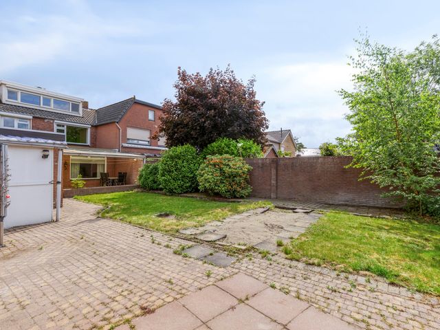 De riante achtertuin is voorzien van bestrating, gazon, vaste beplanting en een overkapping.