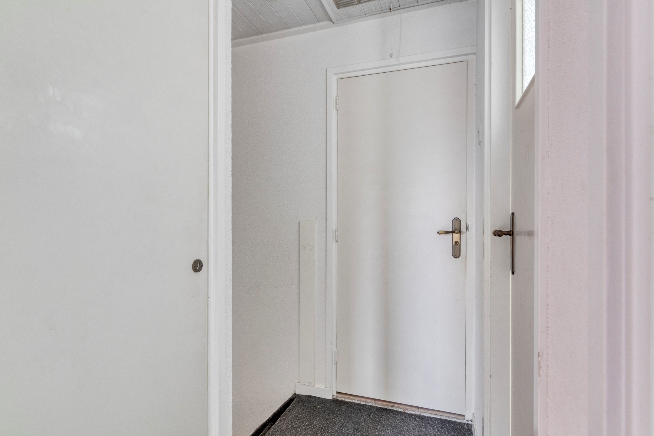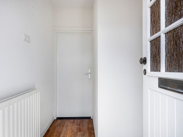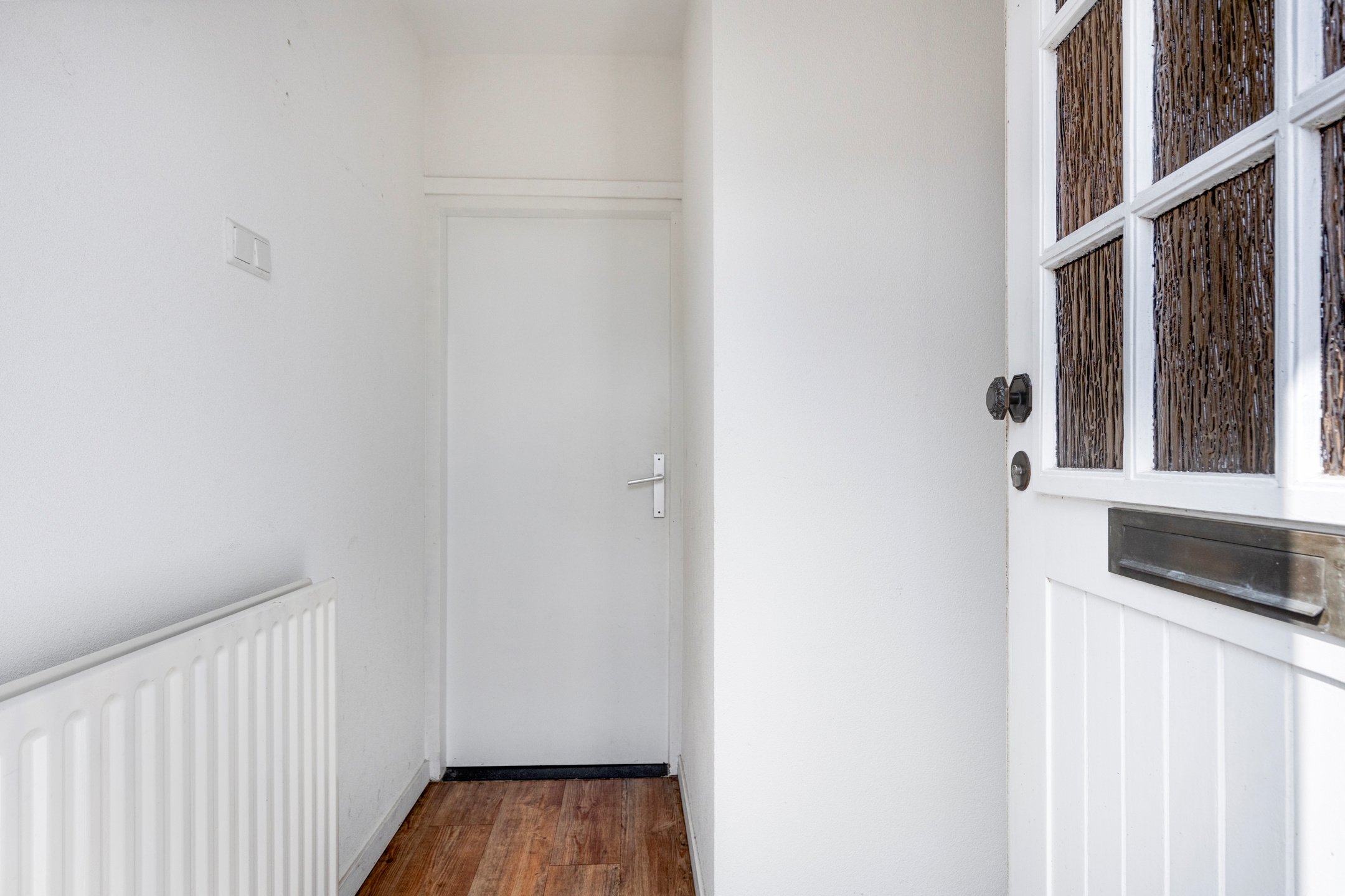 De hal geeft toegang tot de woonkamer, meterkast, de trapopgang van de eerste verdieping en de dichte keuken.