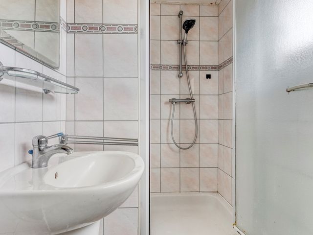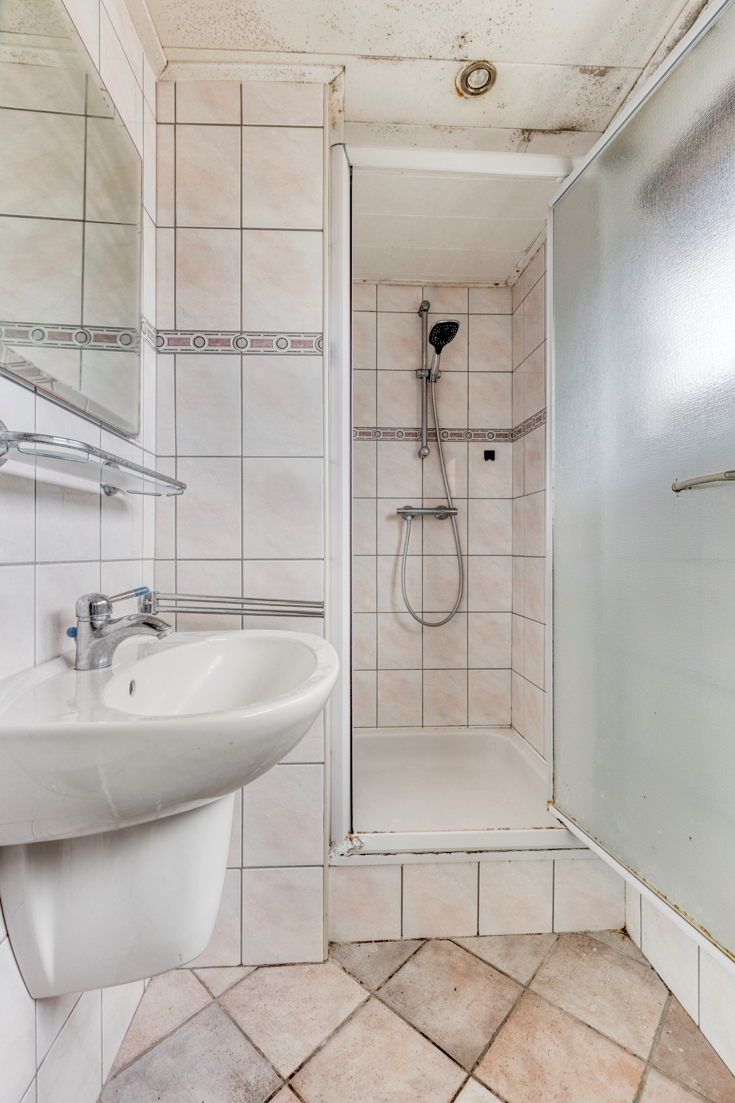 De compacte badkamer is geheel betegeld en compleet uitgerust met een douchecabine, wastafel en een toilet.