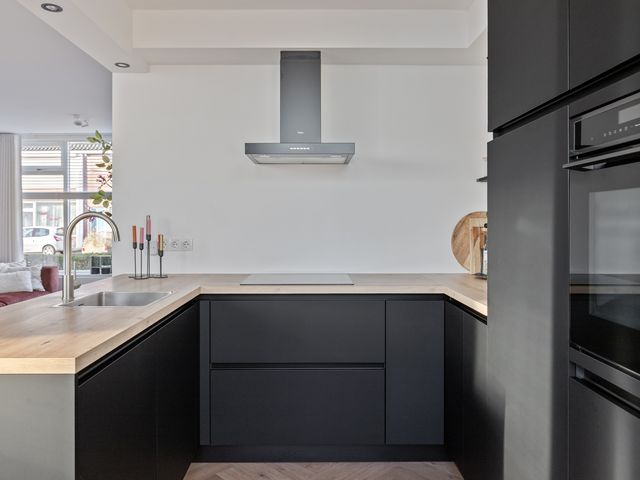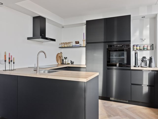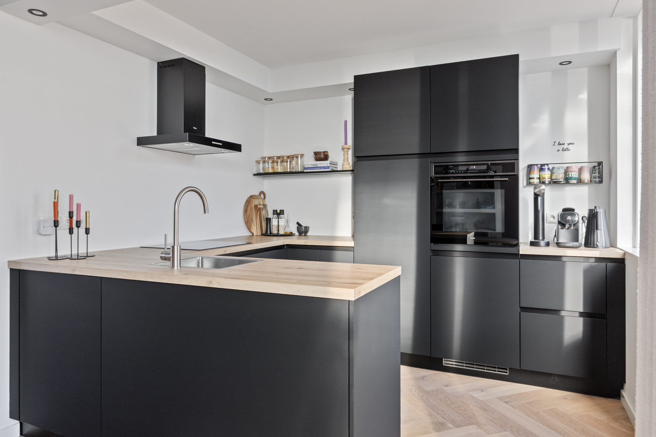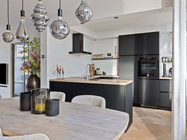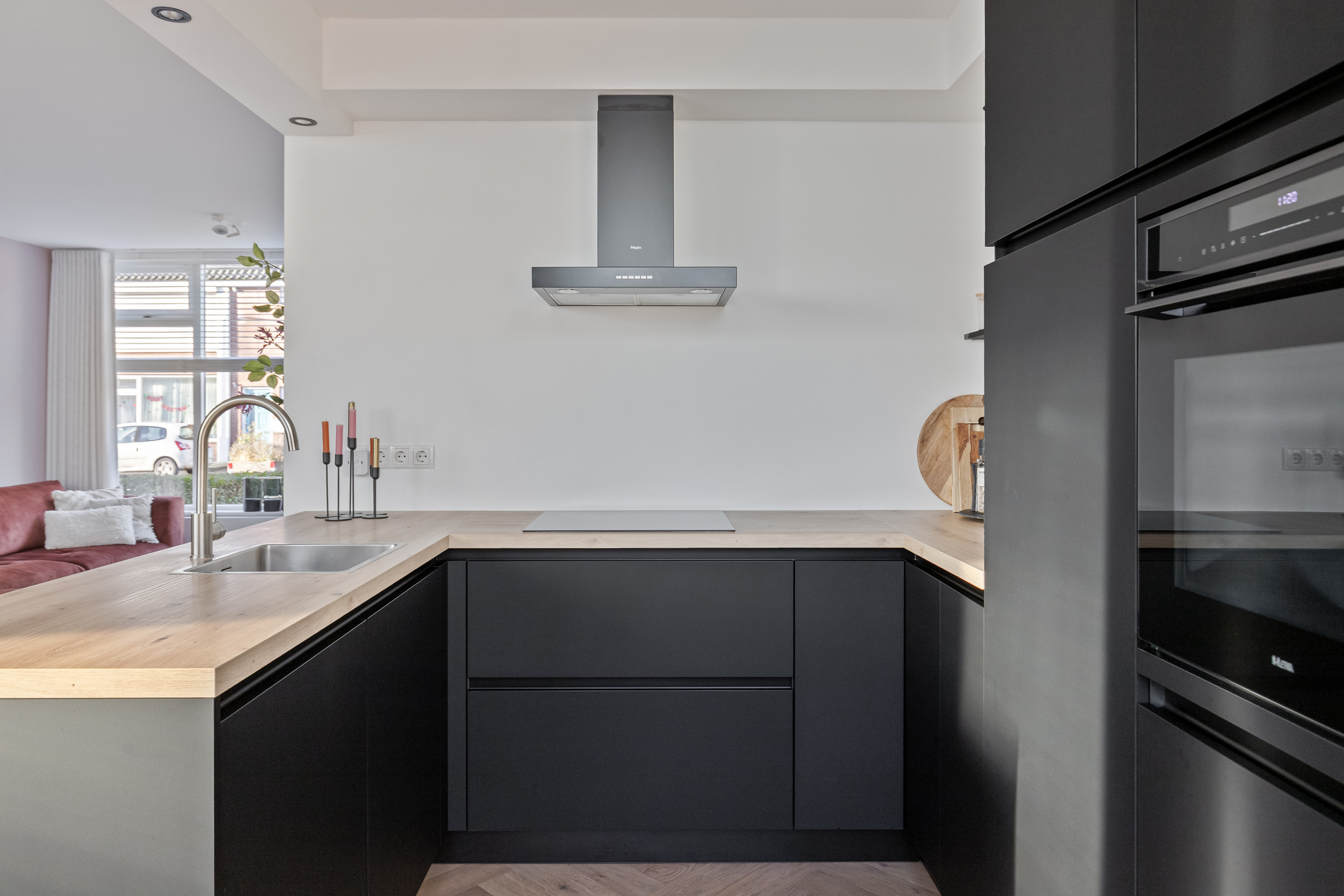 De woonkamer is voorzien van een op maat gemaakte stalen deur, een eikenhouten vloer met visgraat motief en staat in open verbinding met de keuken. De keuken is in 2021 vernieuwd en heeft een strakke, stoere uitstraling dankzij de zwarte fronten en het kunststof werkblad met houtlook.