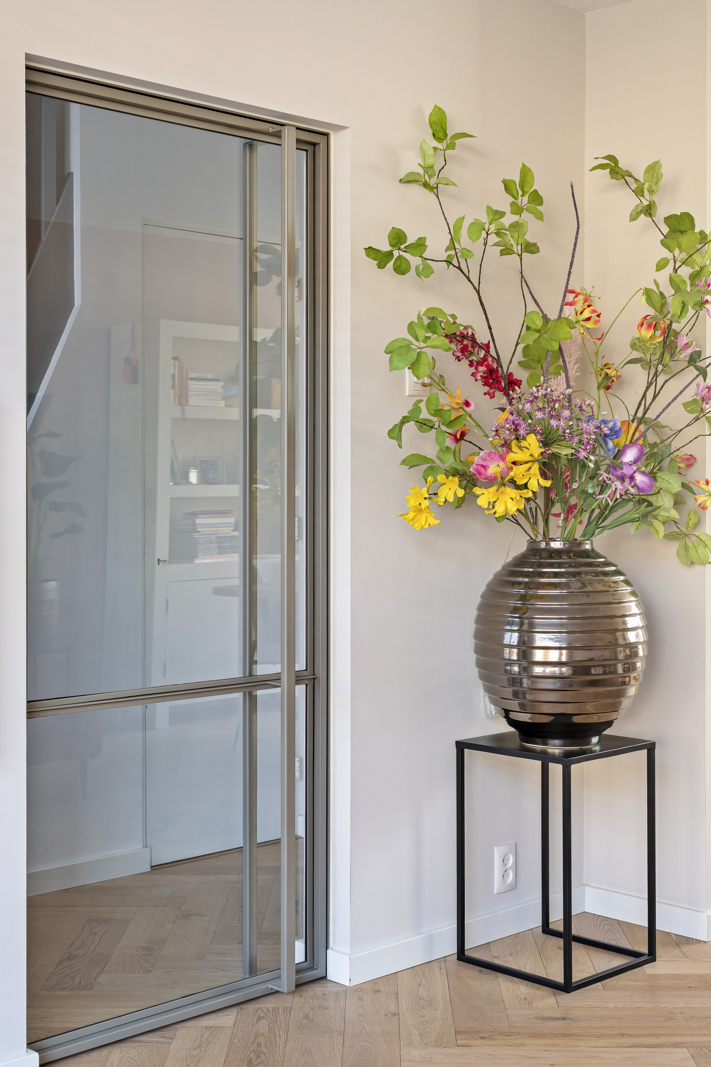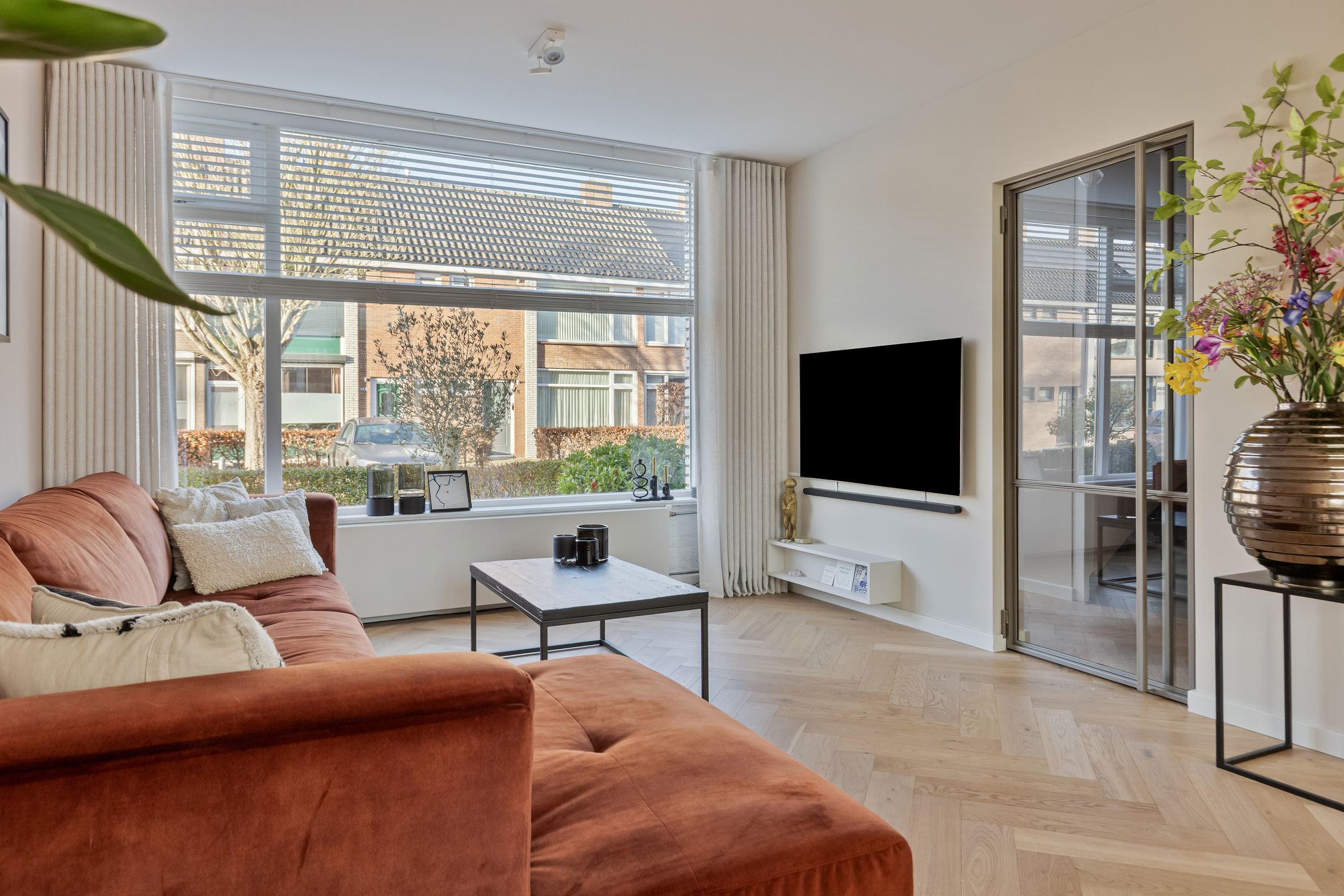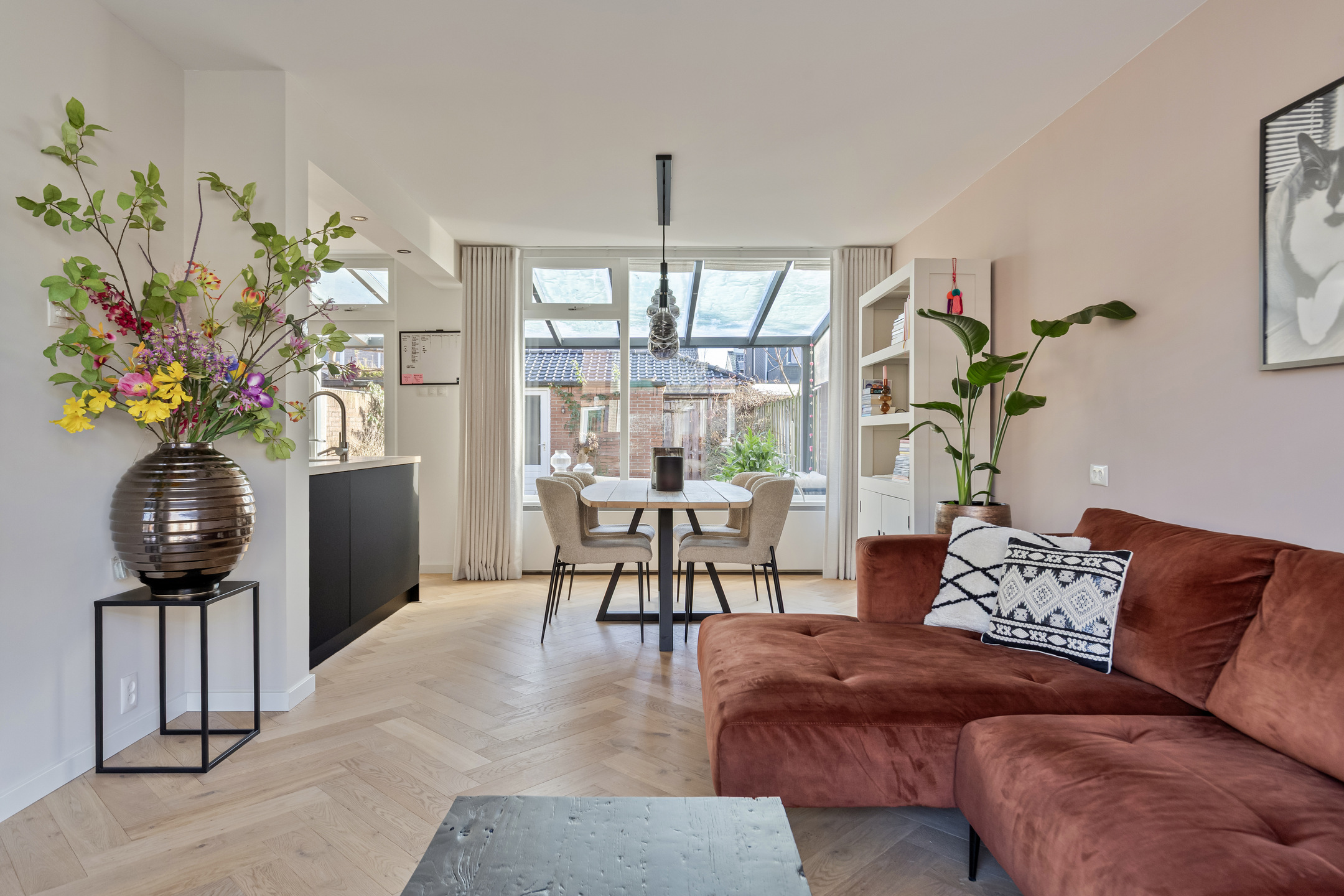De woonkamer is voorzien van een op maat gemaakte stalen deur, een eikenhouten vloer met visgraat motief en staat in open verbinding met de keuken. De keuken is in 2021 vernieuwd en heeft een strakke, stoere uitstraling dankzij de zwarte fronten en het kunststof werkblad met houtlook.