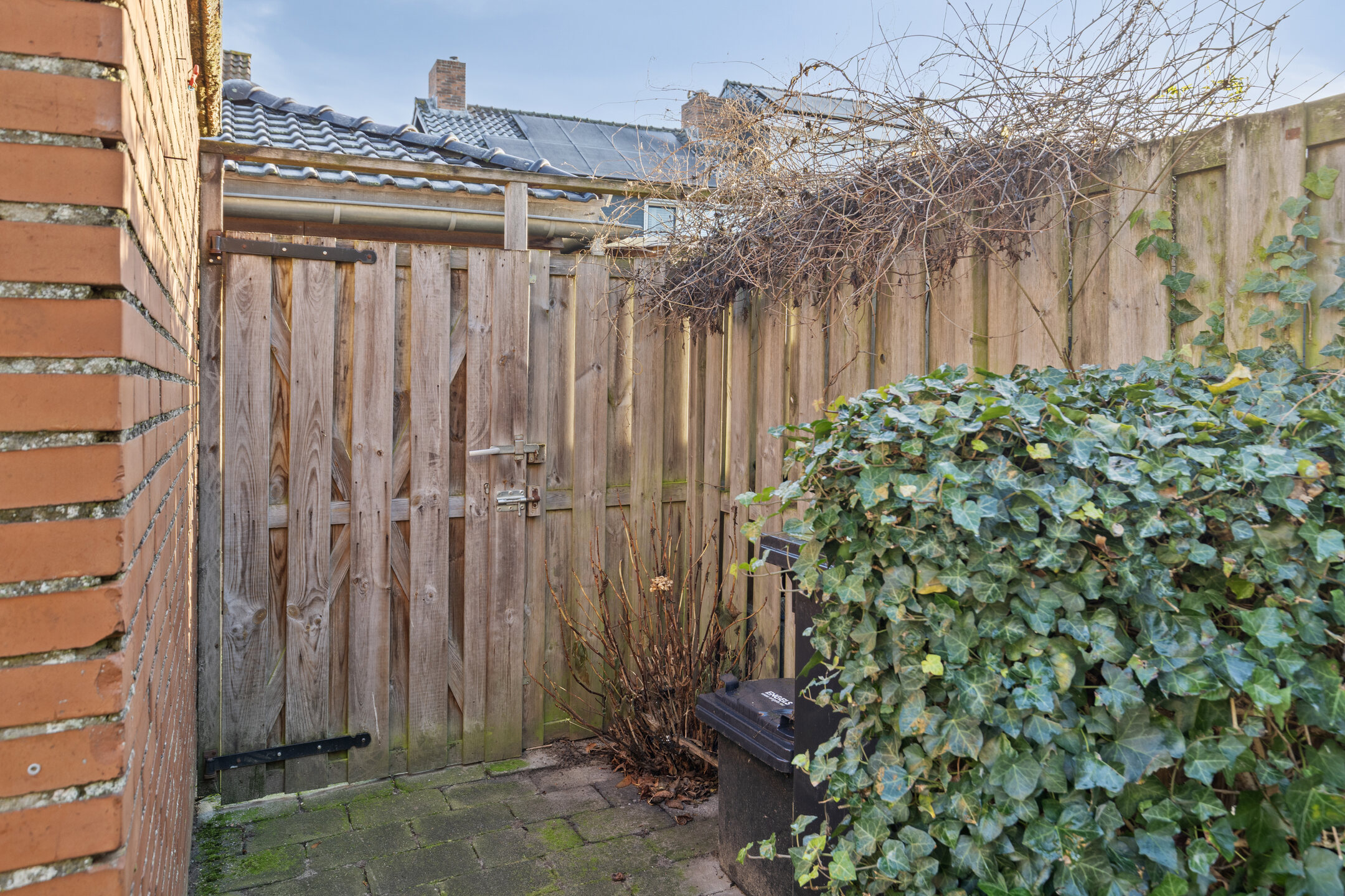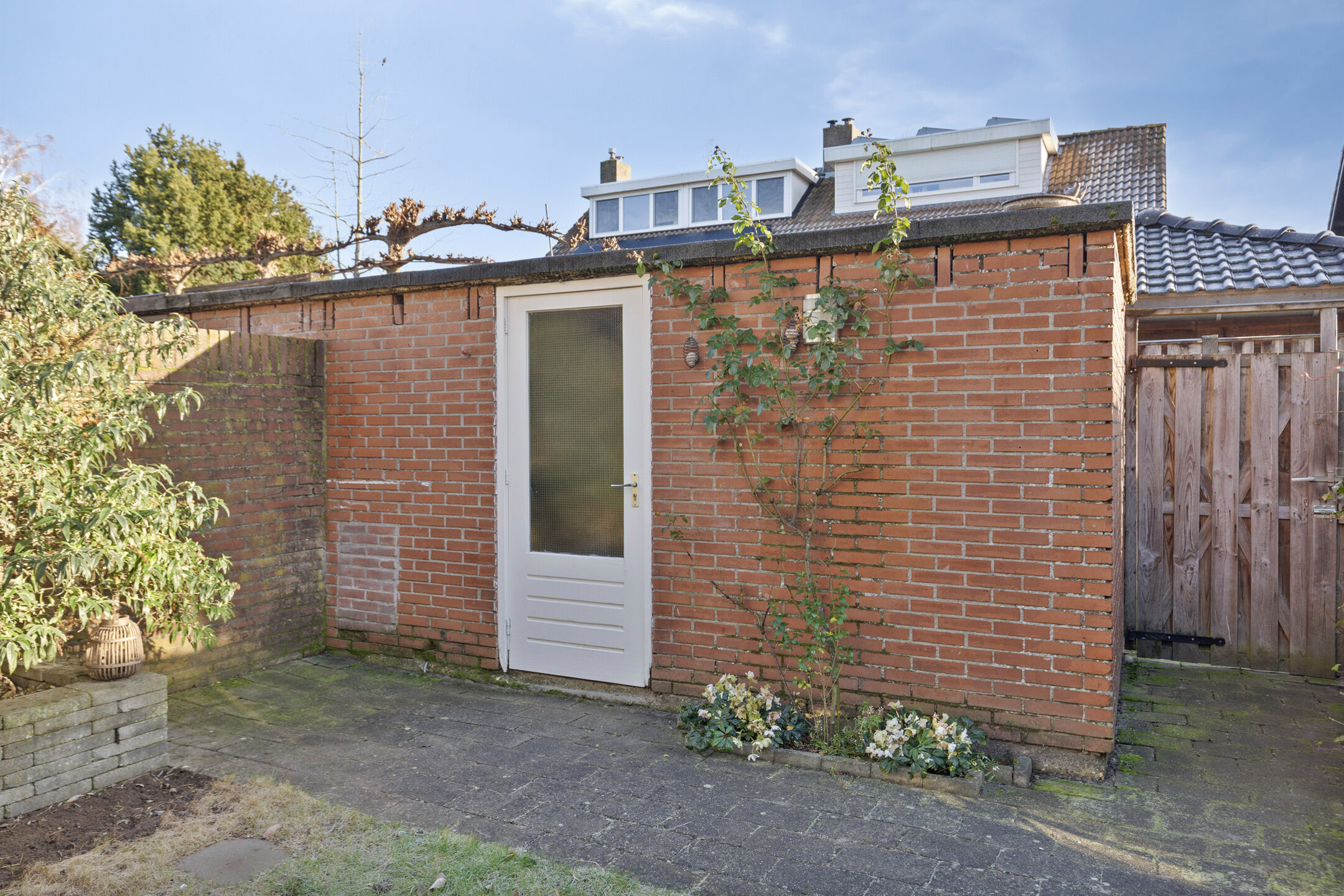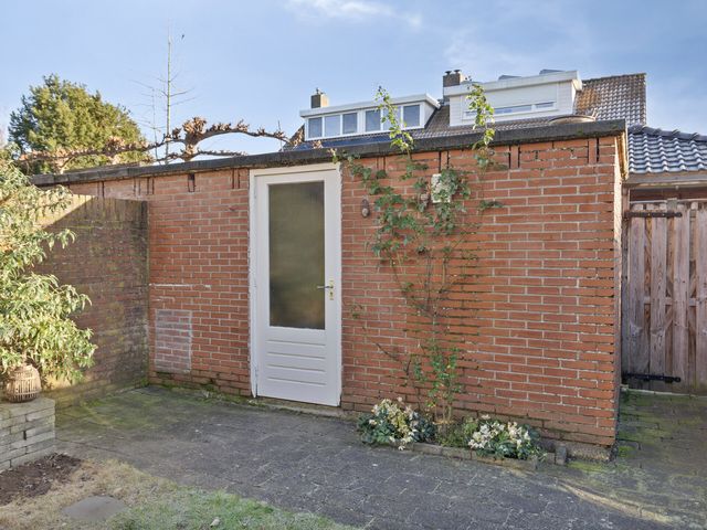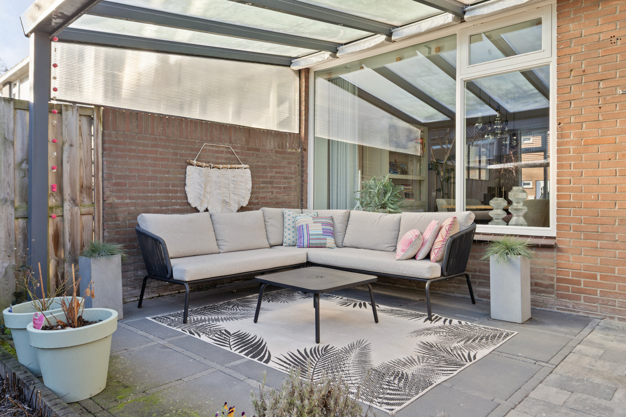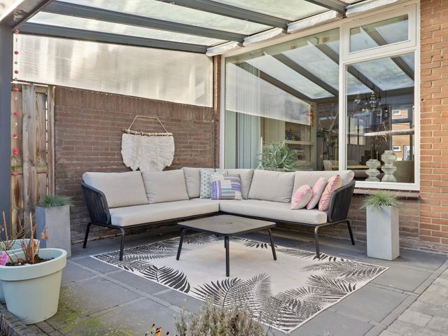De achtertuin, gelegen op het oosten, is ingericht met een gazon, vaste beplanting, stenen berging met elektra en een achterom. Over de volledige breedte van de woning is een terrasoverkapping geplaatst met glazen dak, wat zorgt voor veel lichtinval in de woonkamer. Met de handmatig bedienbare screens creëert u desgewenst schaduw.