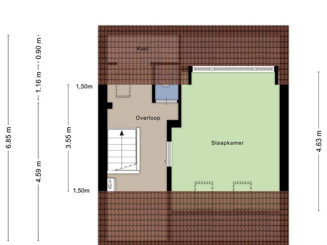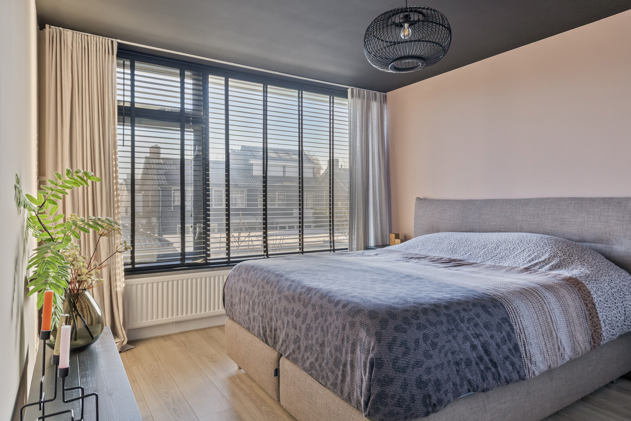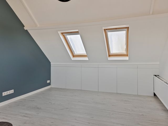 De royale slaapkamer beschikt over twee Velux dakramen aan de voorzijde en een dakkapel aan de achterzijde met elektrisch rolluik. Extra bergruimte is aanwezig achter de knieschotten.