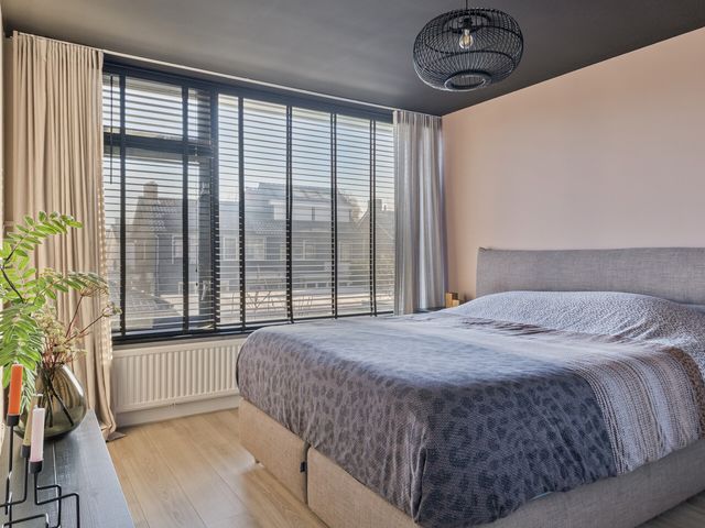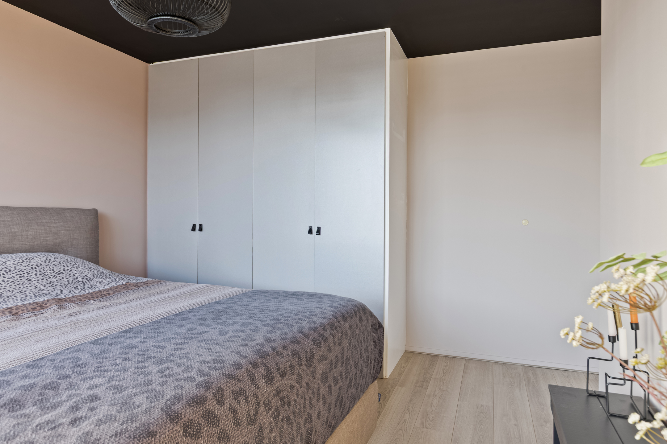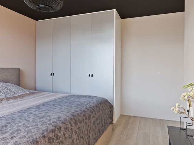 De slaapkamer aan de achterzijde beschikt over een vaste kastenwand.