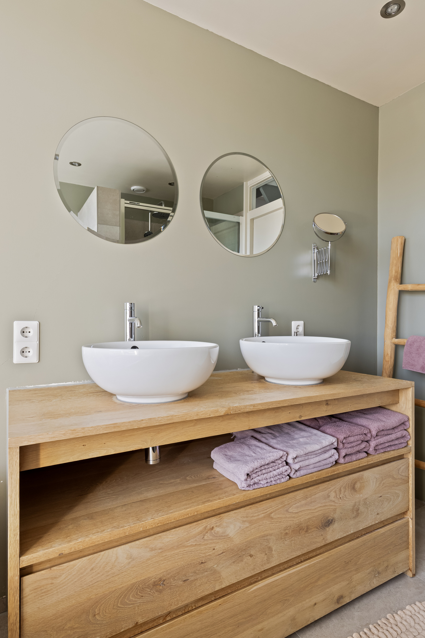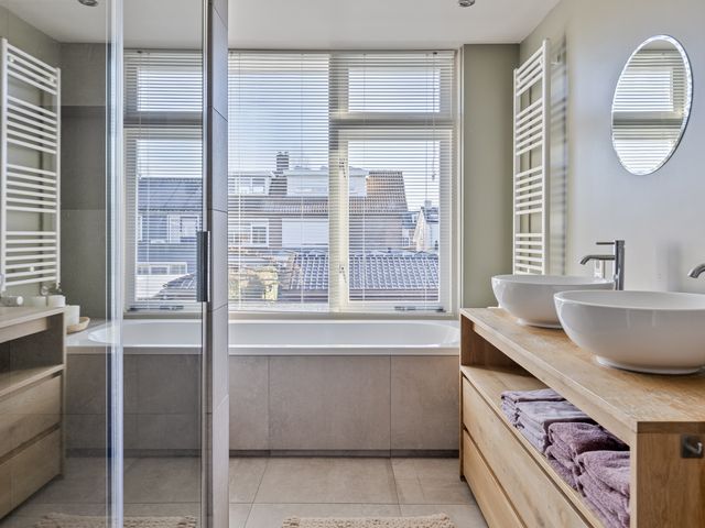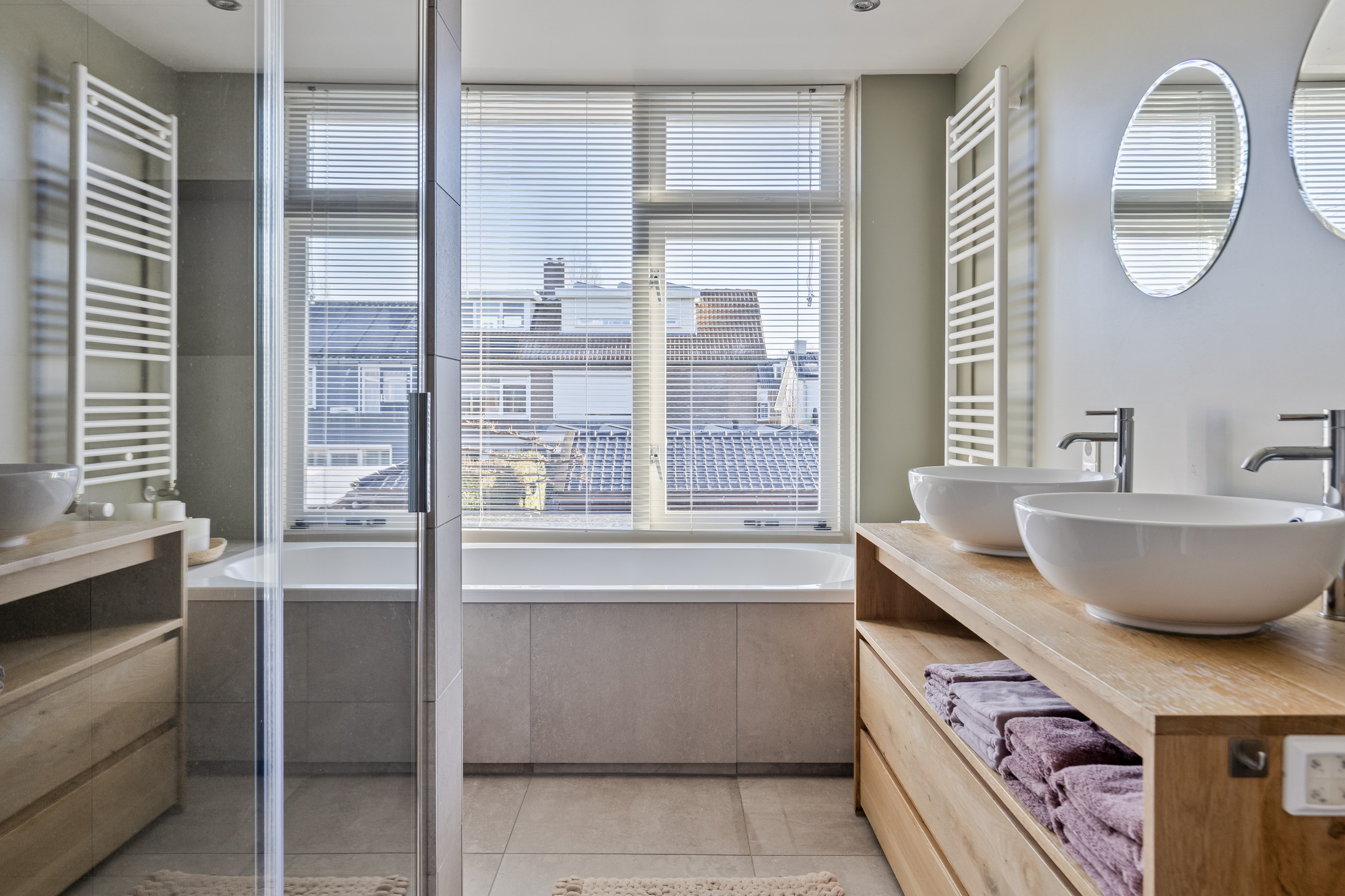 De moderne badkamer is compleet uitgevoerd met ligbad, inloopdouche met regen-/handdouche, houten meubel met dubbele waskommen, wandcloset en designradiator.