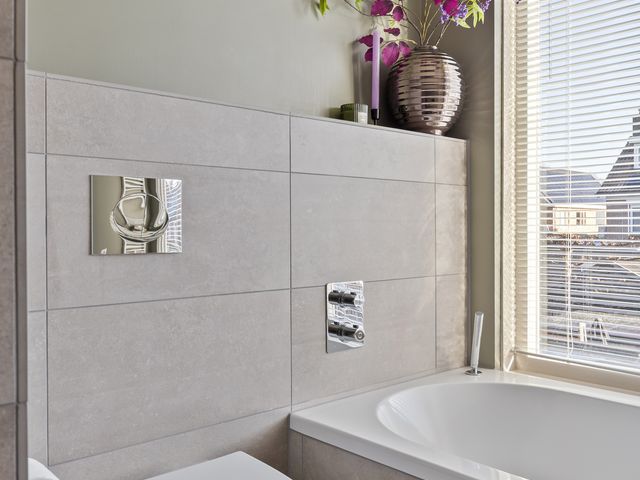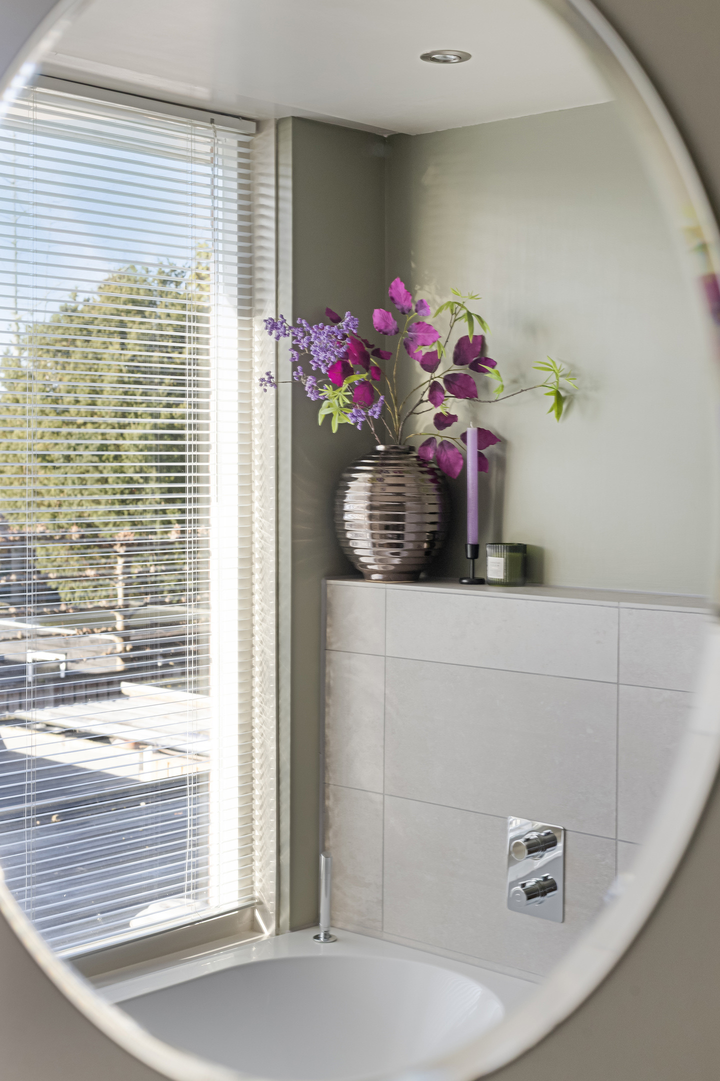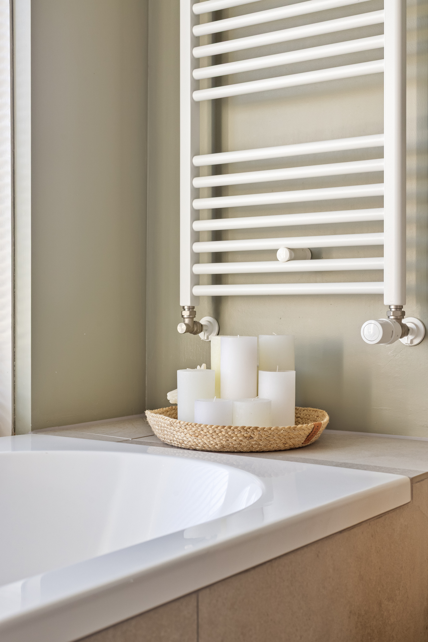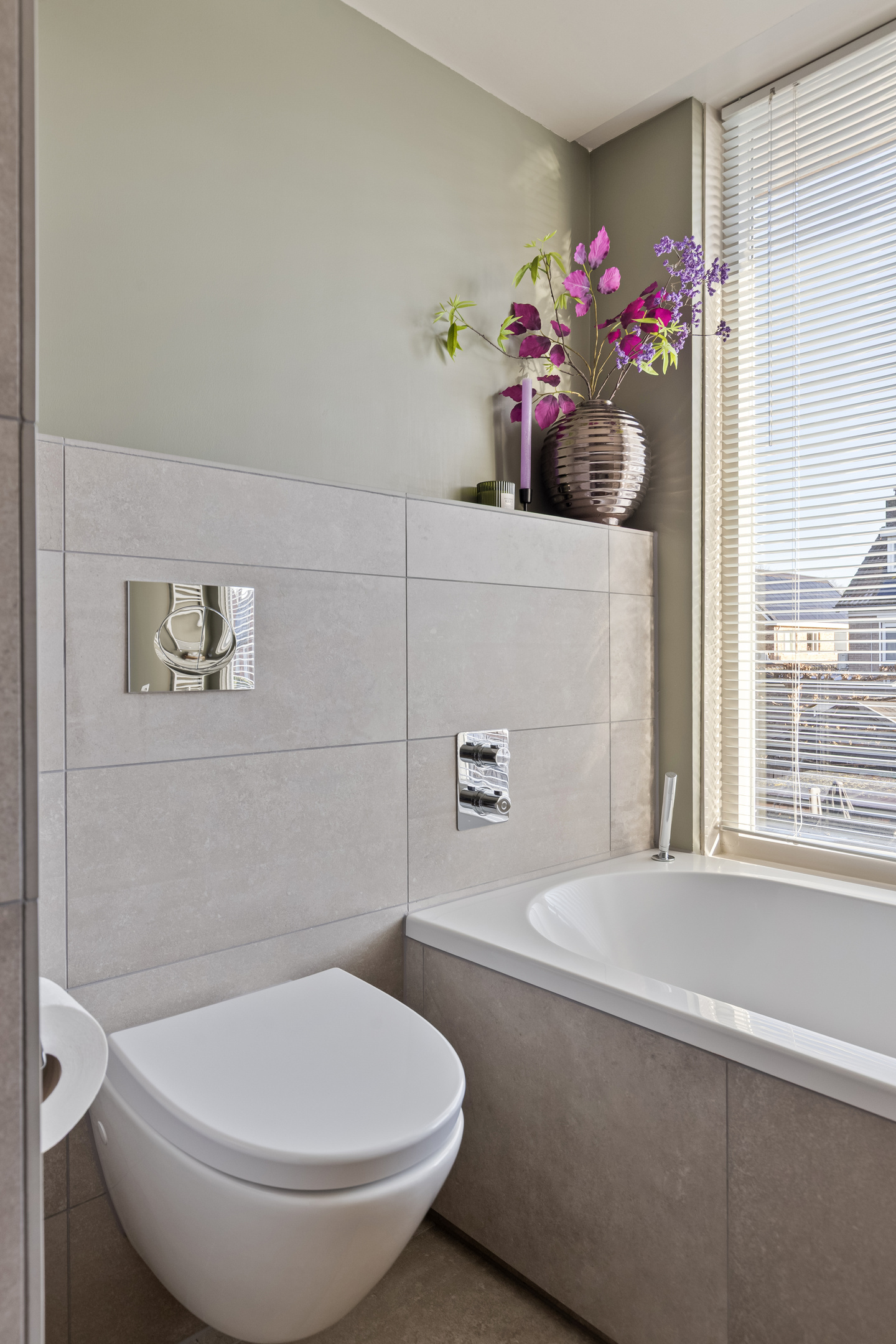 De moderne badkamer is compleet uitgevoerd met ligbad, inloopdouche met regen-/handdouche, houten meubel met dubbele waskommen, wandcloset en designradiator.