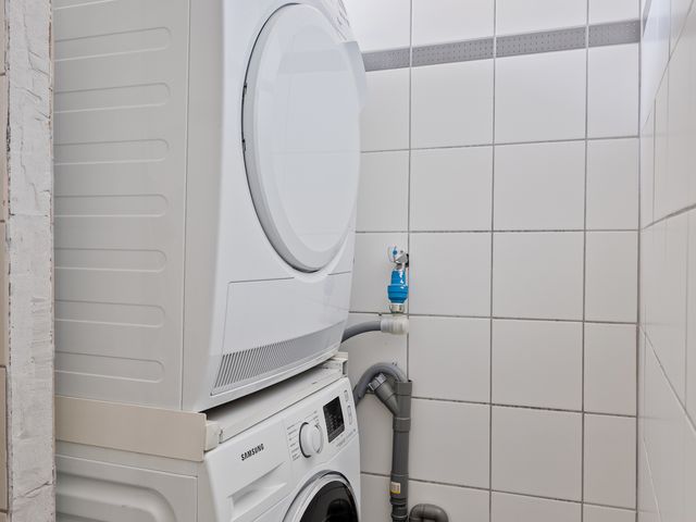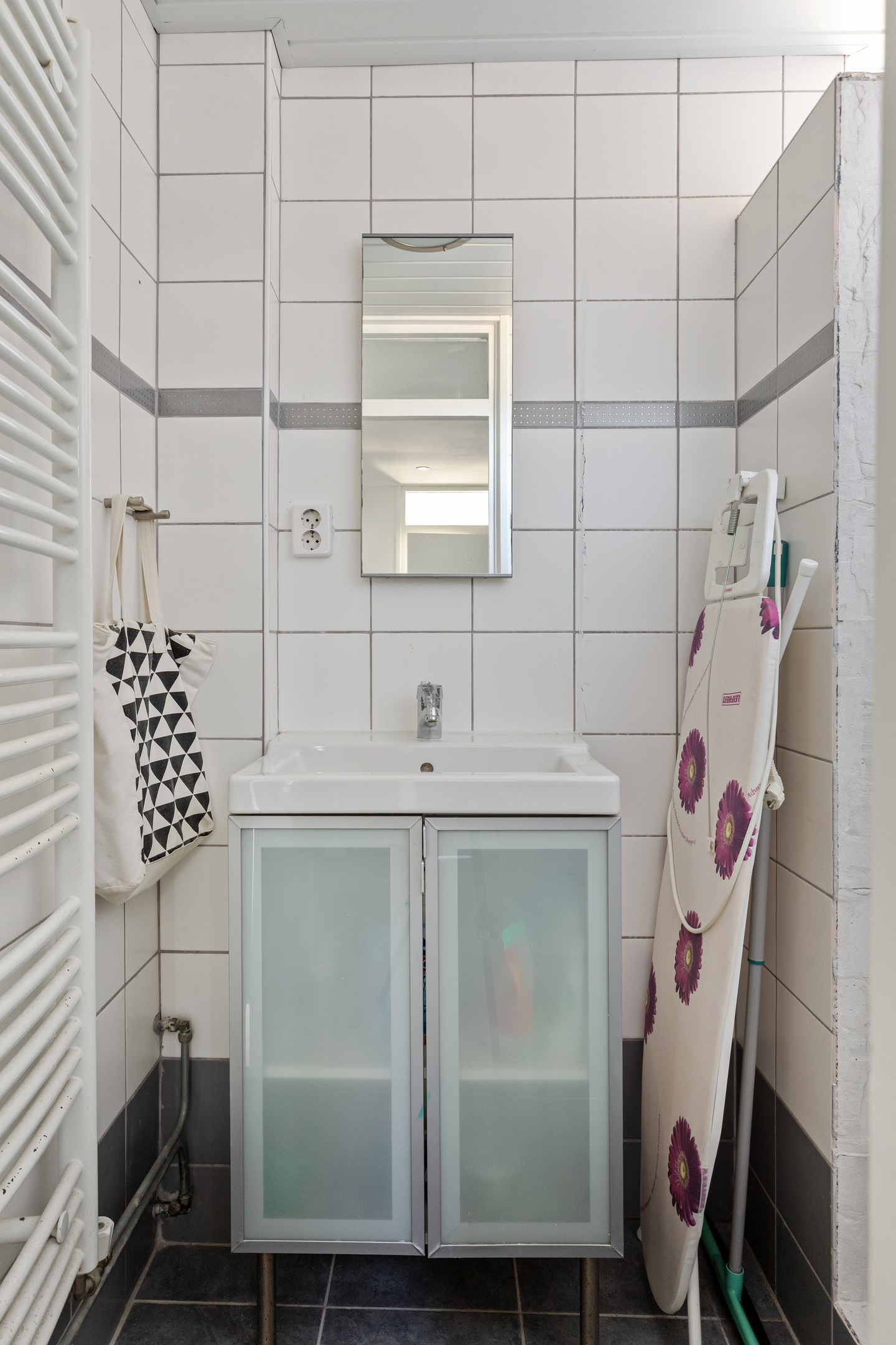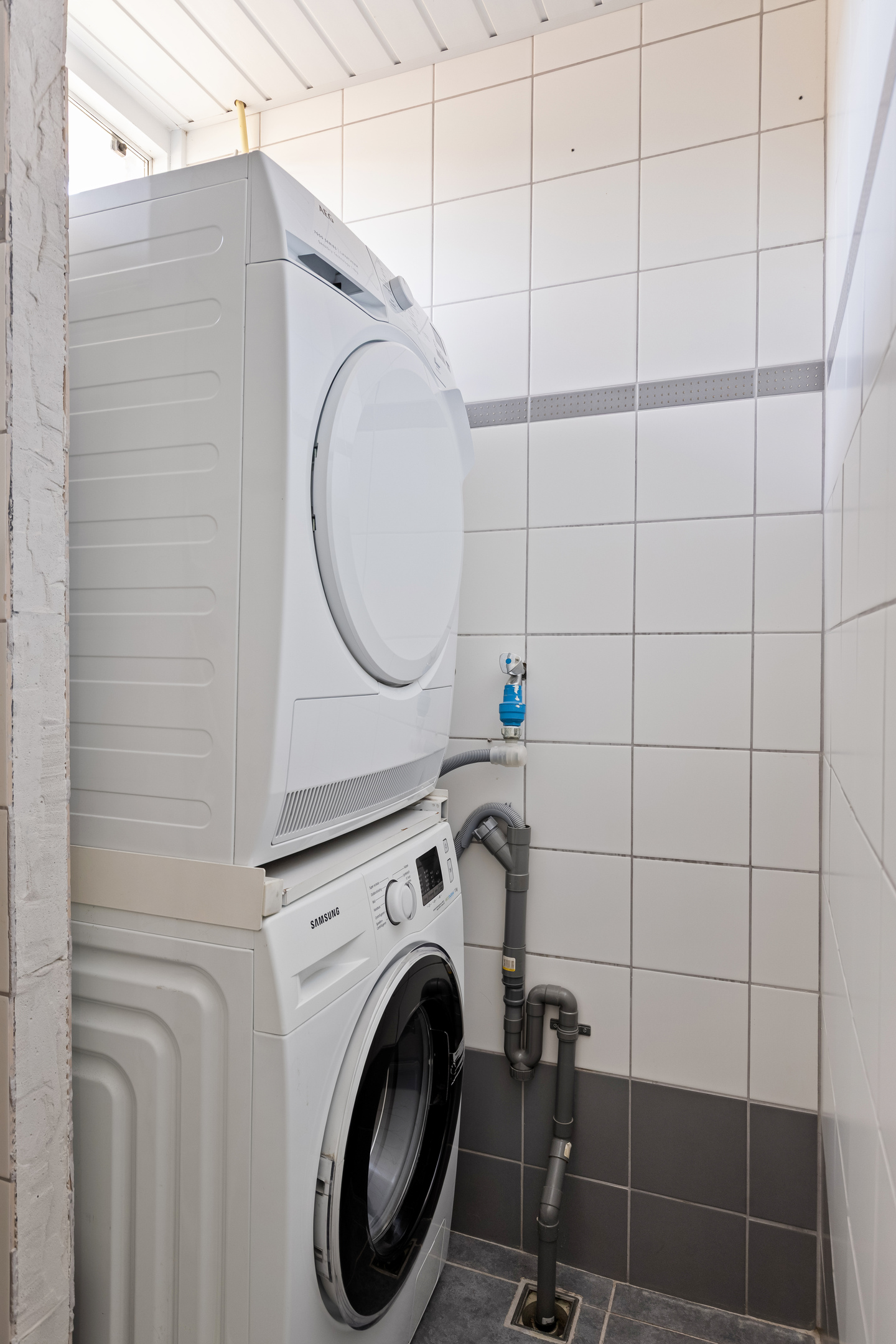 De separate wasruimte is voorzien van aansluitingen voor een wasmachine en droger, een extra wastafel met wastafelmeubel en designradiator.