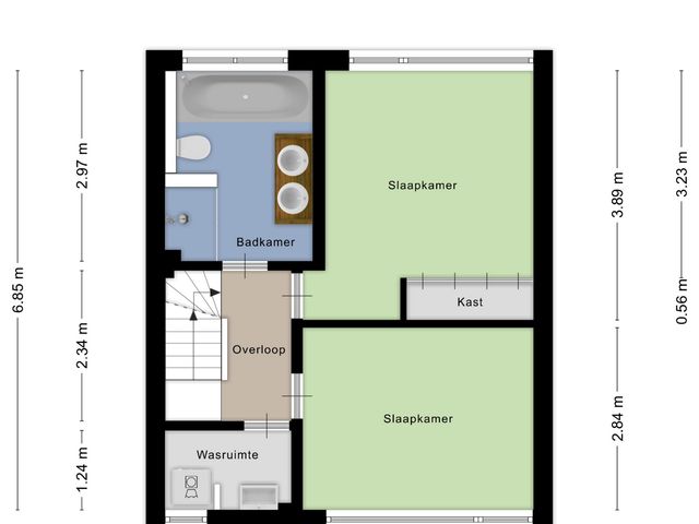 De overloop geeft toegang tot twee slaapkamers, de badkamer, een wasruimte (voorheen badkamer) en de trap naar de tweede verdieping.