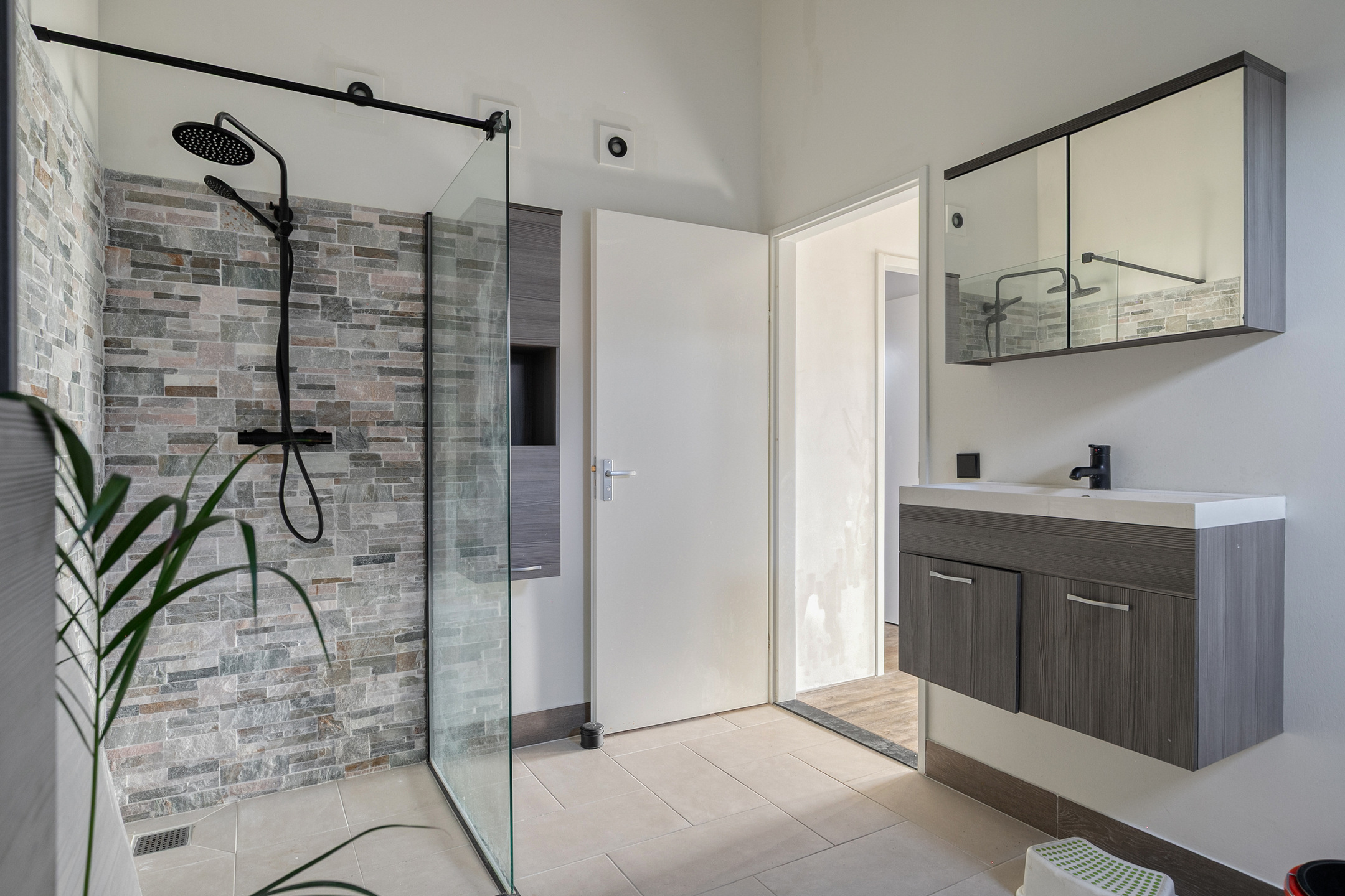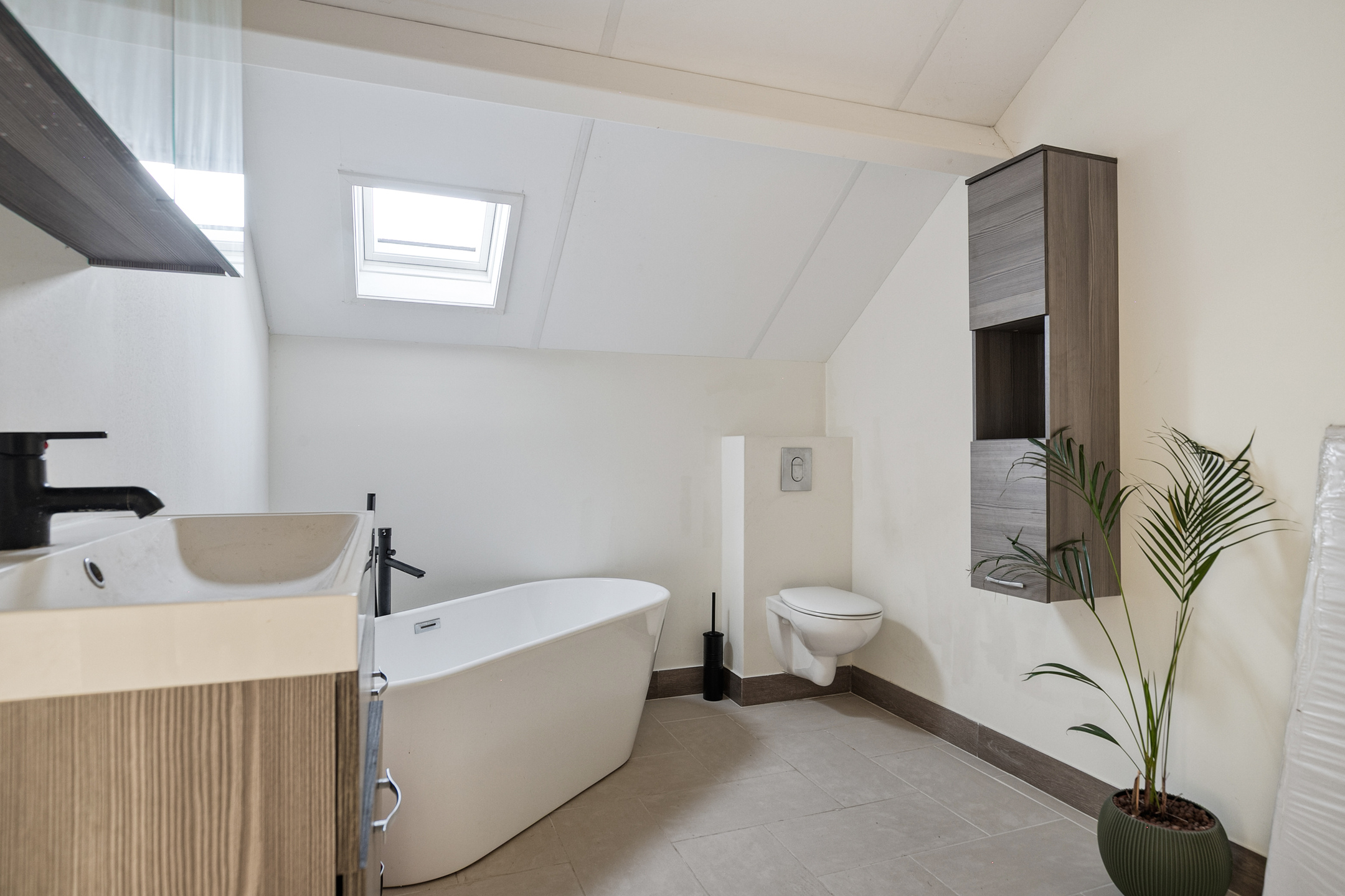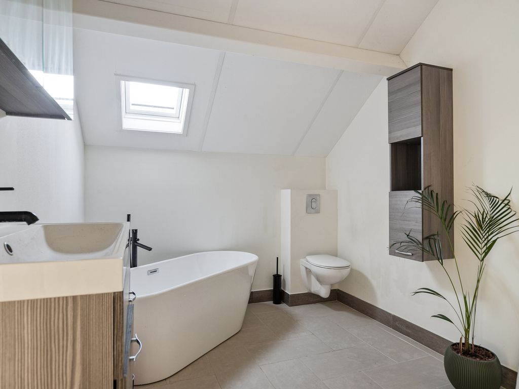 De luxe badkamer beschikt over zowel een ligbad als een inloopdouche met thermostaatkraan, een brede wastafelmeubel en toilet.