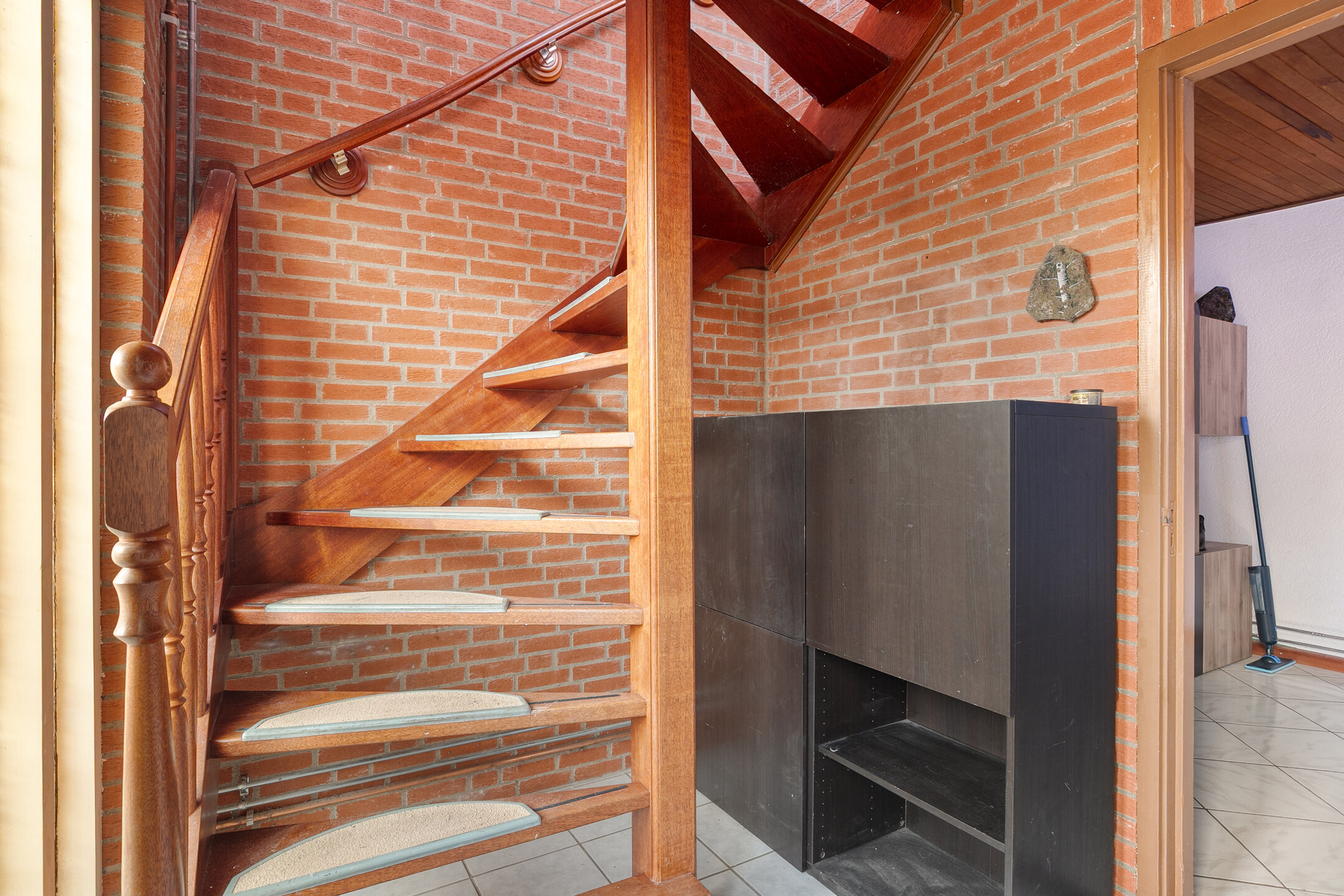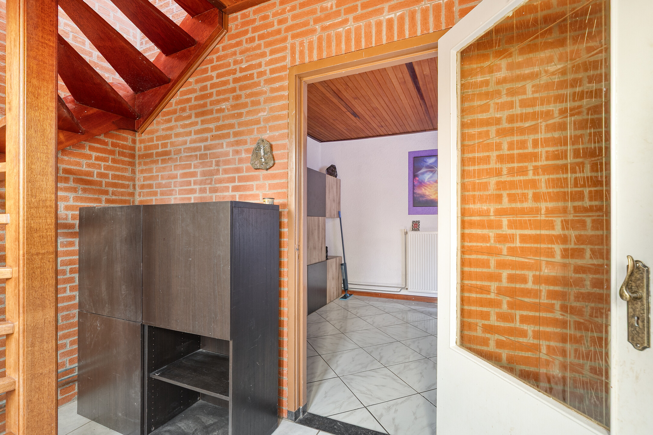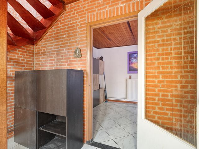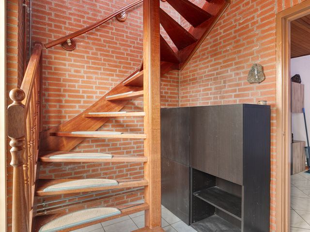 De entree biedt toeging tot de woonkamer, is voorzien van de meterkast en een houten trap naar de eerste verdieping.