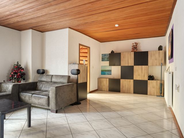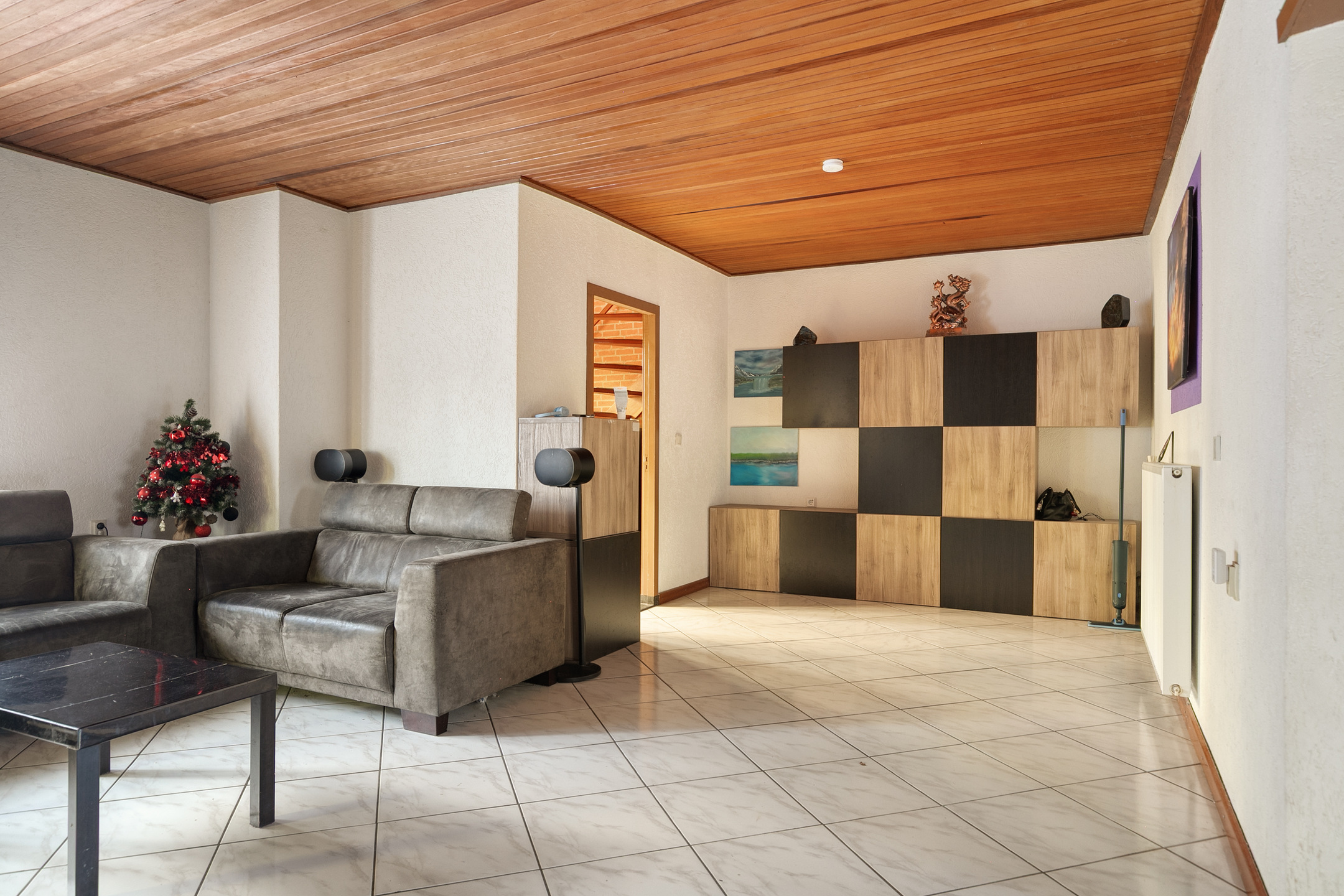 De woonkamer is voorzien van een tegelvloer en biedt toegang naar de gesloten keuken.