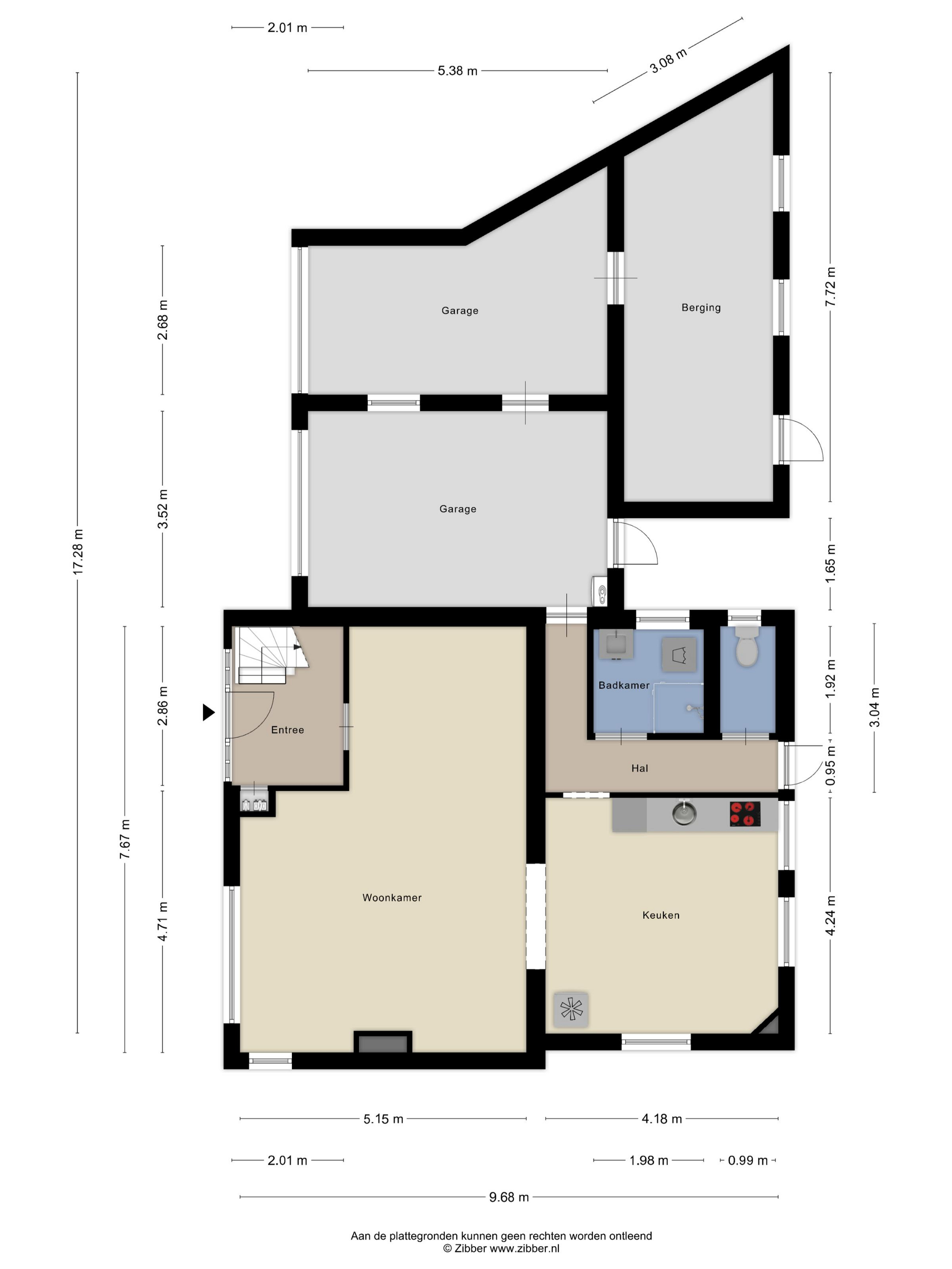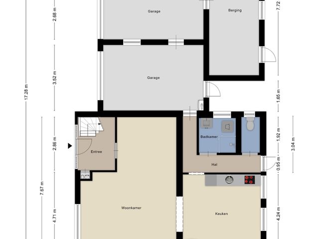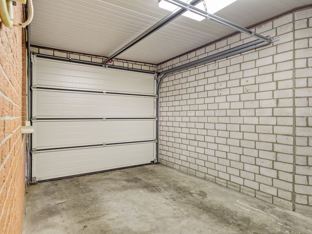 Vanuit de keuken kom je in de hal waar de compacte badkamer, toilet en garages te bereiken zijn.