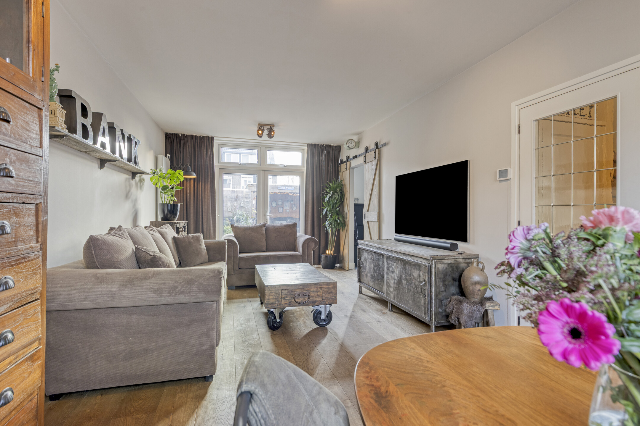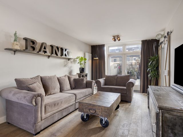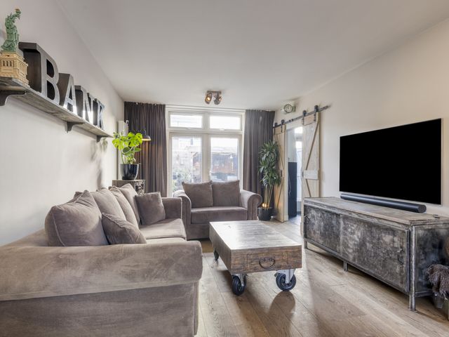 De sfeervolle woonkamer heeft een groot voorgevelraam, een fraaie glazen achtergevel met openslaande tuindeuren, een designradiator en staat in semi-open verbinding met de eigentijdse inbouwkeuken. Hierdoor ontstaat er een prettig ruimtelijk gevoel.