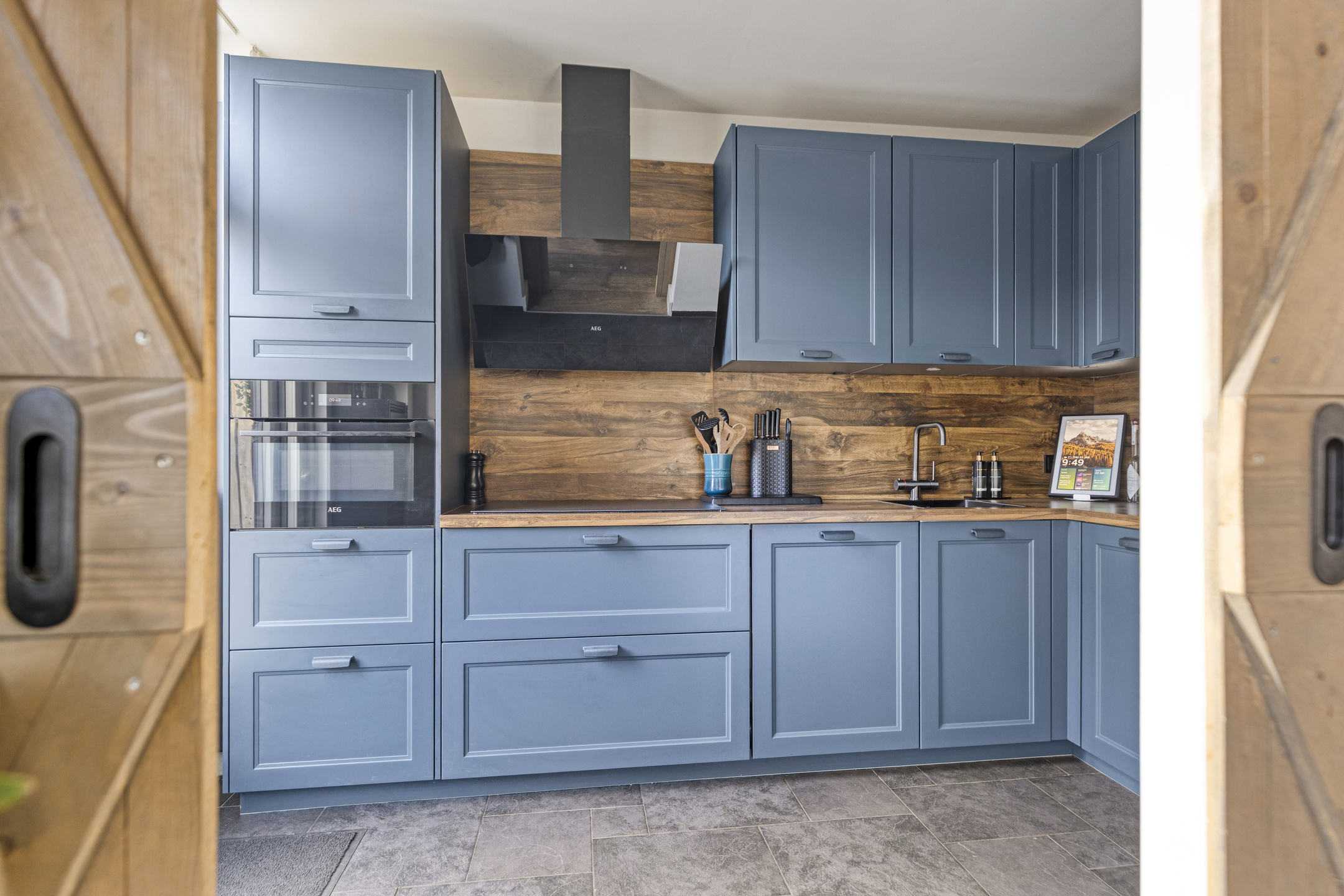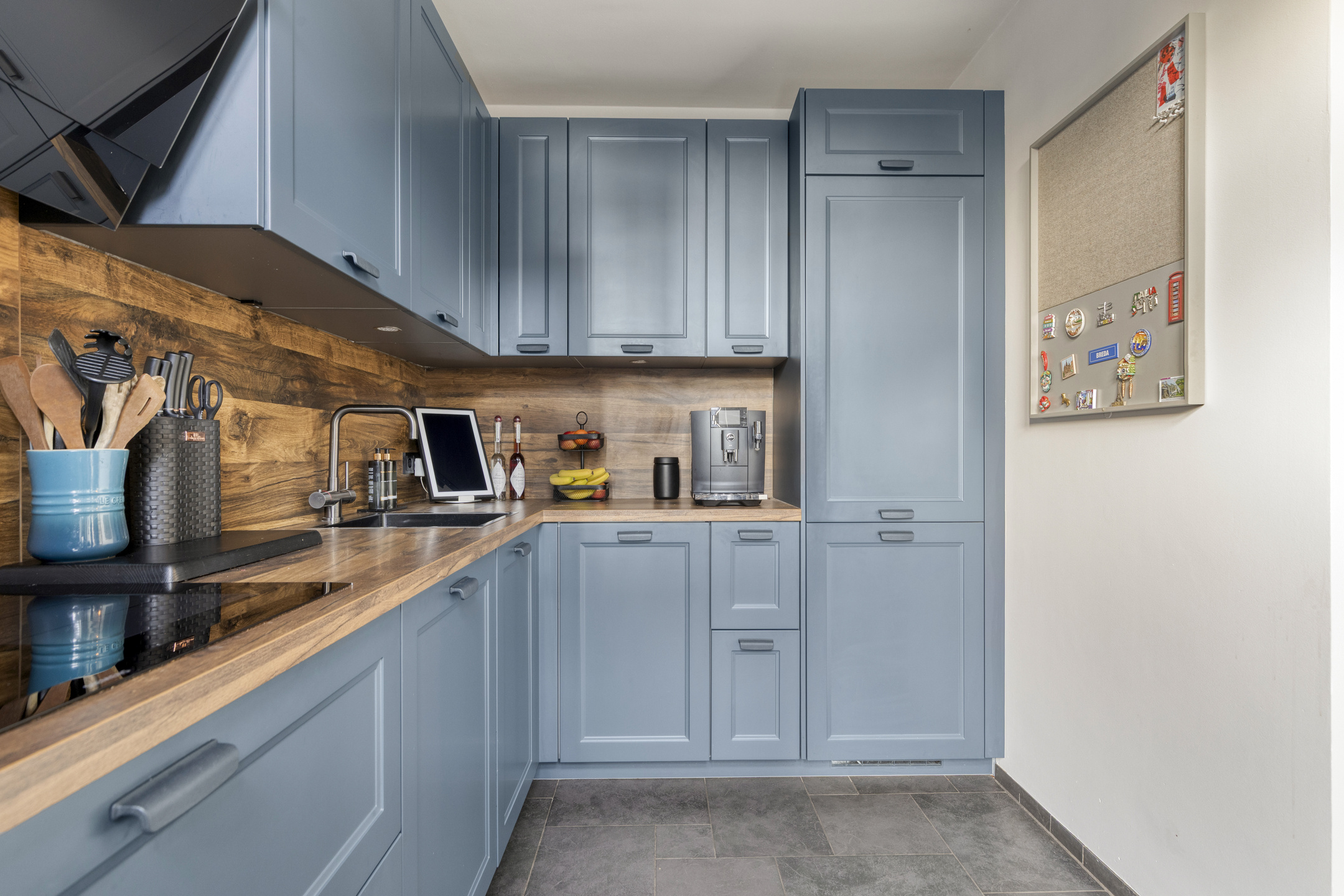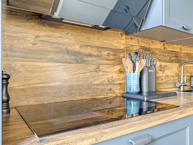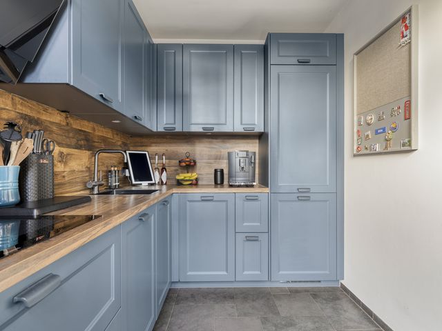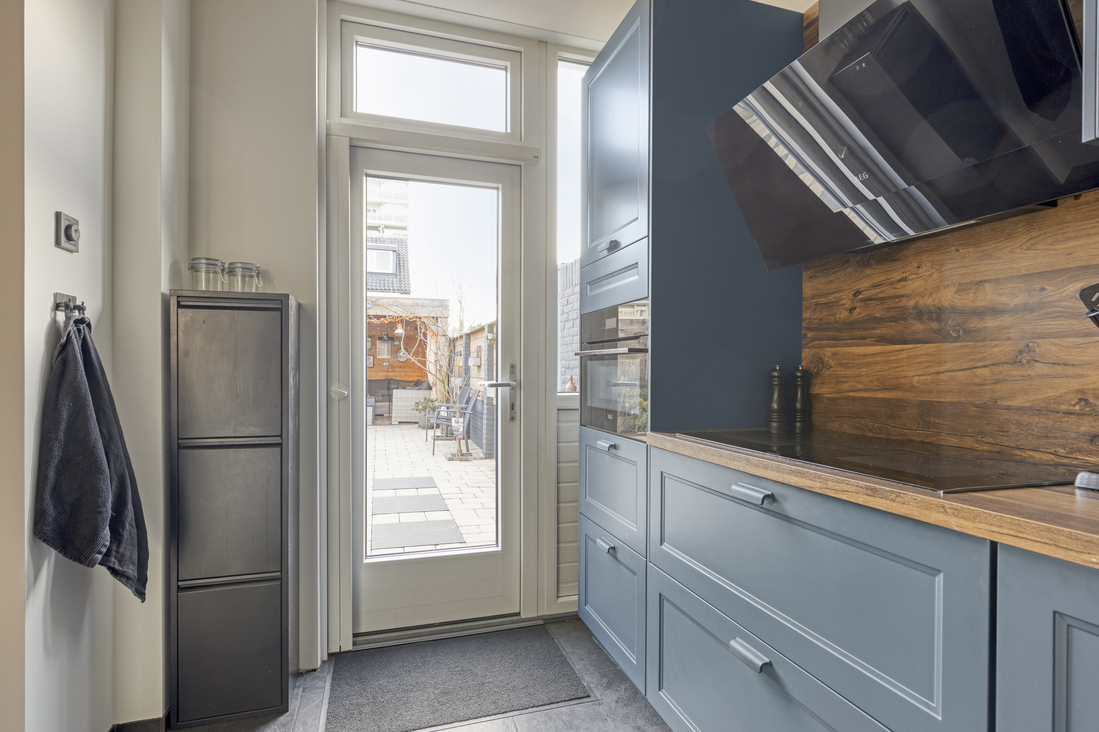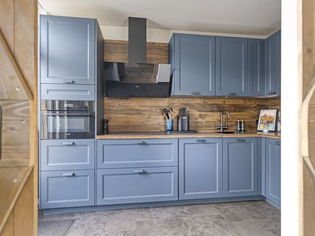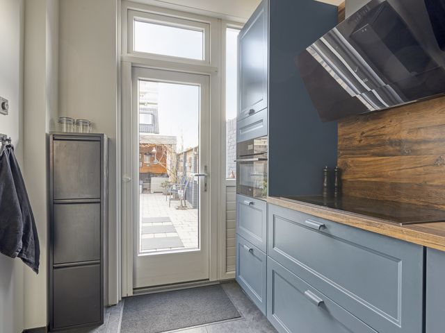 De aangrenzende, stoere, halfopen inbouwkeuken met een loopdeur naar de diepe tuin, ligt aan de achterzijde. Deze eigentijdse, complete L-vormige inbouwkeuken (2023), is uitgerust met een design afzuigkap, een inductiekookplaat, combi oven, vaatwasmachine, een handige Selsiuz kraan, een koelkast en een 3-laden diepvriezer.