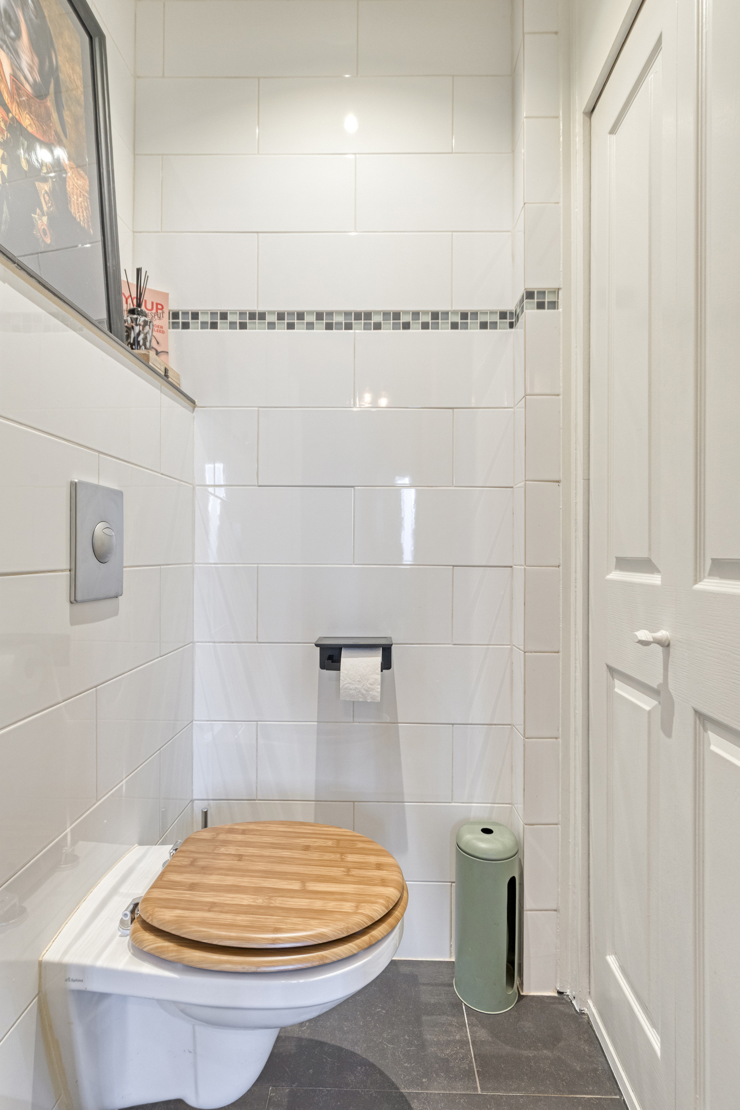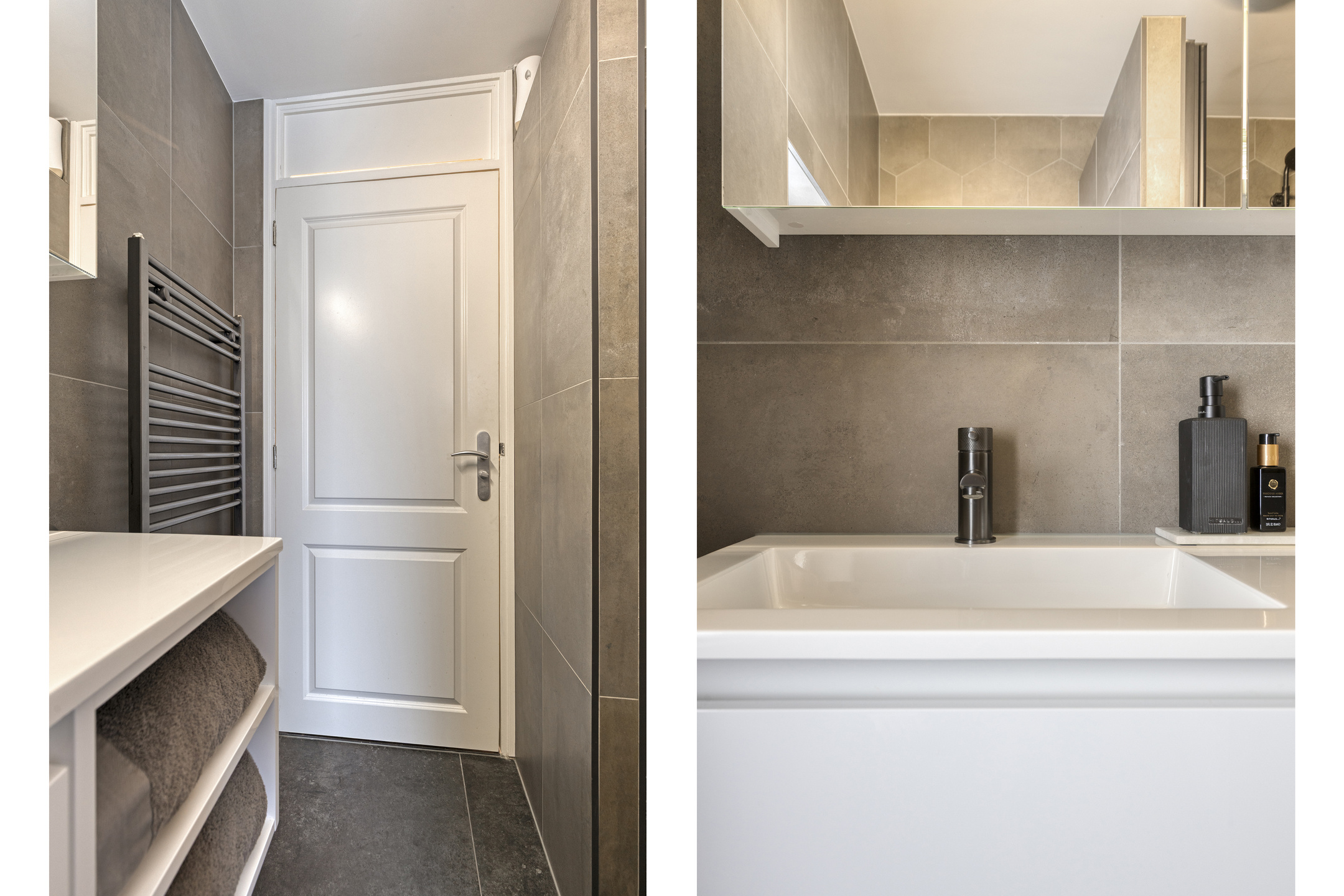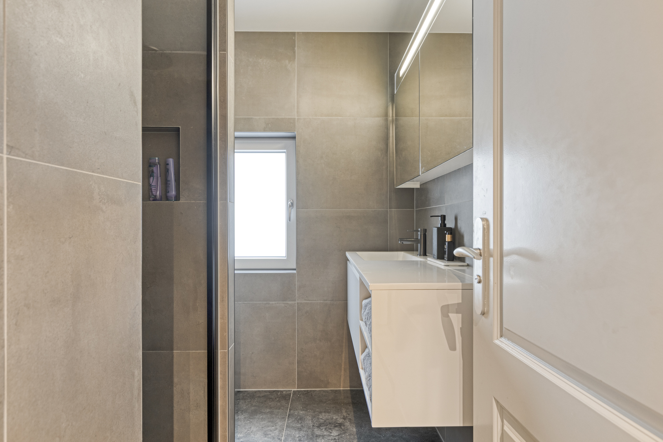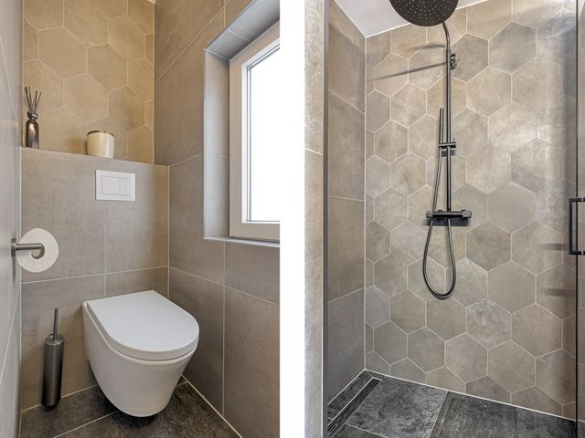 De eigentijdse badkamer (2024) met een voorgevelraam, is voorzien van een praktisch wastafelmeubel, een vrijhangend toilet en een luxe inloopdouche.