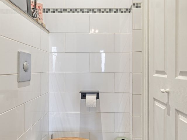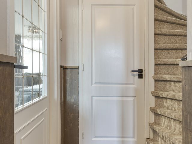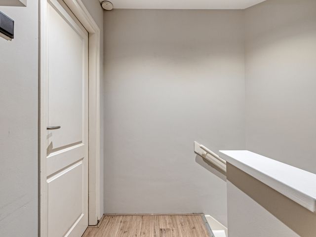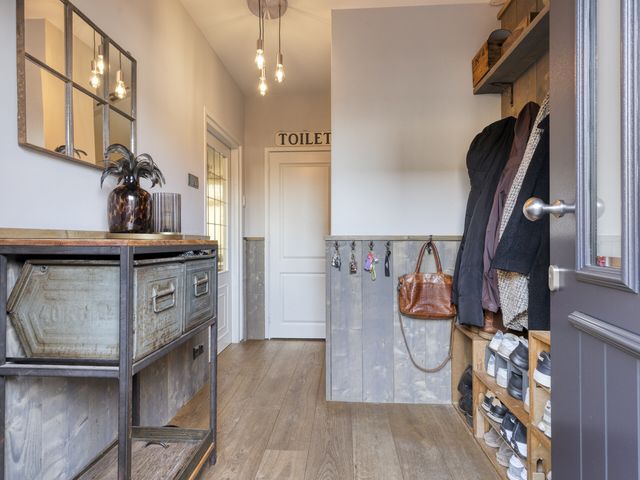 Een royale entree/hal met een garderobenis en een robuuste voordeur met trippel glas. Via de hal zijn het moderne vrijhangend toilet en de verrassend ruime woonkamer te bereiken.