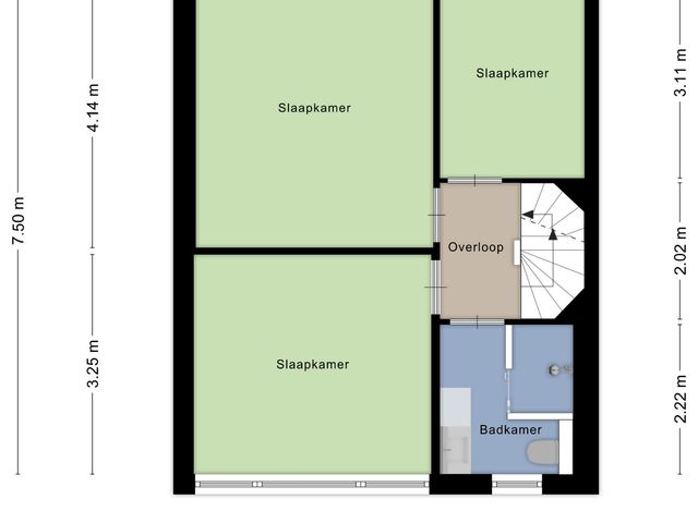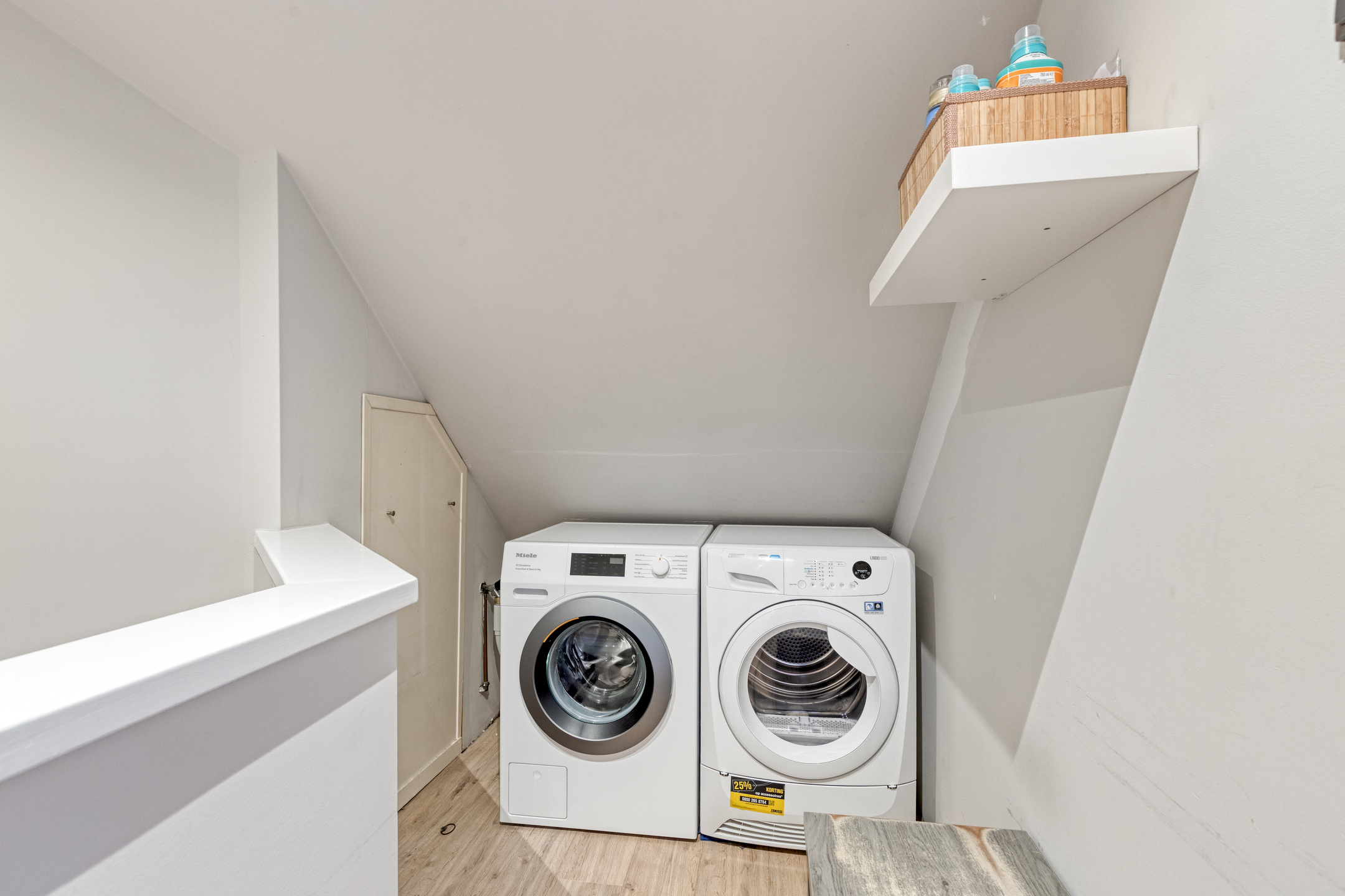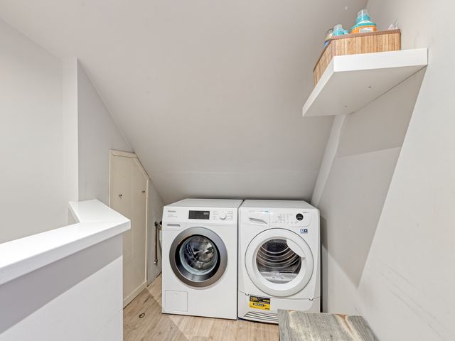 De 2e verdieping (houten constructievloer) is bereikbaar middels een vaste trap, bestaat uit een overloop met een wasmachine-/drogeraansluiting en een riante 4e slaap-/werkkamer.