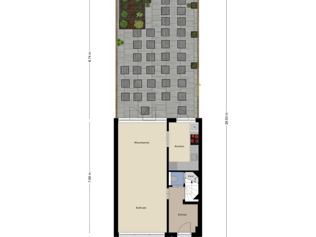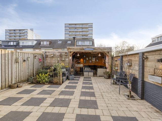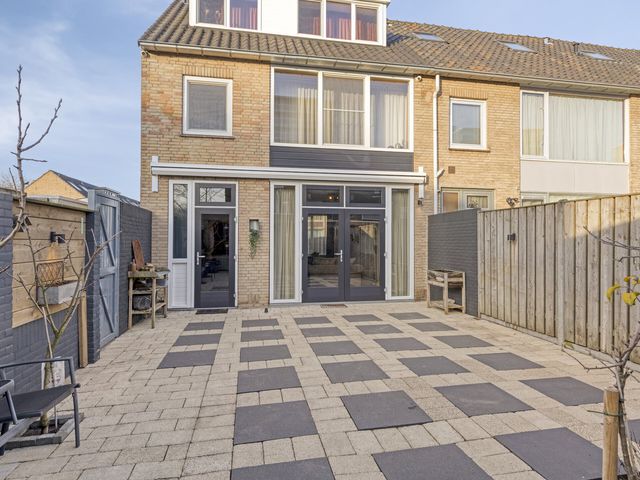 De aantrekkelijke hoekwoning heeft een ideale achtertuin op het oosten. Deze diepe, bijna onderhoudsvriendelijke achtertuin, ca. 12.45 m, biedt voldoende privacy met uitstekende zonmogelijkheden.