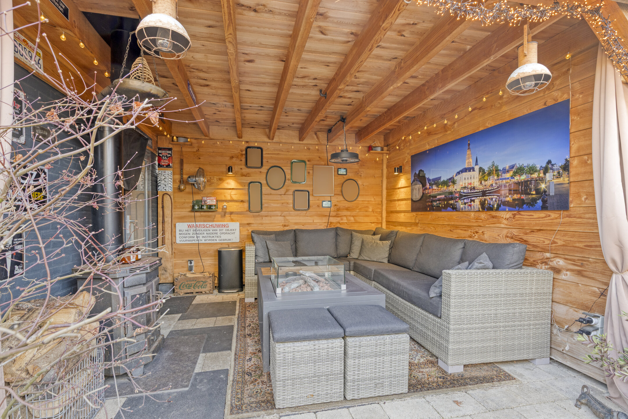 Achterin de tuin staat de stenen berging (met massieve planken aan de buitenzijde betimmerd), ca. 1.93x3.73 m, met elektra en als een extra bonus treft u de perfecte tuinkamer, ca. 3.57x3.66 m - (2020) aan met een sfeervolle tuinhaard. Middels een poort is de brandgang toegankelijk.