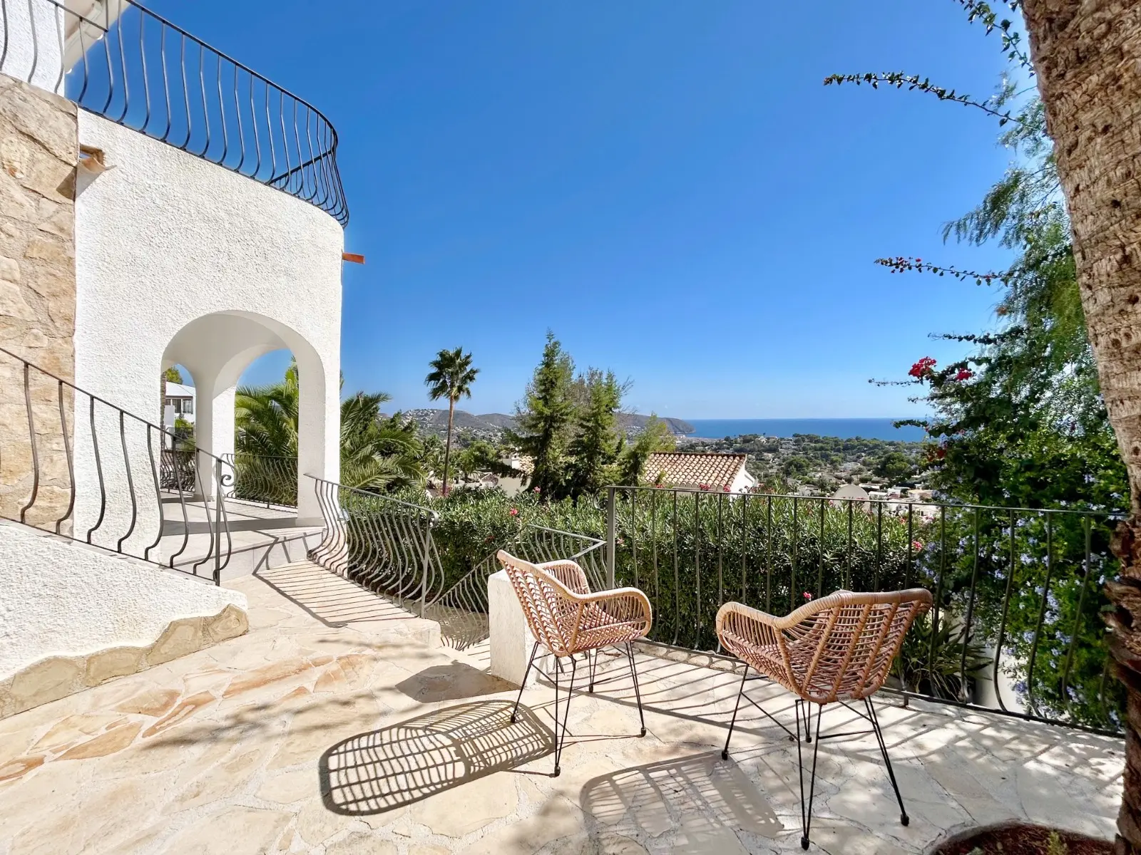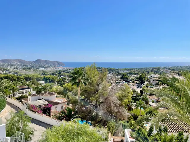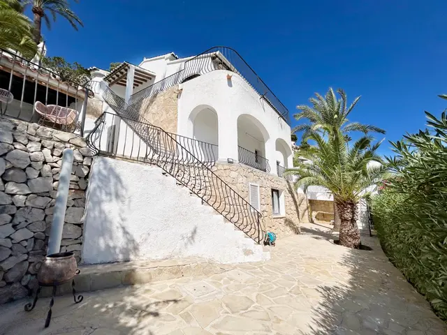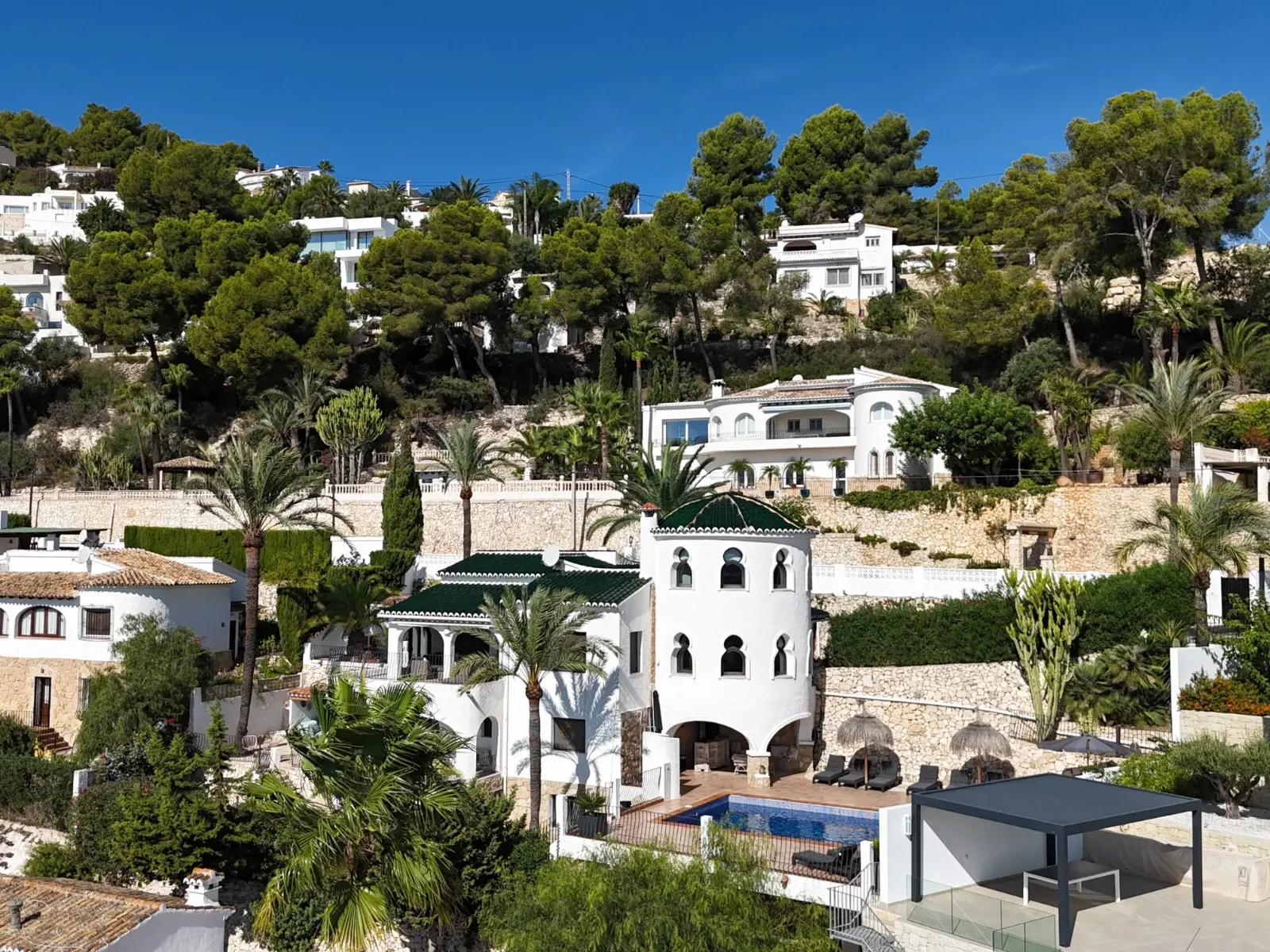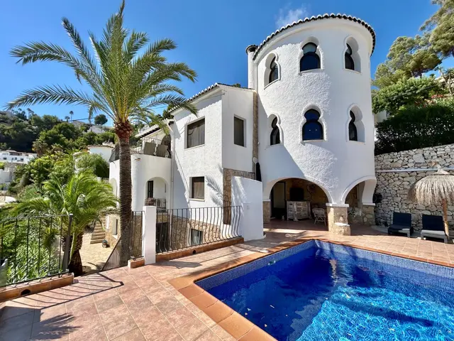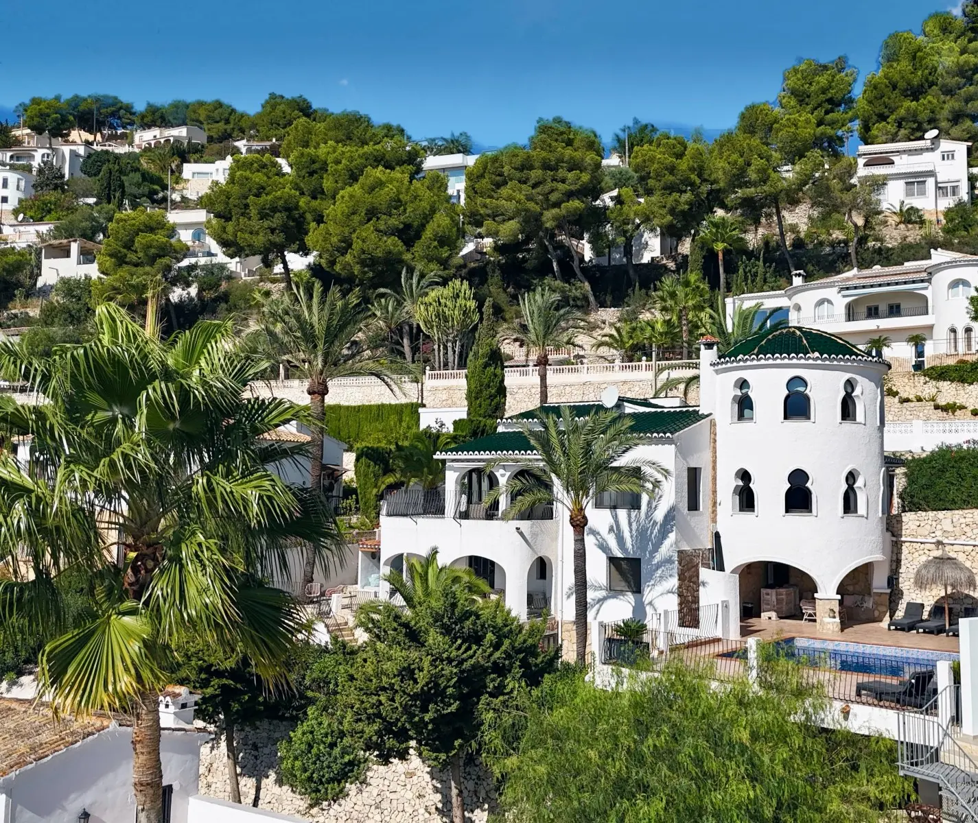 Ruime, heel gezellige woning in de populaire wijk Benimeit met een weids uitzicht over zowel het groen en het centrum van Moraira als het schitterende blauw van de Middellandse Zee. Opvallend detail zijn de ramen in Arabische stijl en de groene dakpannen die de villa een unieke uitstraling geven. Verder vinden we 2 woonlagen, diverse terrassen, een groot zwembadterras met aangrenzend een leuke overdekte lounge/bar ruimte, met het heerlijke zeezicht vanuit alle ruimtes. Tevens biedt de woning nog een aparte wasruimte en een ruime opslagruimte.