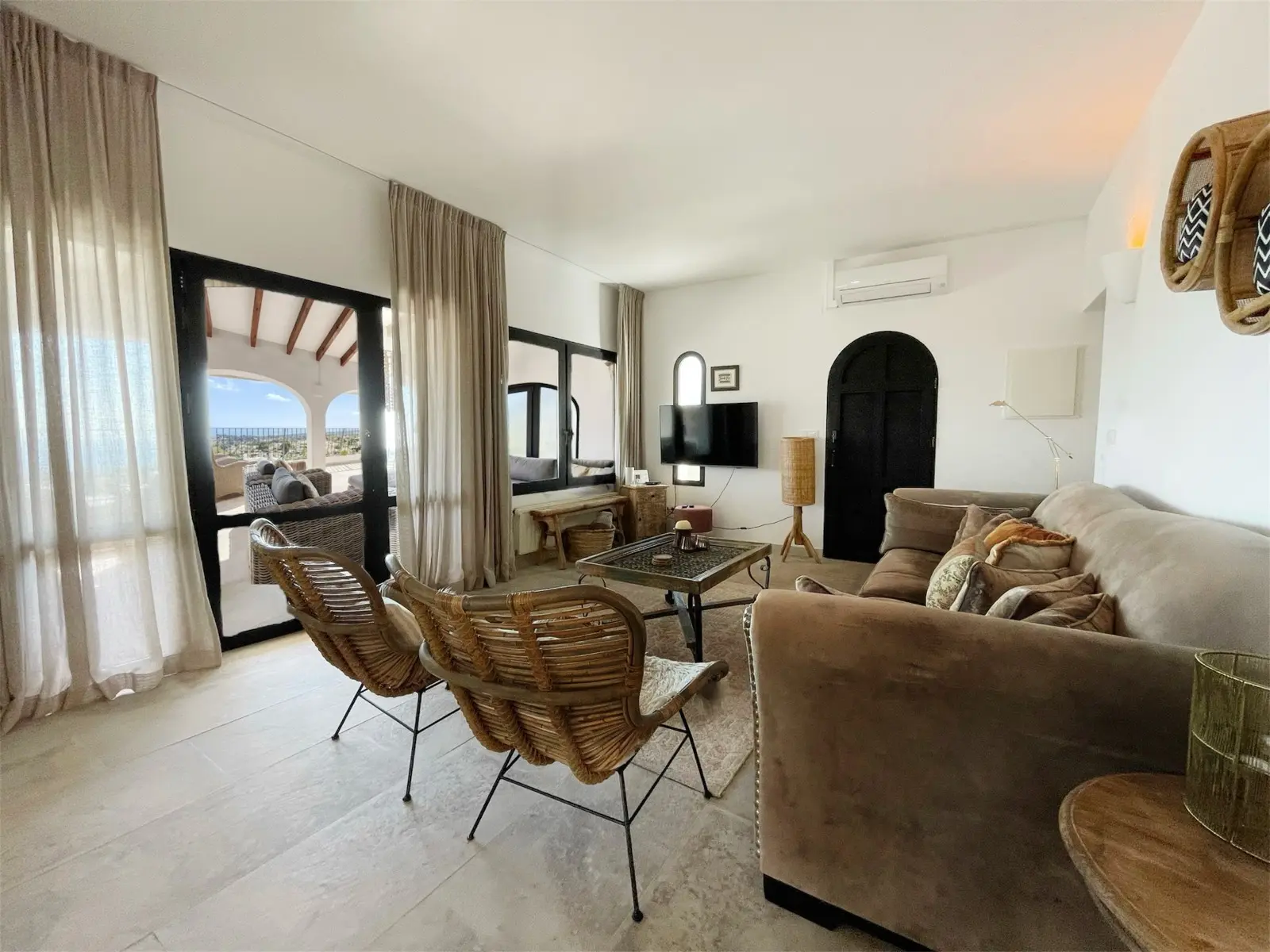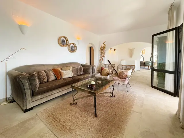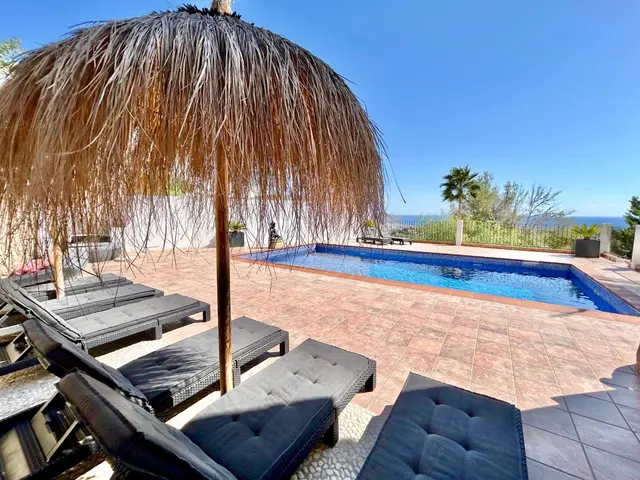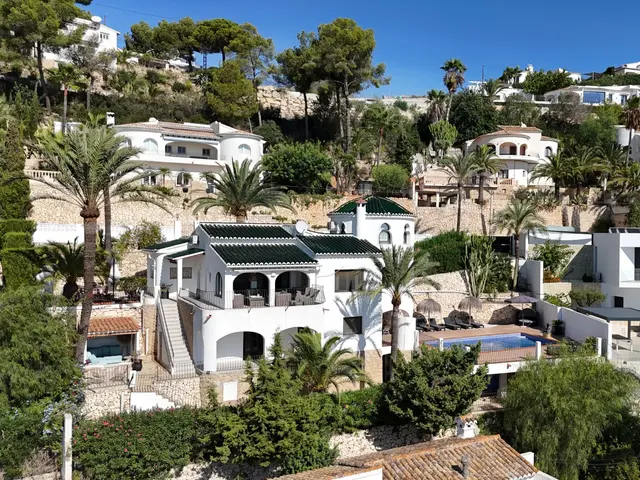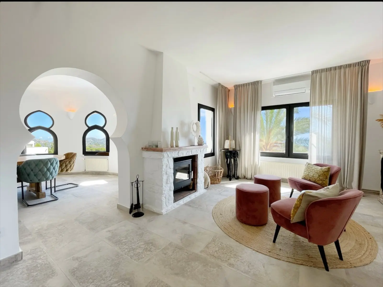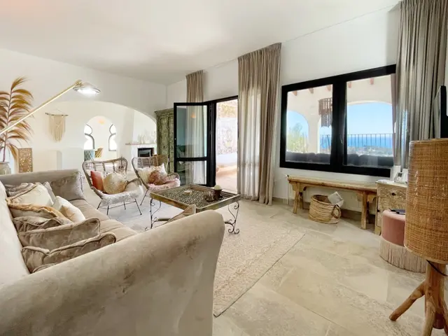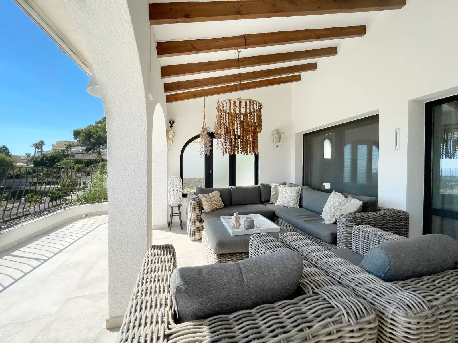 Ruime, heel gezellige woning in de populaire wijk Benimeit met een weids uitzicht over zowel het groen en het centrum van Moraira als het schitterende blauw van de Middellandse Zee. Opvallend detail zijn de ramen in Arabische stijl en de groene dakpannen die de villa een unieke uitstraling geven. Verder vinden we 2 woonlagen, diverse terrassen, een groot zwembadterras met aangrenzend een leuke overdekte lounge/bar ruimte, met het heerlijke zeezicht vanuit alle ruimtes. Tevens biedt de woning nog een aparte wasruimte en een ruime opslagruimte.