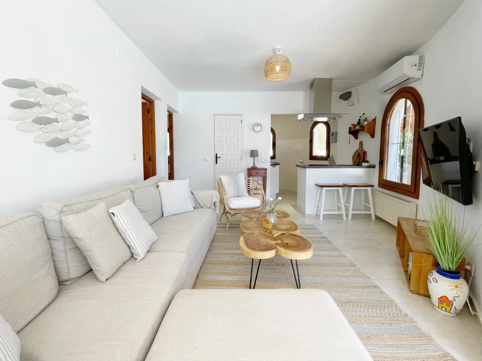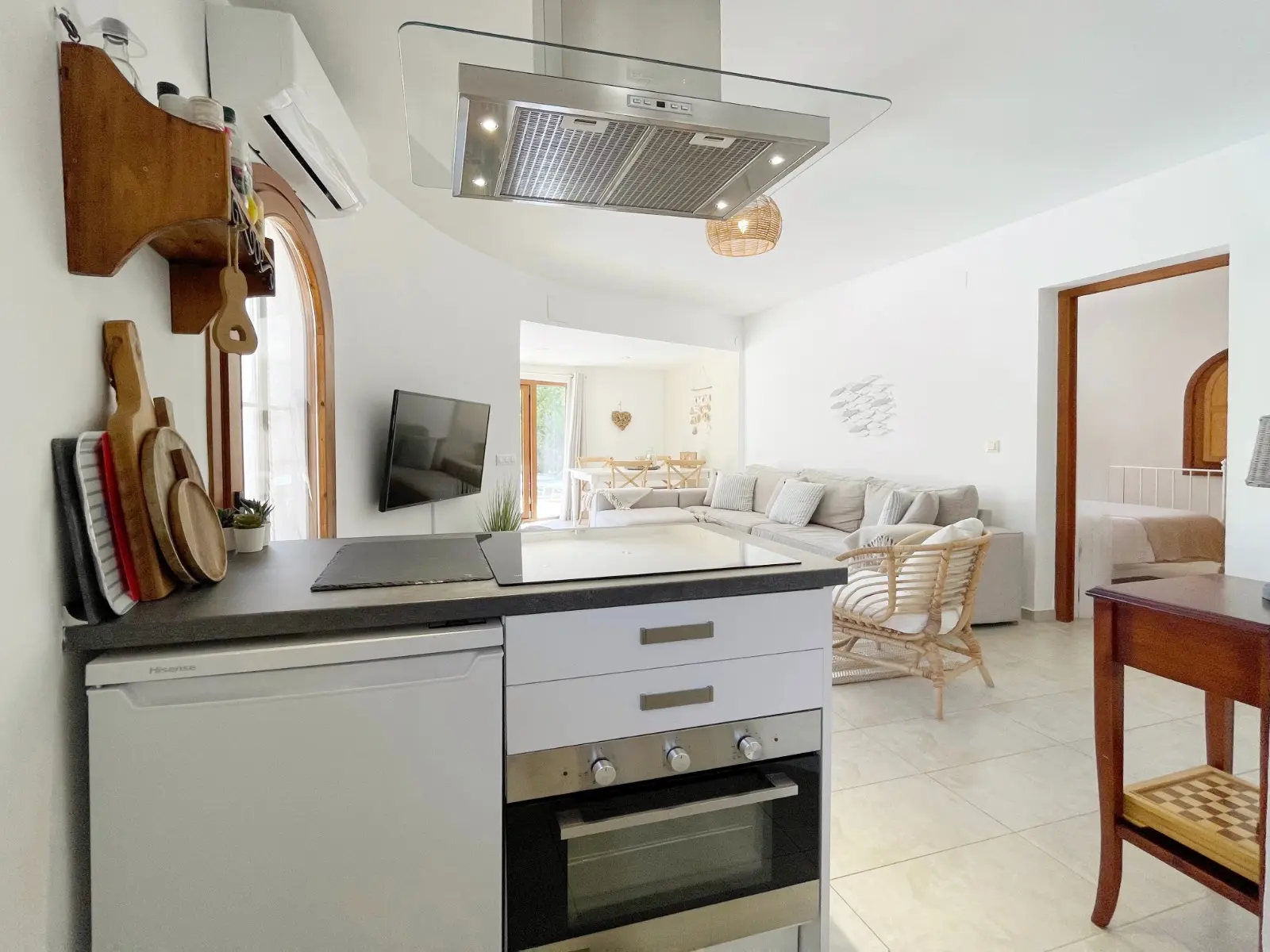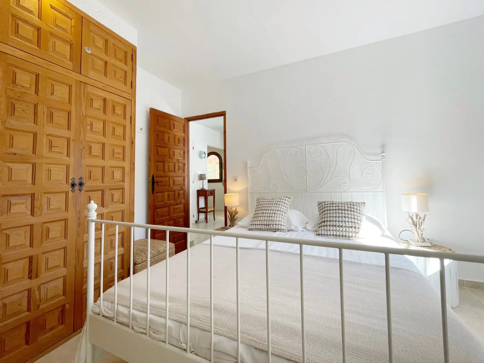 Via een karakteristieke houten poort betreden we het royale zwembadterras met een goed formaat zwembad. Hier vindt u ook een gezellige lounge hoek met een schaduwdoek zodat u zowel in de schaduw als in de zon in alle rust kunt vertoeven. Door de ligging geniet u volledige privacy rondom het zwembadterras. Bij het betreden van de gelijkvloerse, villa komen we in de woon-eetkamer uitgerust met een recent vervangen airconditioning en verwarming middels radiatoren in elke ruimte. Daarachter bevindt zich de open keuken, voorzien van alle benodigde apparatuur. Aan linkerzijde bevinden zich de twee slaapkamers die een moderne badkamer met douche, wastafel en toilet delen. De slaapkamers beschikken over karakteristieke elementen zoals de houten castellano deuren, inbouw kasten en houten luiken voor de ramen. Buiten bevindt zich nog een berging, een buitendouche en een houten pergola naast de keuken om heerlijk ‘s-morgens buiten te kunnen ontbijten of ‘s-avonds te kunnen dineren onder de sterrenhemel.