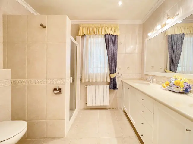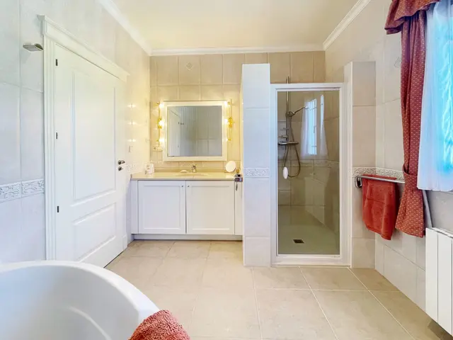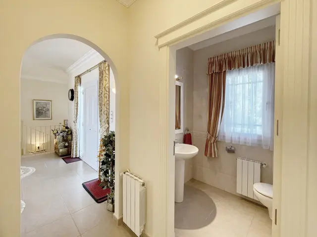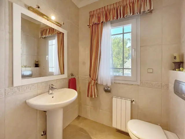 De villa is uitgerust met moderne voorzieningen zoals gascentrale verwarming, elektrische rolluiken, dubbele beglazing, een alarmsysteem, glasvezel-internet en een ruime garage met extra parkeerplaatsen op het terrein.