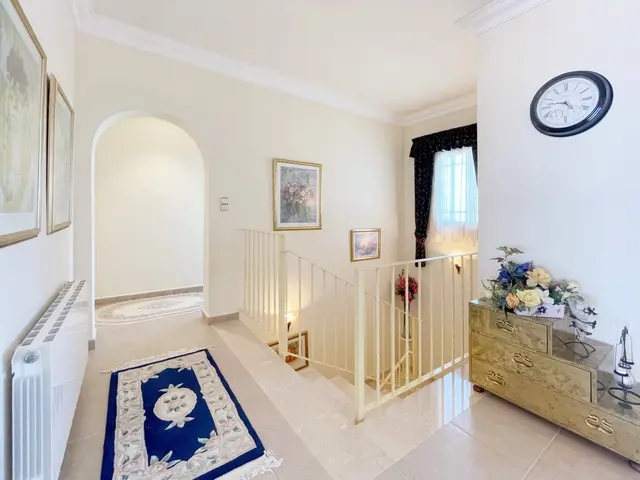 Vanuit de hal komt u in een lichte woon-eetkamer met een gezellige gashaard, die uitkomt op een spectaculaire naya met een glazen schuifwand. Een bijzonder voordeel is dat de gehele begane grond gelijkvloers is met de naya, de buitenterrassen en het ruime zwembad, wat zorgt voor een perfecte verbinding tussen binnen en buiten. Op deze verdieping bevinden zich een grote keuken met geïntegreerde eethoek, een ruime garage met directe toegang tot de wasruimte, drie comfortabele slaapkamers, twee badkamers (waarvan een en-suite) en een gastentoilet.