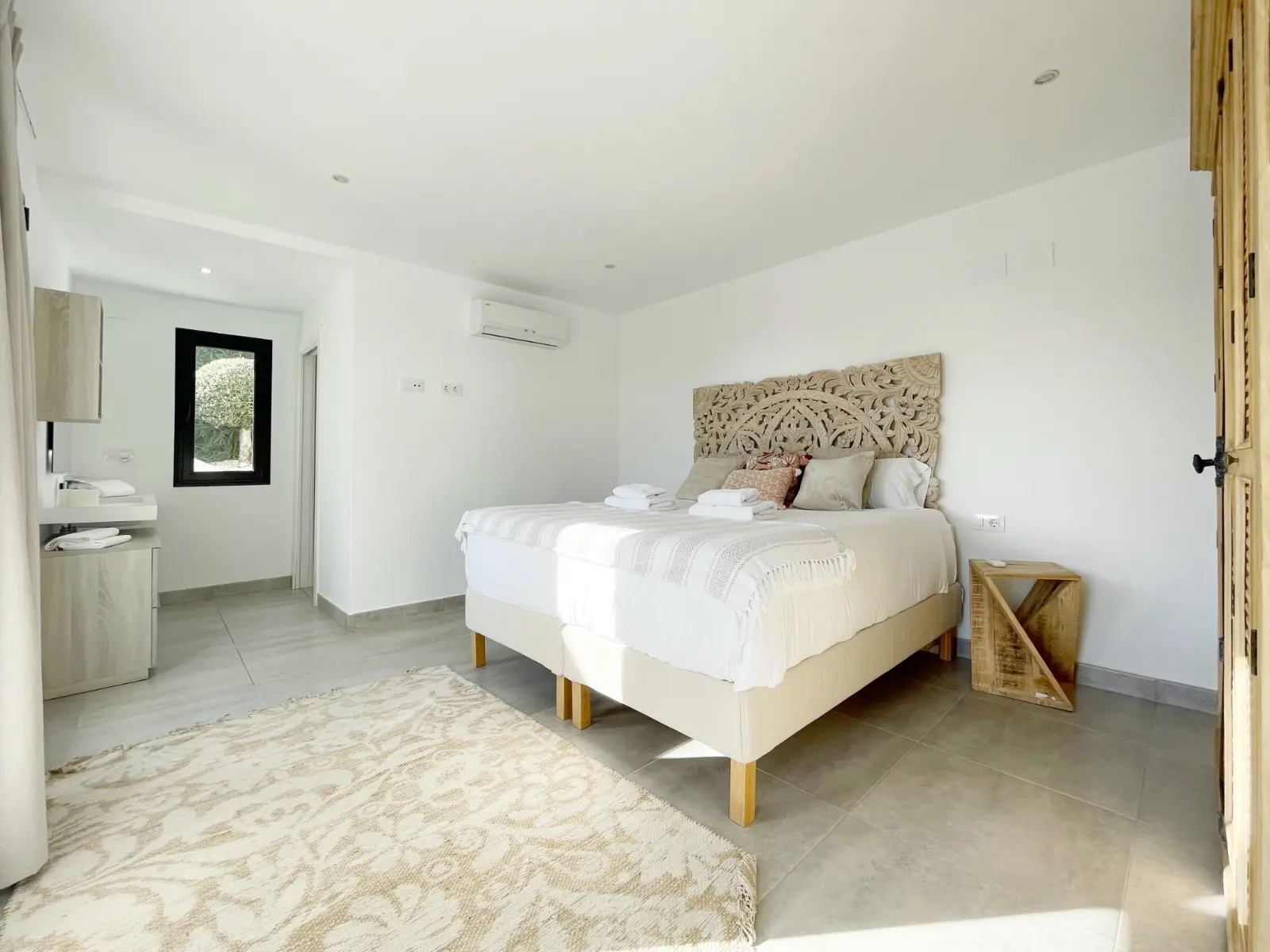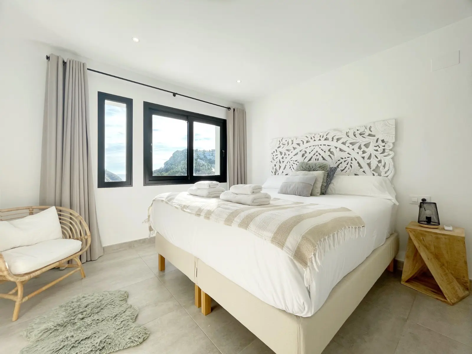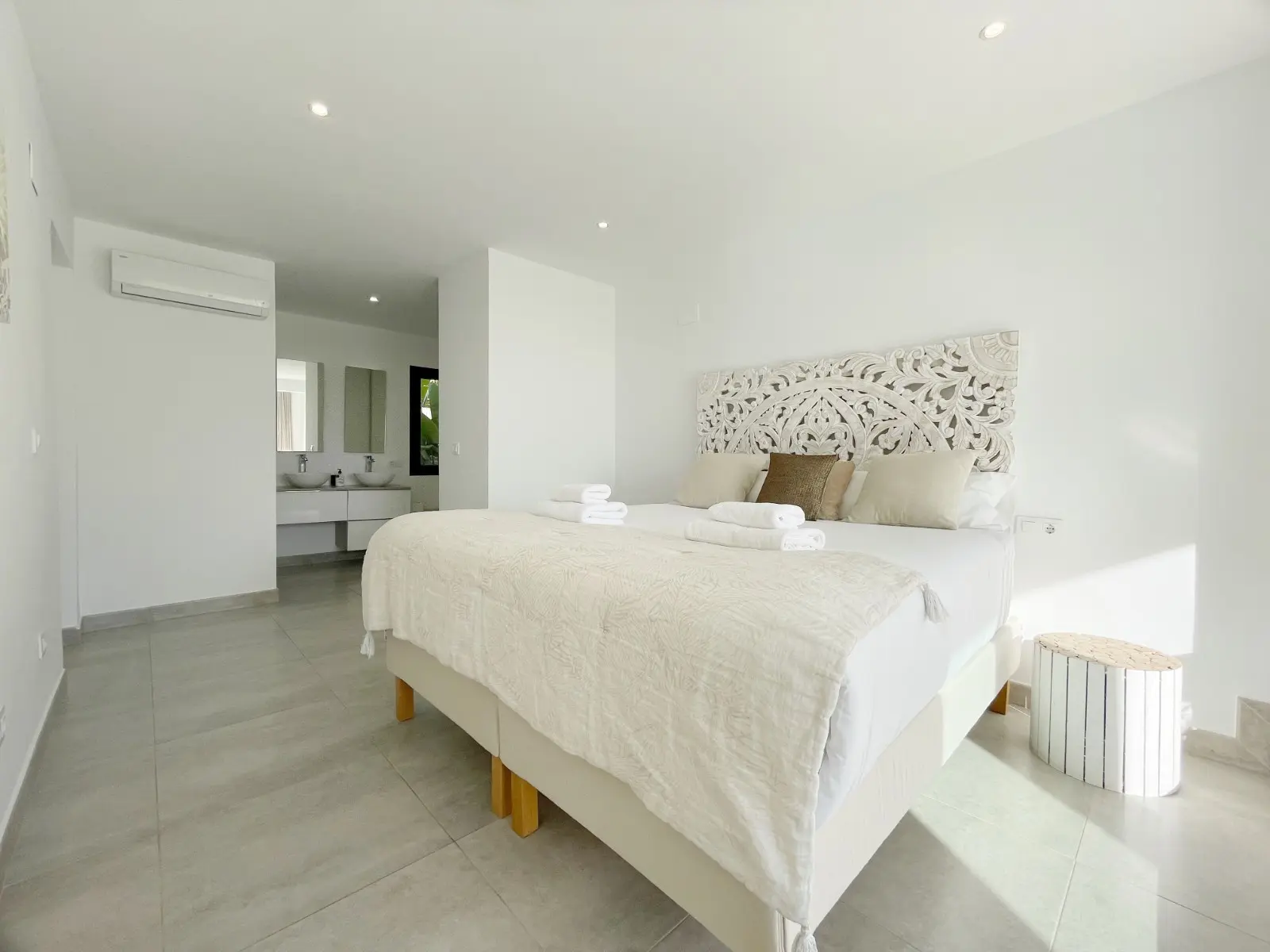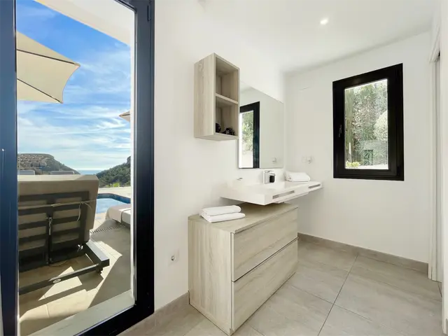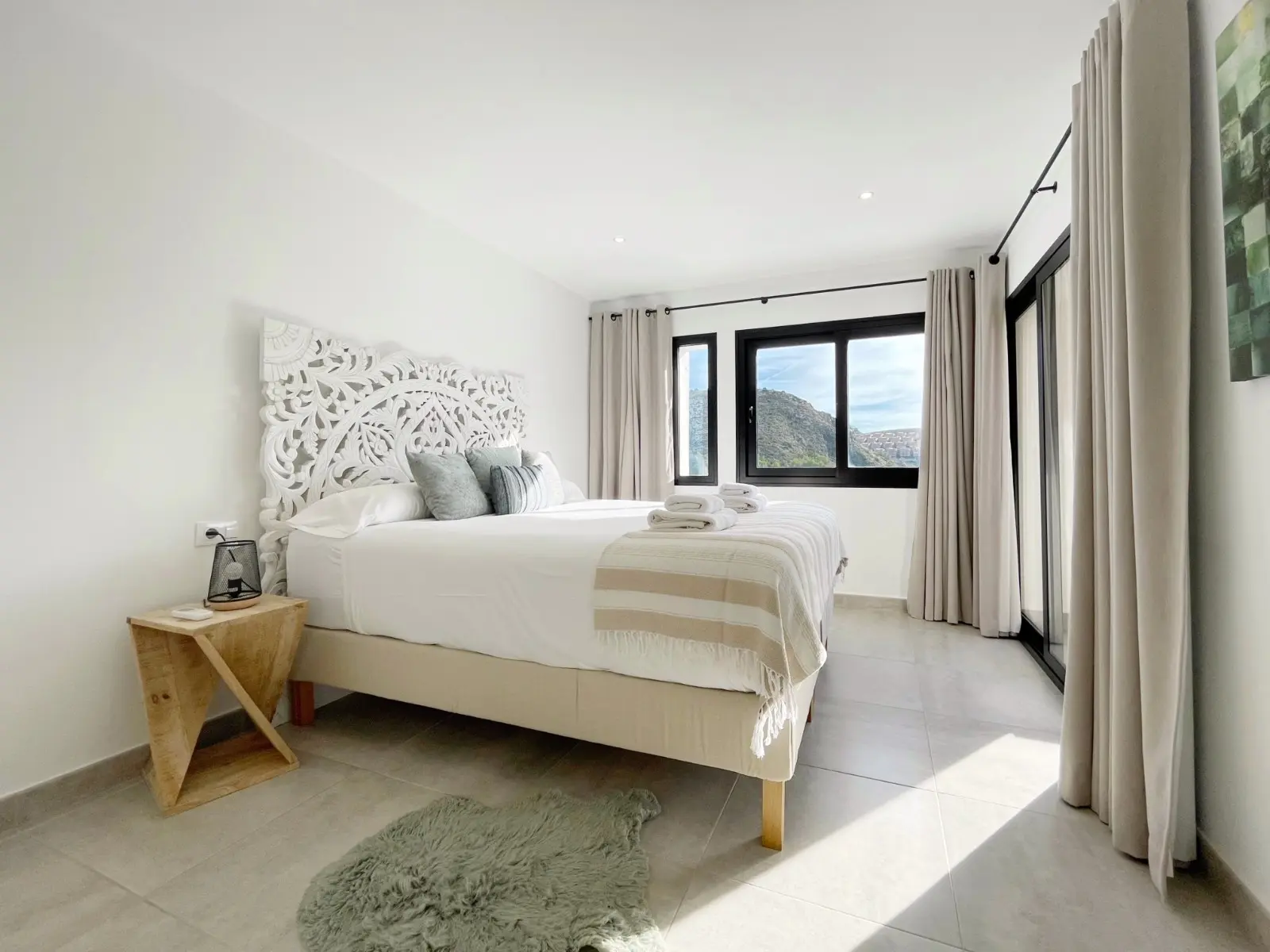 Op de bovenverdieping bevindt zich een royale master slaapkamer met en-suite badkamer en directe toegang tot een privé terras met prachtig uitzicht over zee en de groene omgeving. Daarnaast zijn er op deze verdieping nog twee tweepersoonsslaapkamers die een ruime badkamer delen, waarvan één eveneens toegang heeft tot een eigen terras. Vanuit alle slaapkamers geniet je van een schitterend zee- en vallei-uitzicht.
