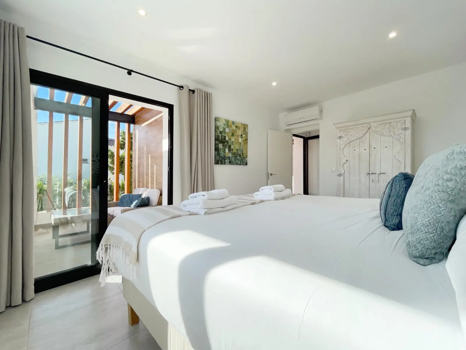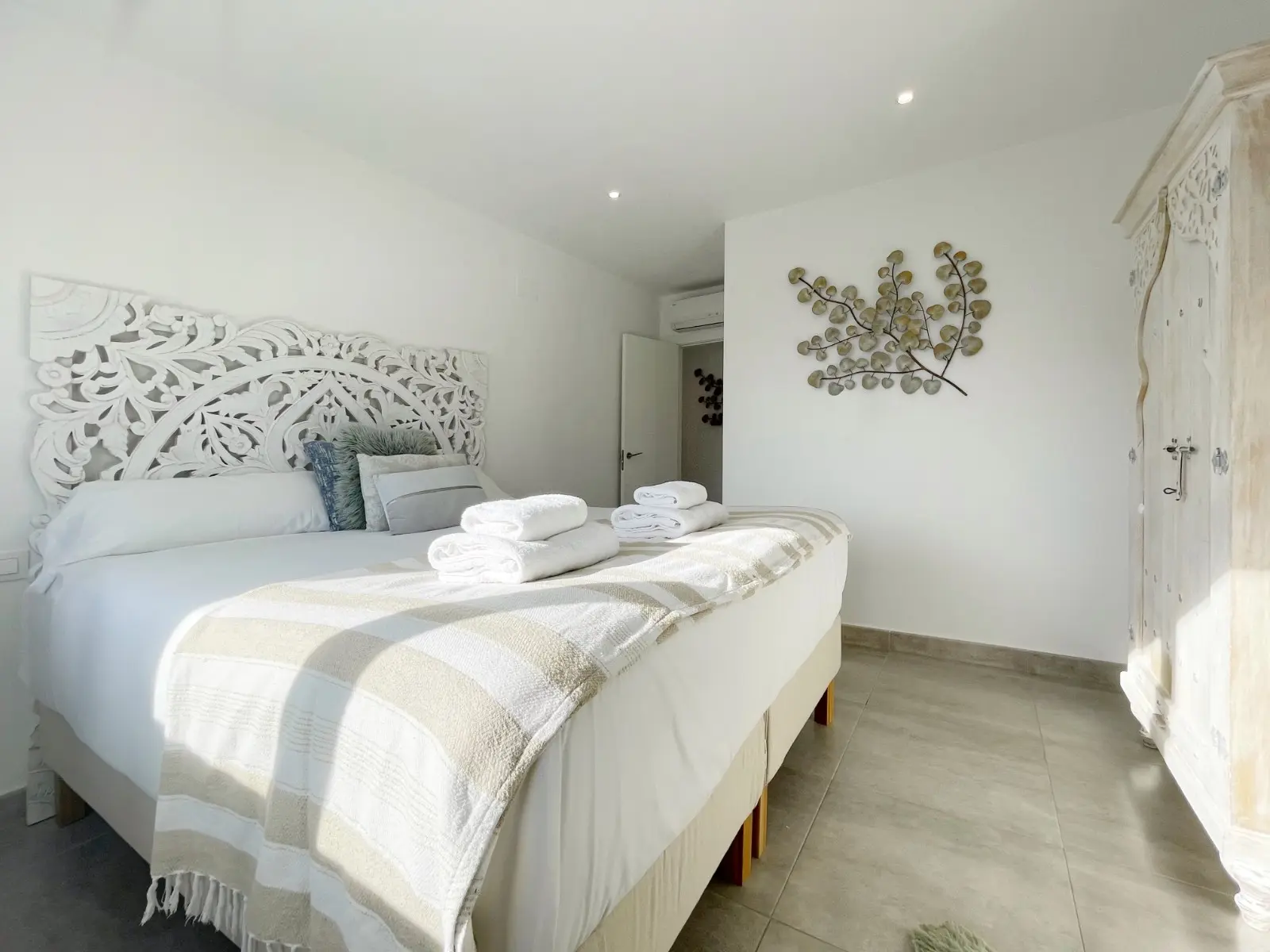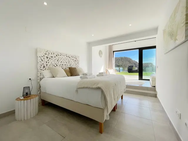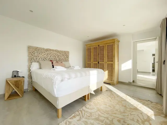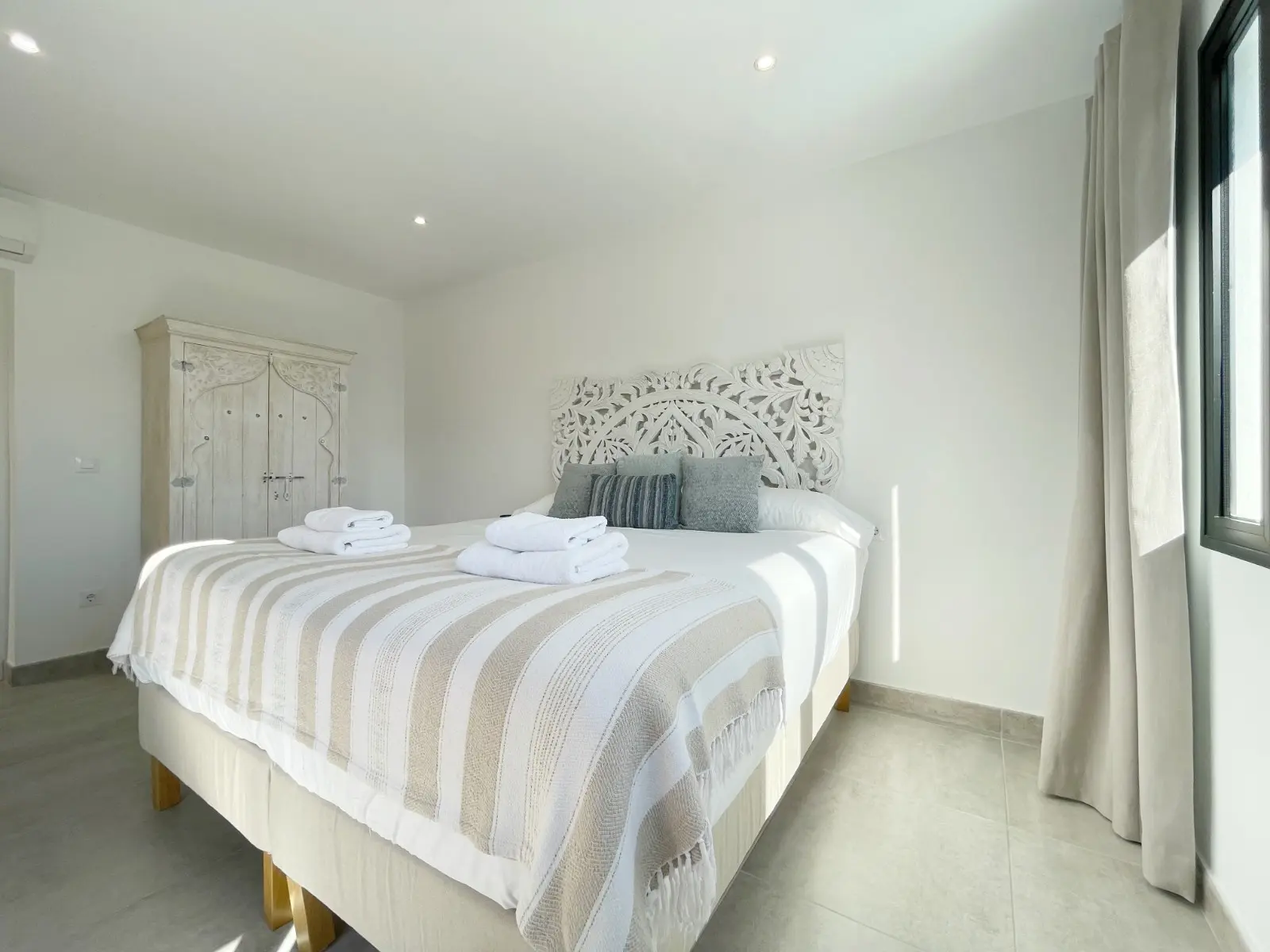 Op de bovenverdieping bevindt zich een royale master slaapkamer met en-suite badkamer en directe toegang tot een privé terras met prachtig uitzicht over zee en de groene omgeving. Daarnaast zijn er op deze verdieping nog twee tweepersoonsslaapkamers die een ruime badkamer delen, waarvan één eveneens toegang heeft tot een eigen terras. Vanuit alle slaapkamers geniet je van een schitterend zee- en vallei-uitzicht.
